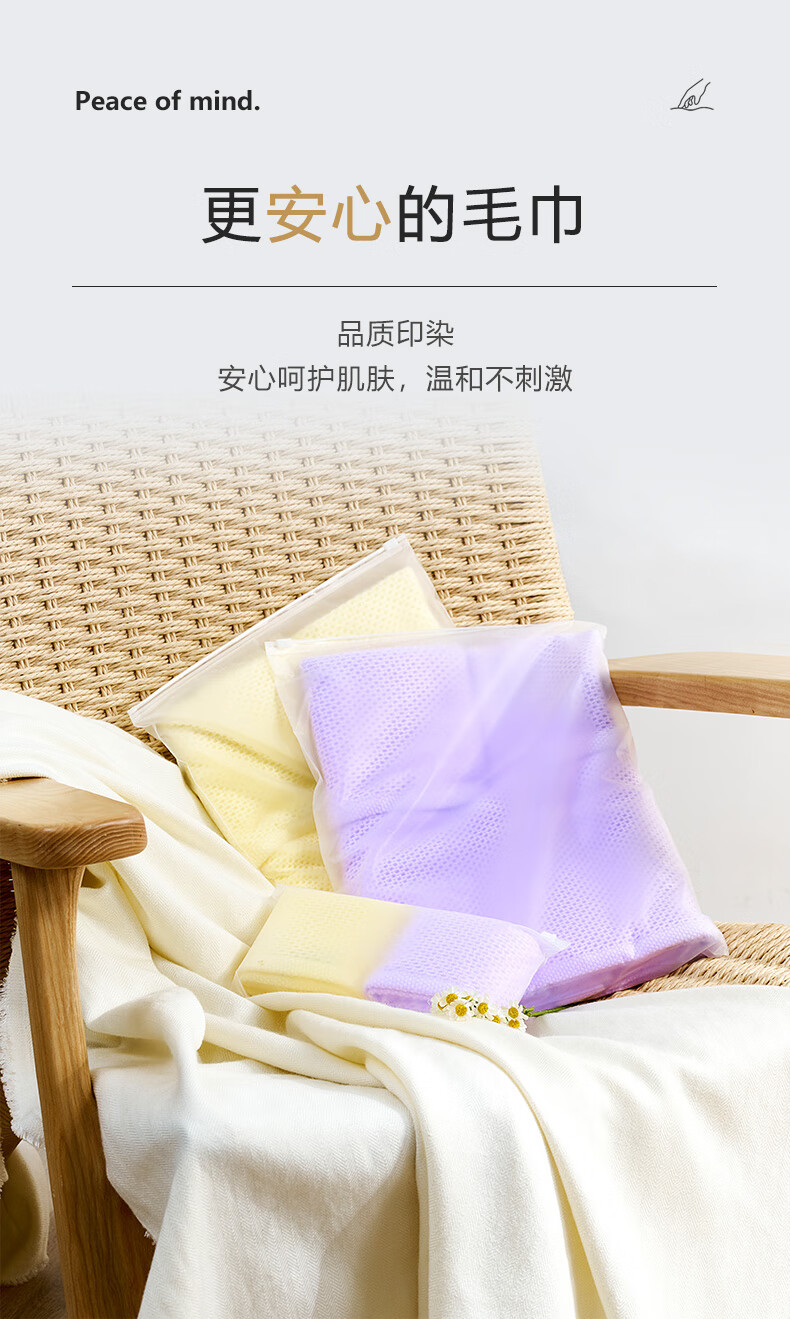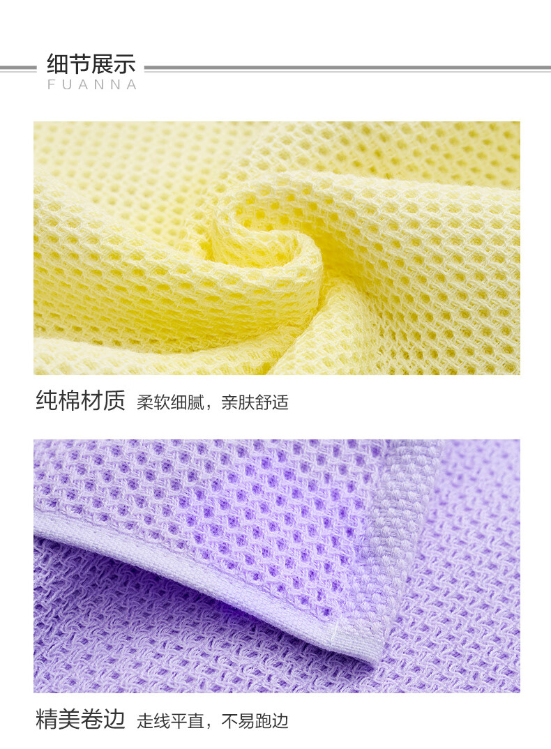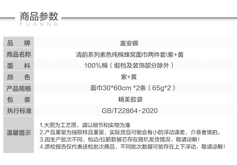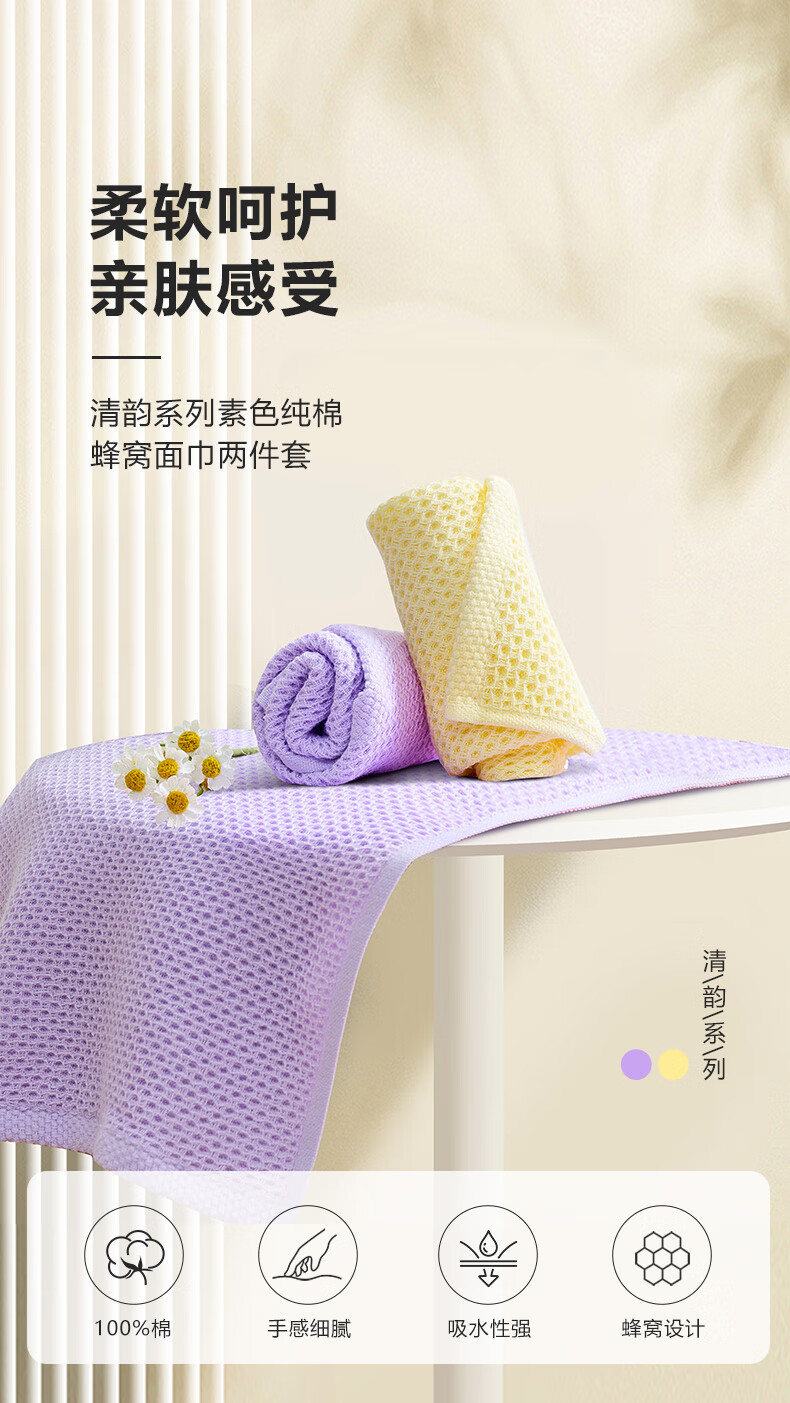 富安娜清韵系列素色纯棉蜂窝面巾两件套\紫+黄30*60cm