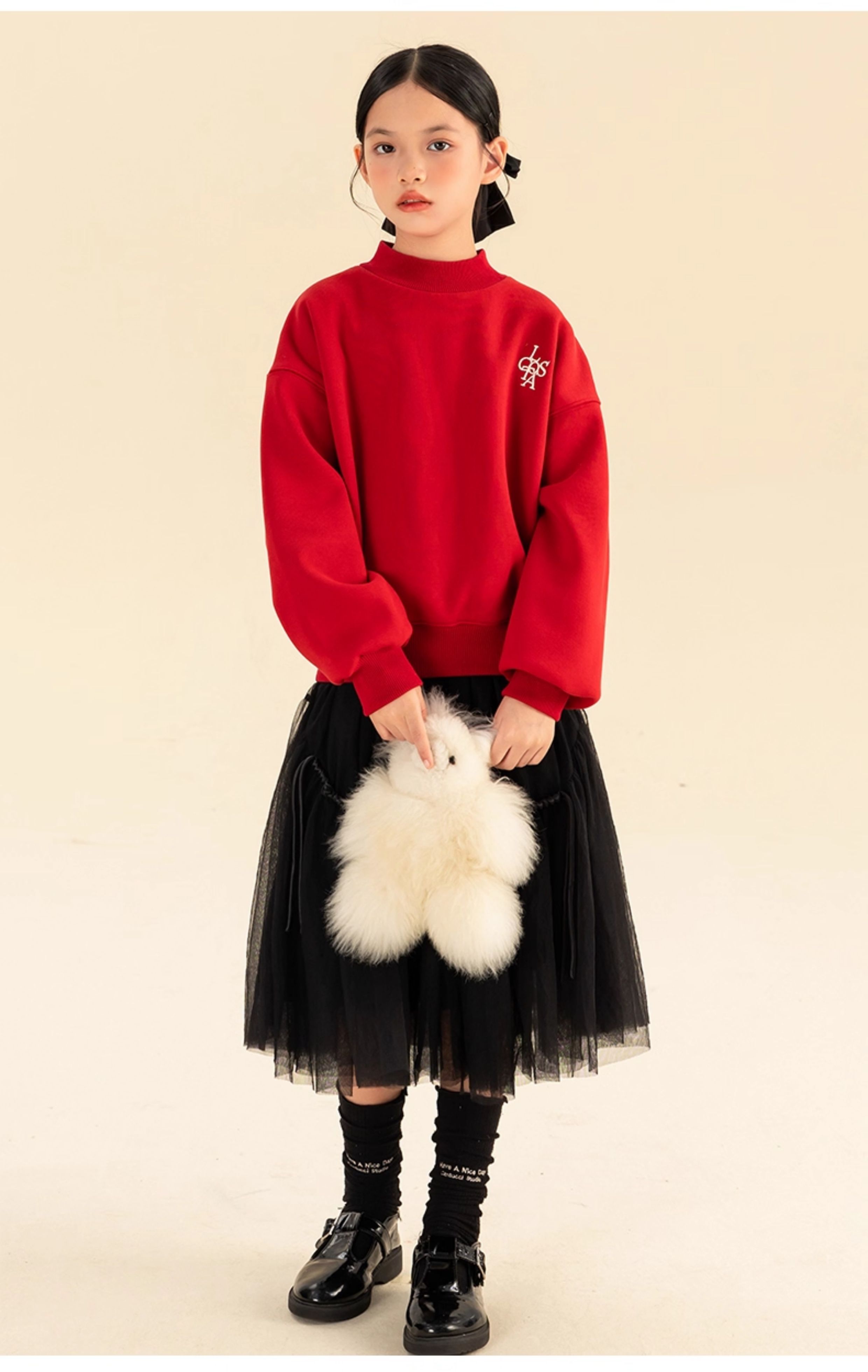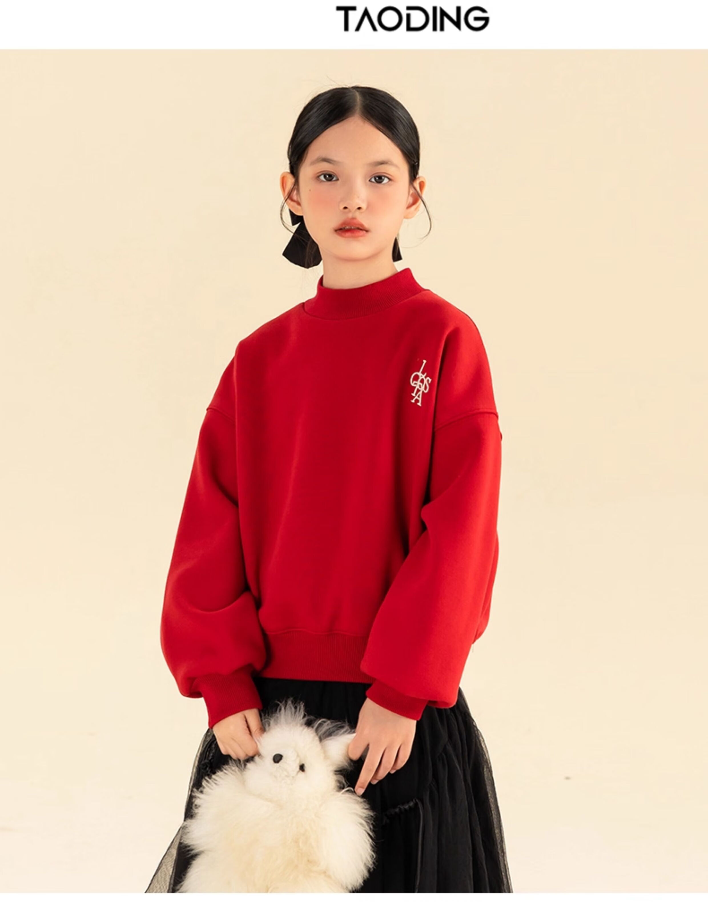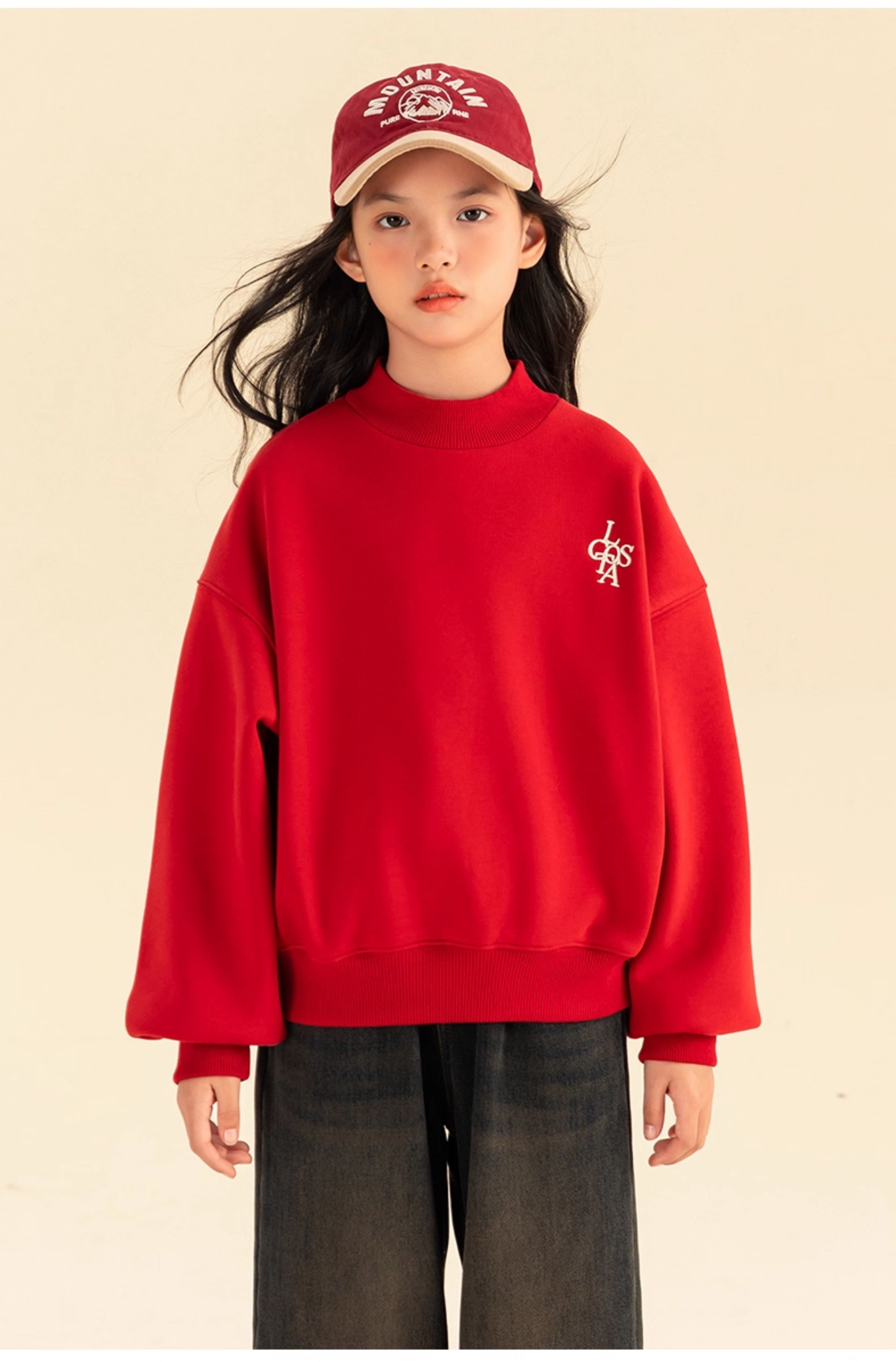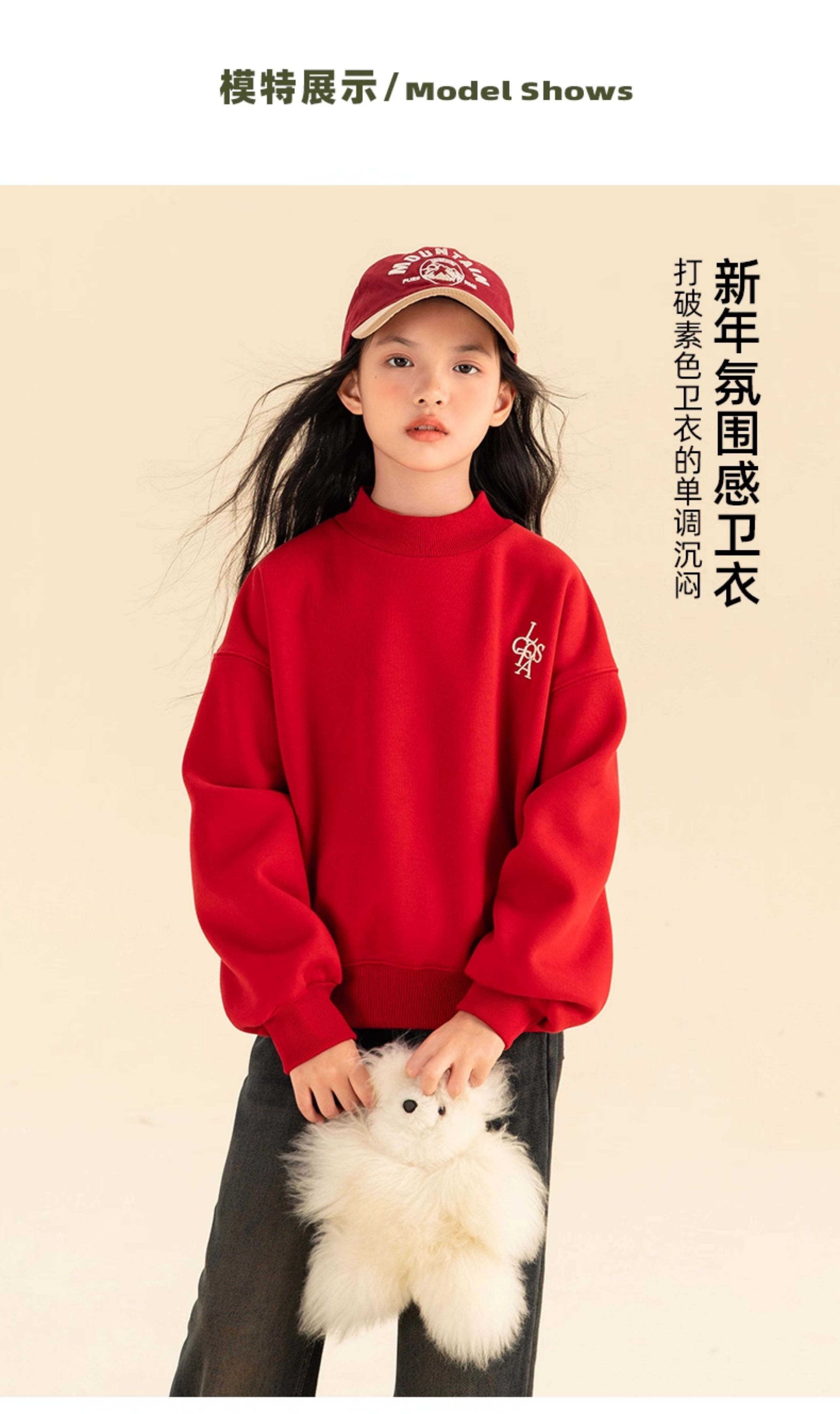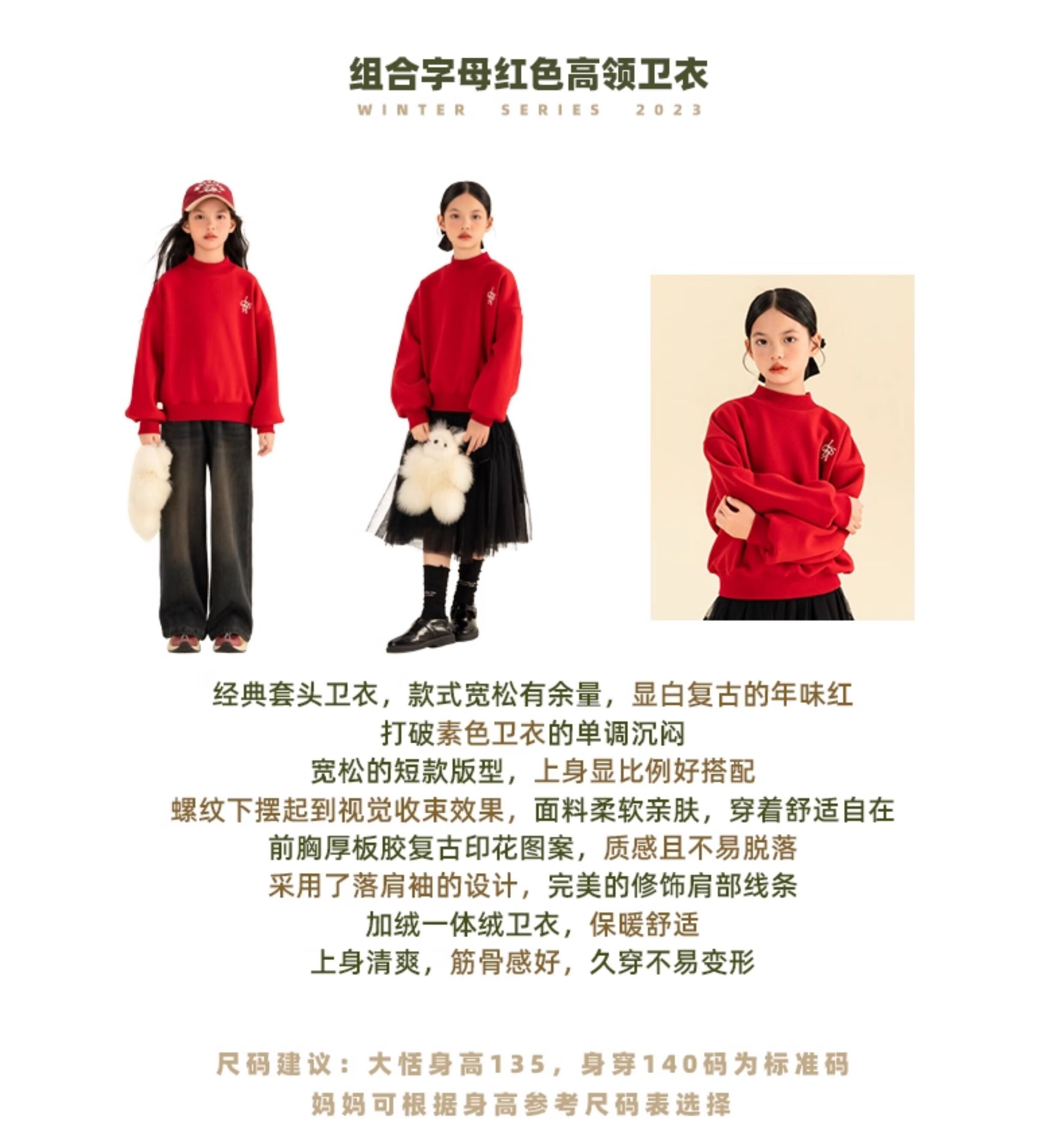 淘町女童卫衣一体绒秋冬新款中大童休闲百搭字母红色加绒高领打底 中国红 110