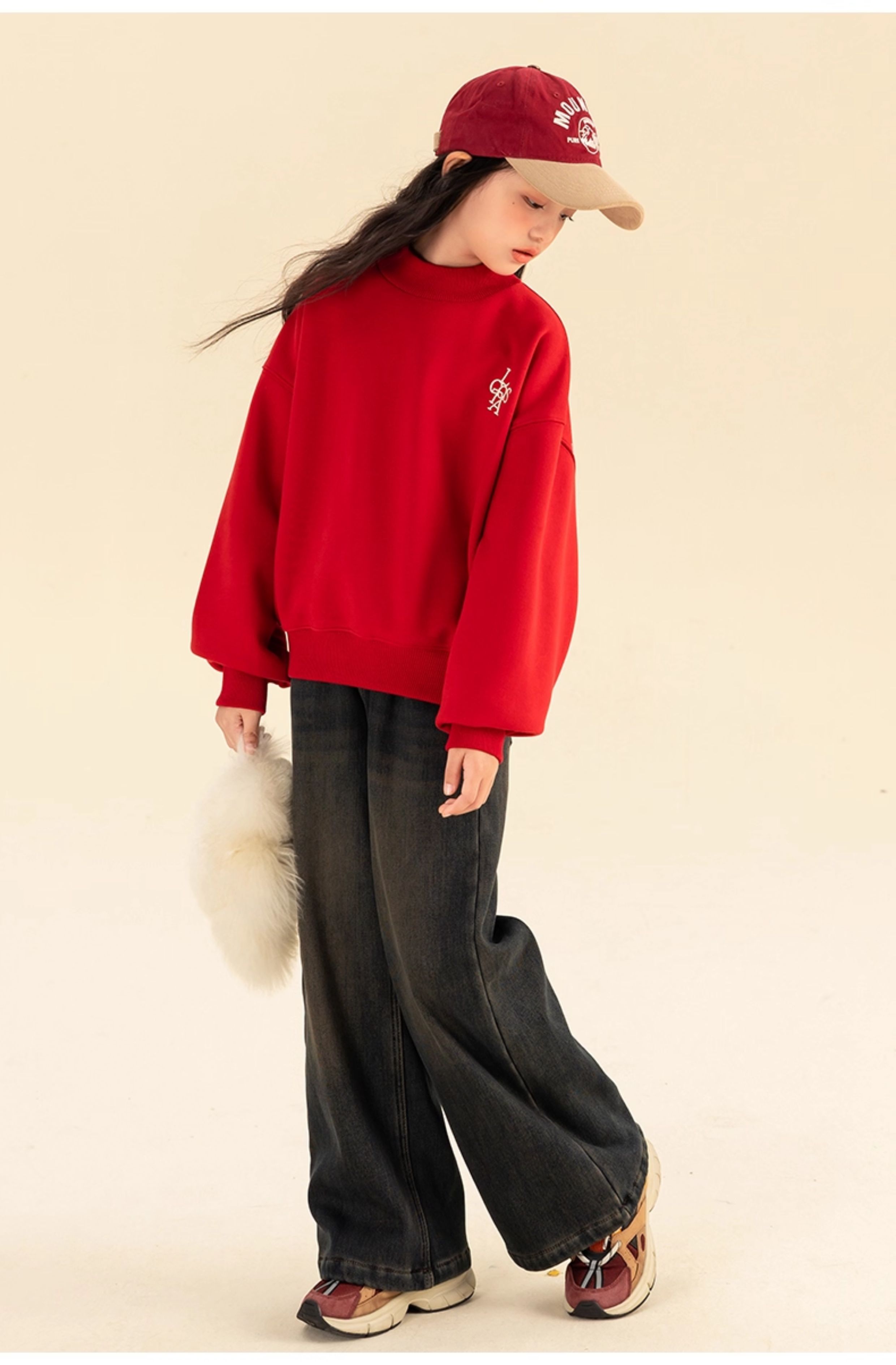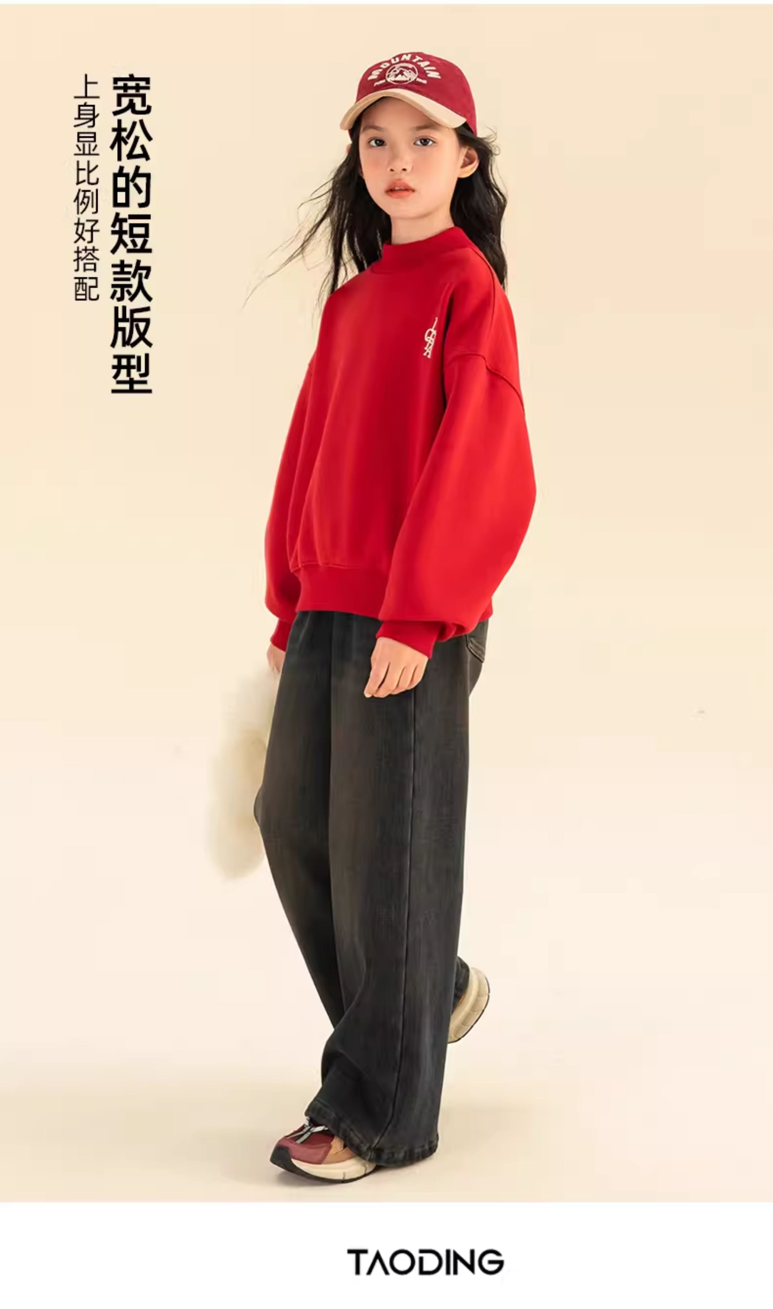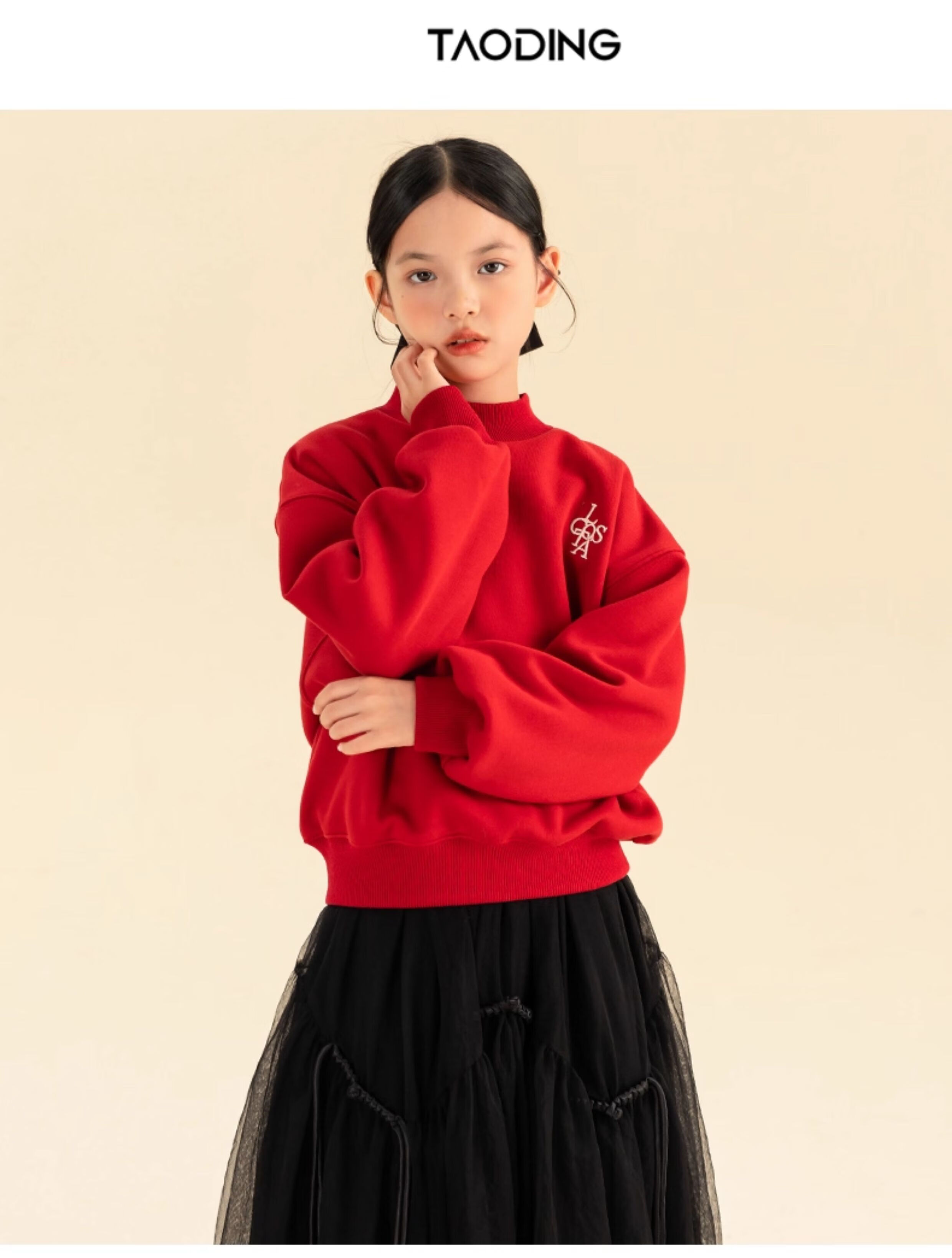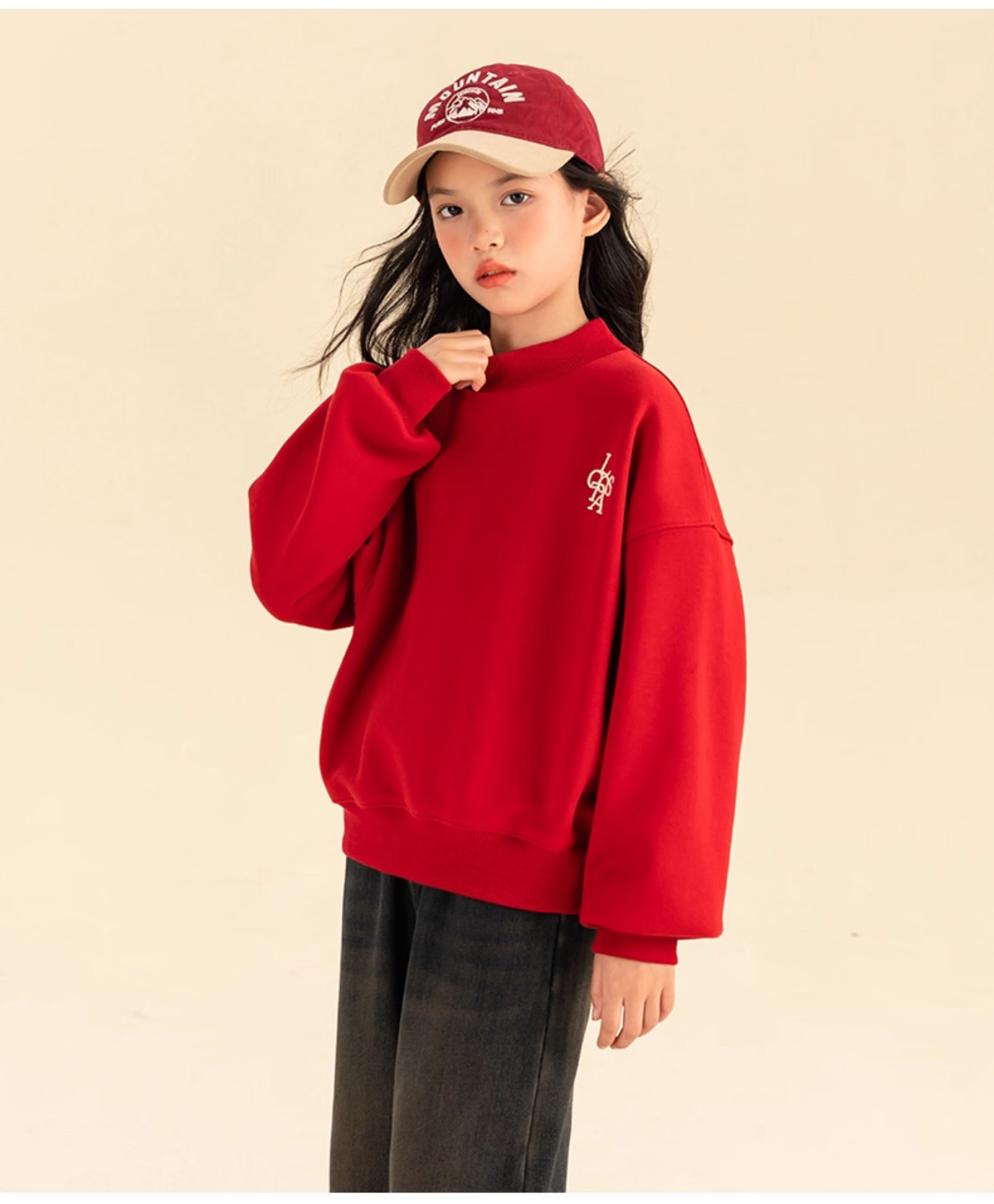 淘町女童卫衣一体绒秋冬新款中大童休闲百搭字母红色加绒高领打底 中国红 110