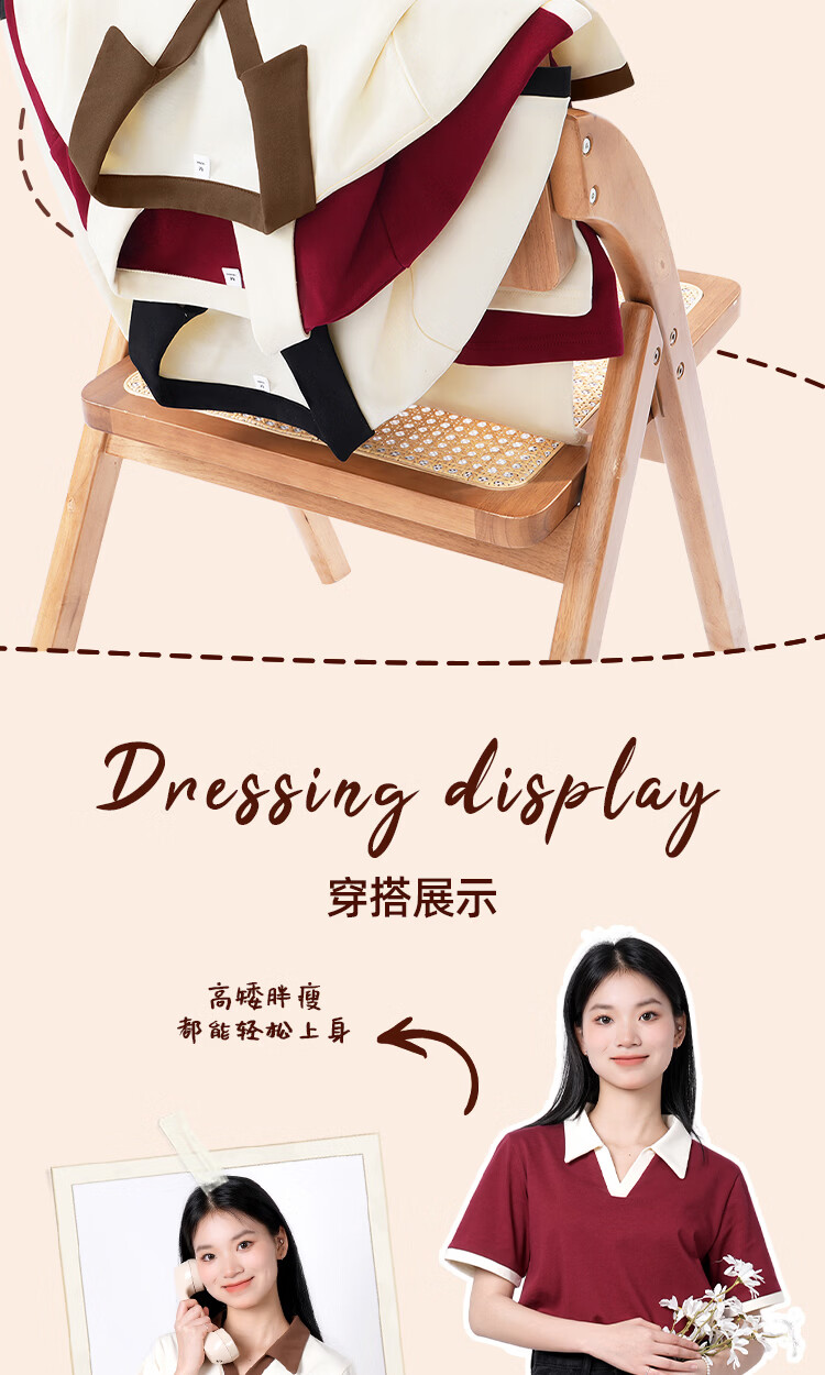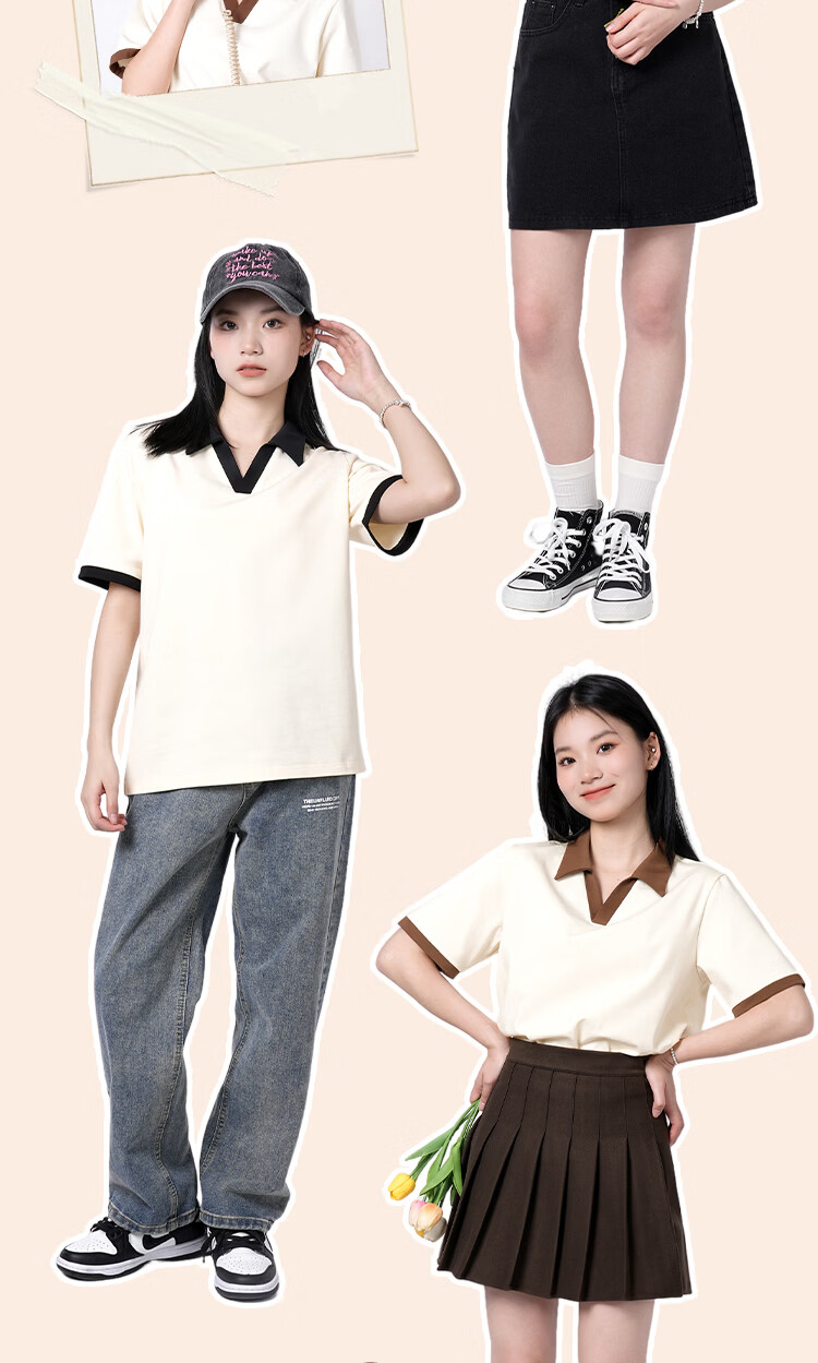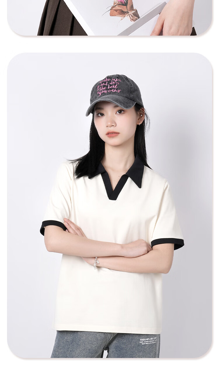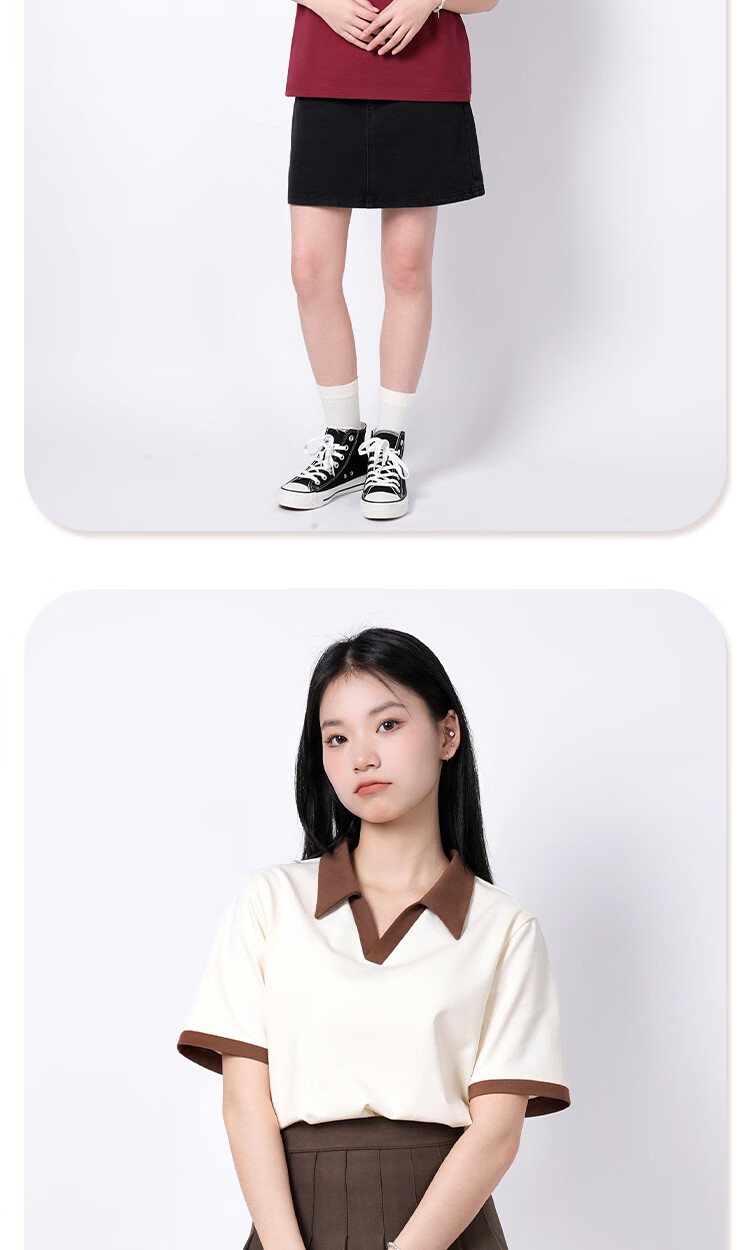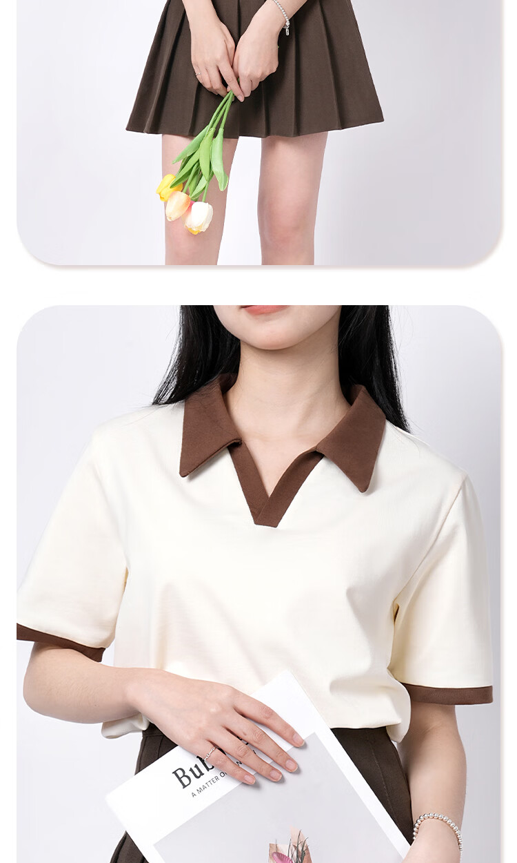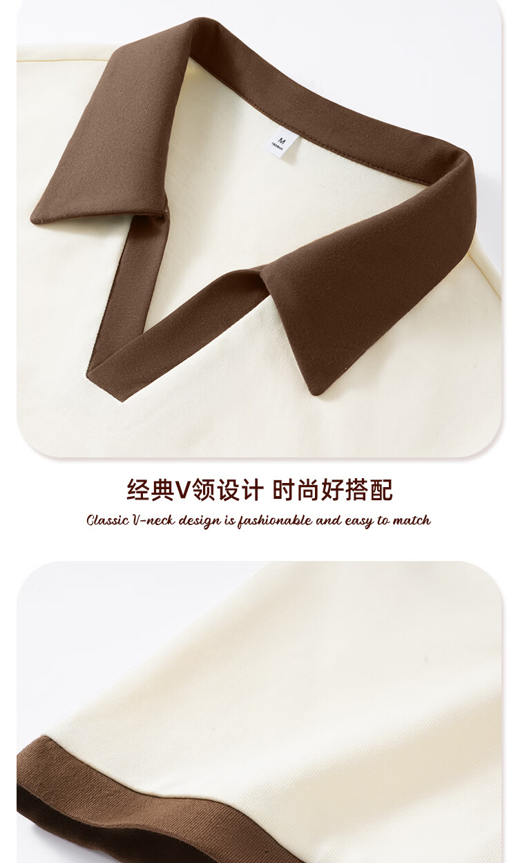 真维斯(Jeanswest)polo领短袖女士撞色t恤春夏季2026新款爆款正肩纯棉体恤V领上衣服 米撞棕 叠叠小狗_K S