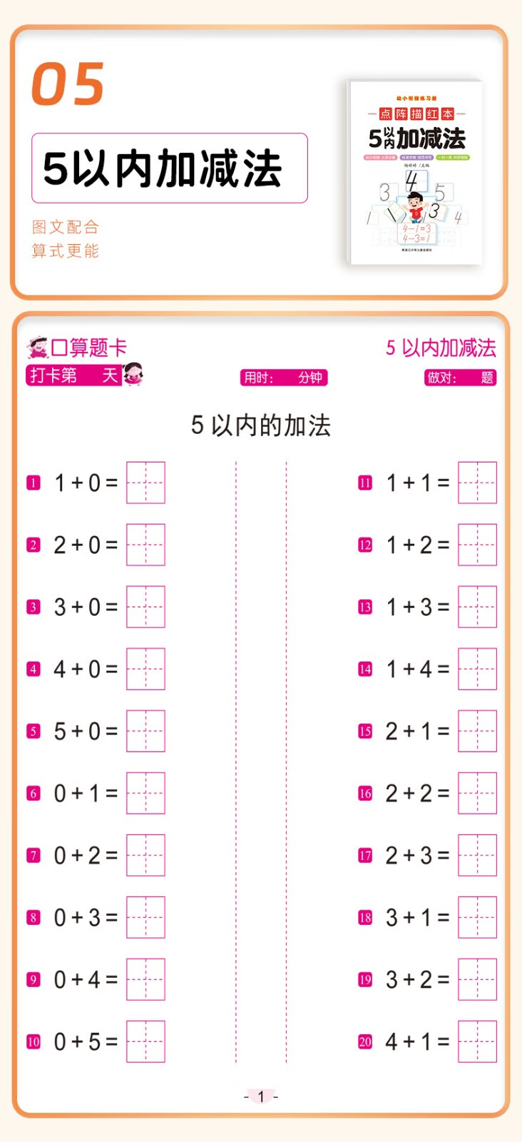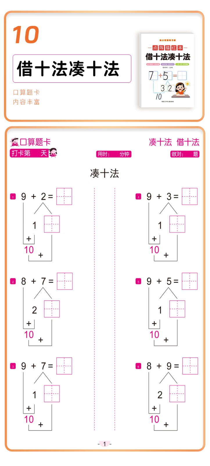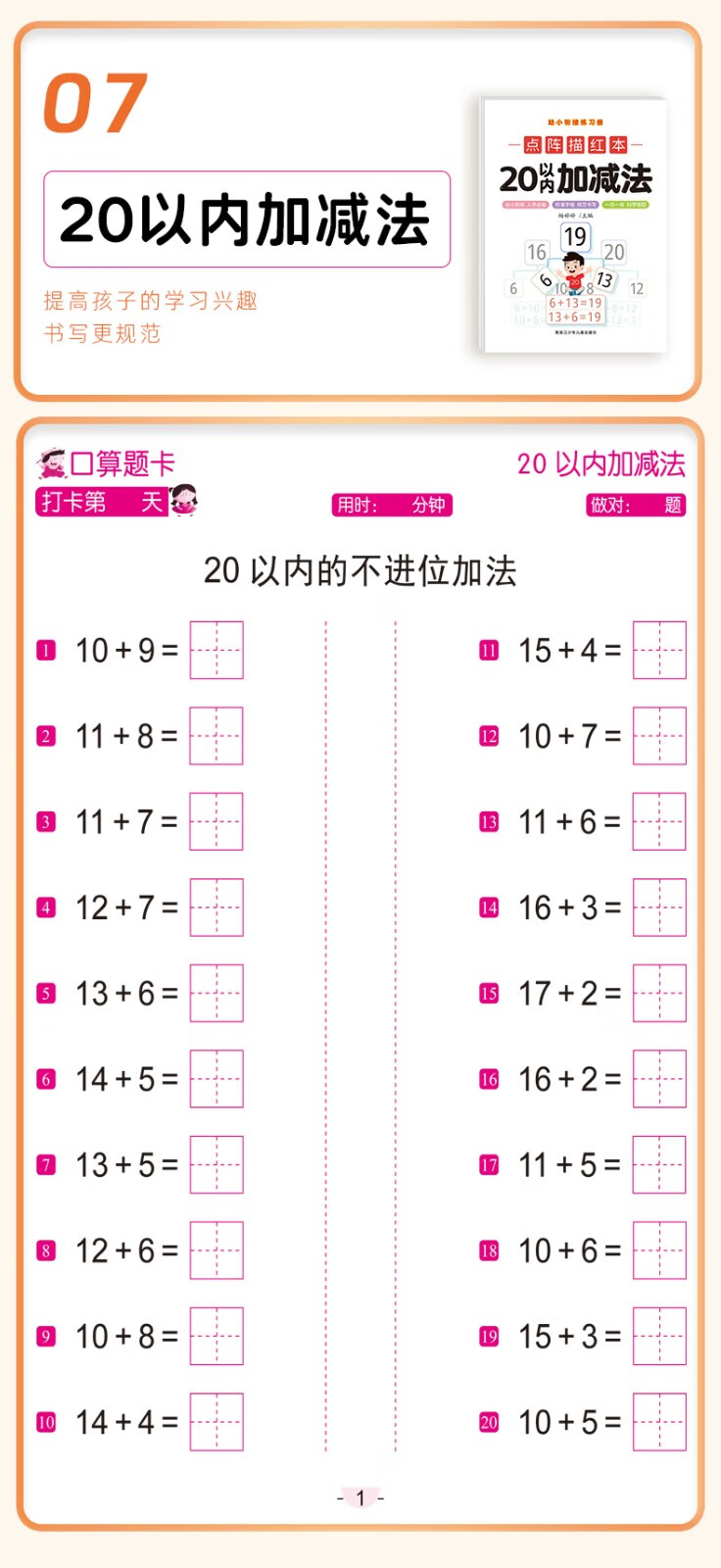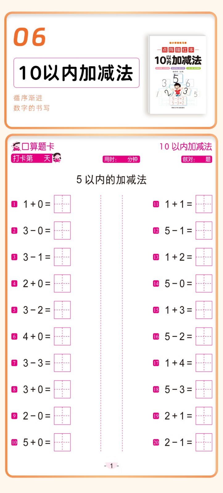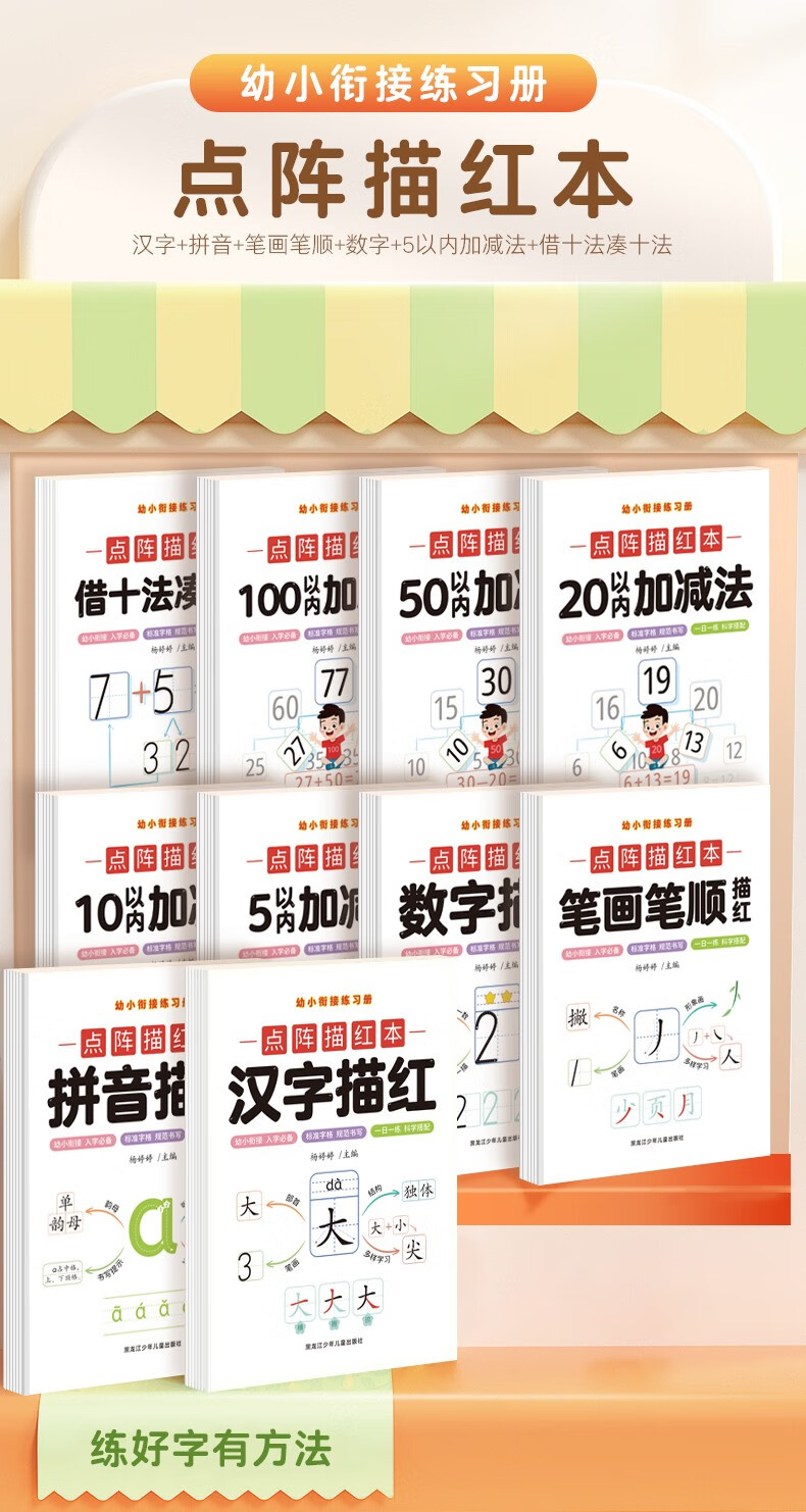 幼小衔接描红天天练借十法凑十法10以内20以内加减法幼儿园点阵描红本拼音汉字笔画数字描红临摹写字 幼小衔接天天练【全8册】62页/本