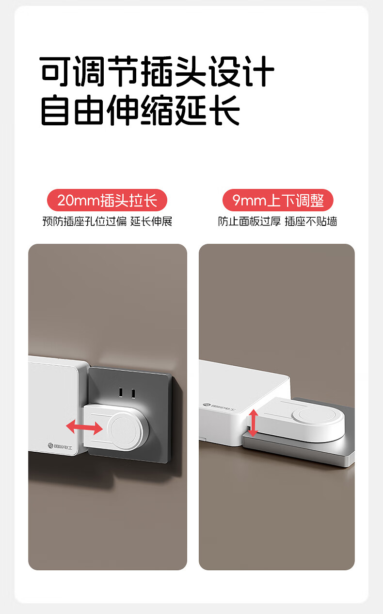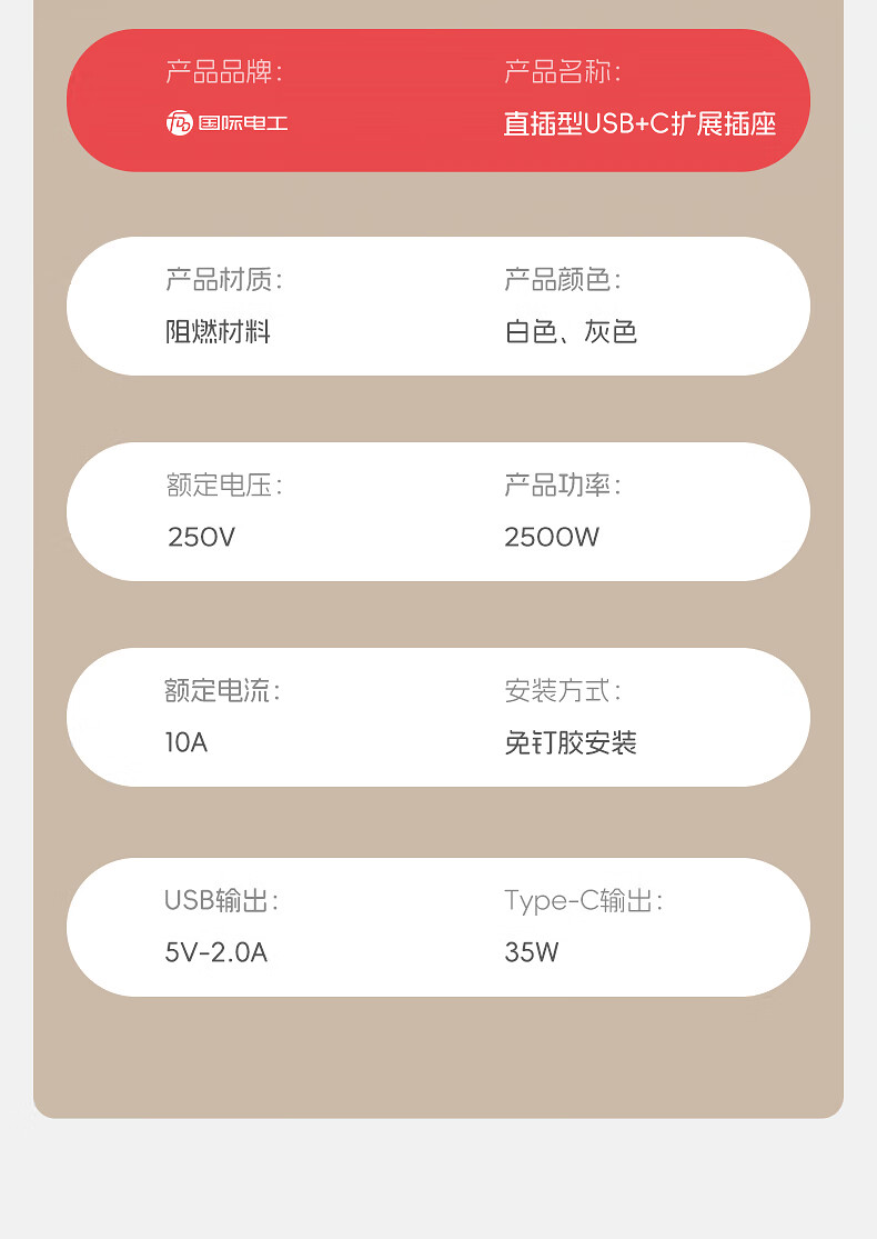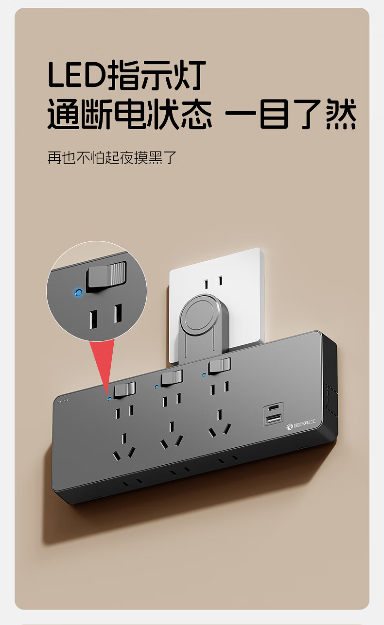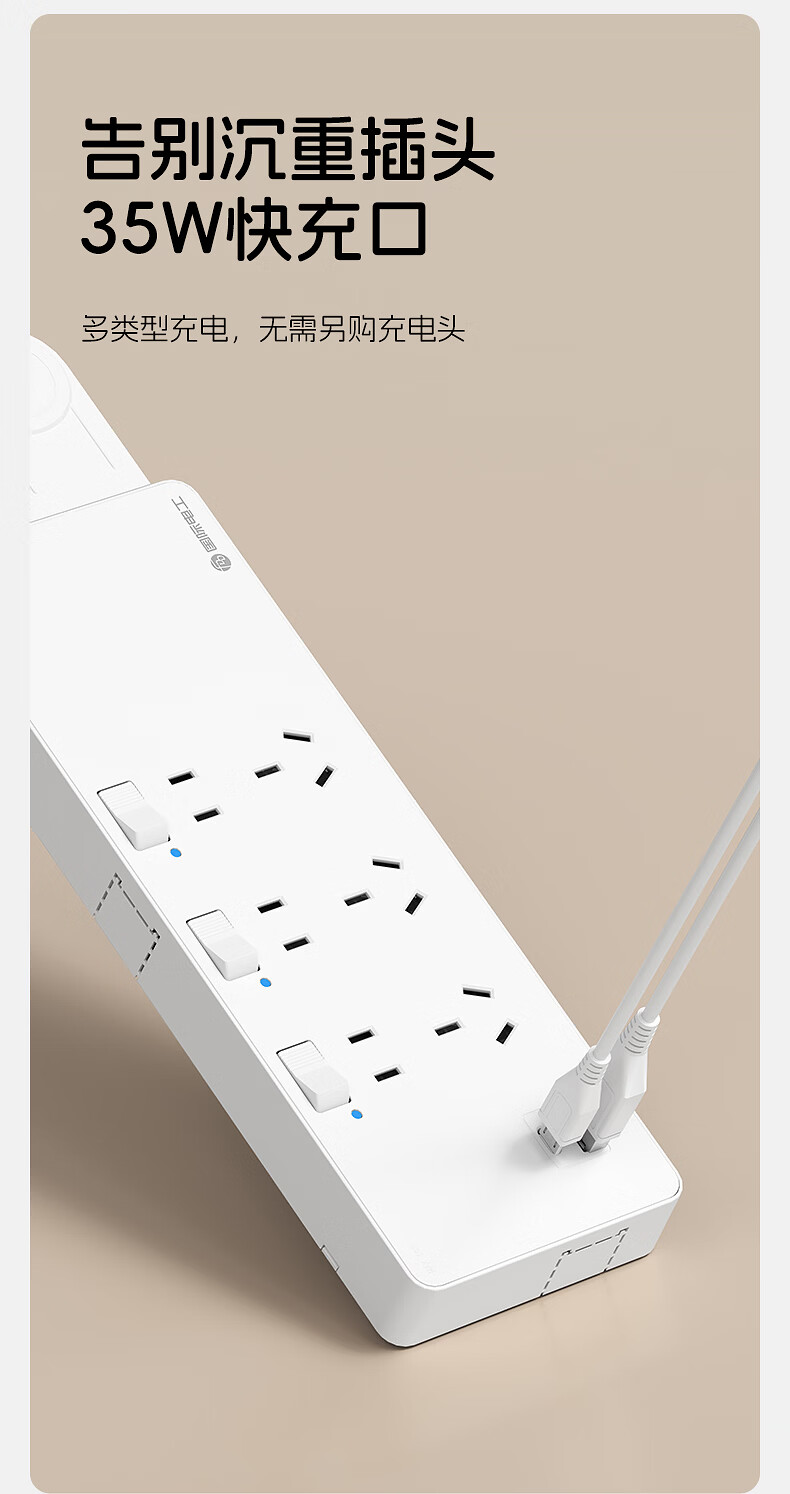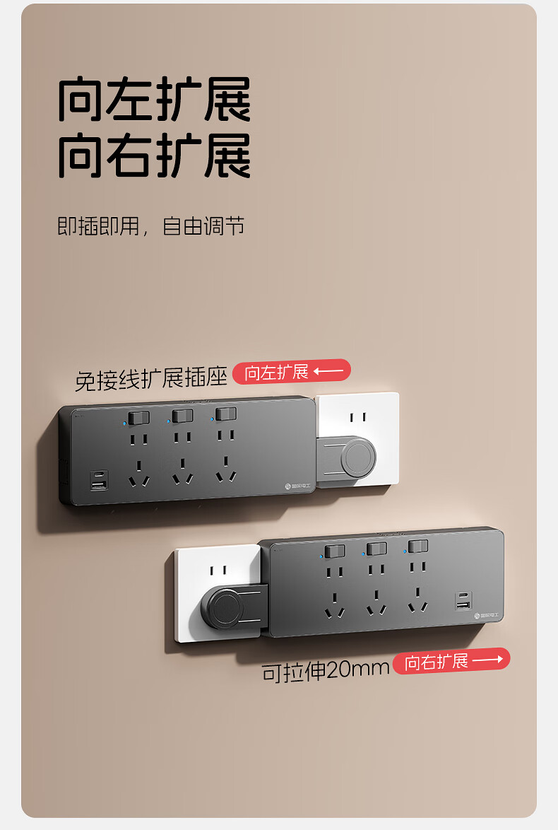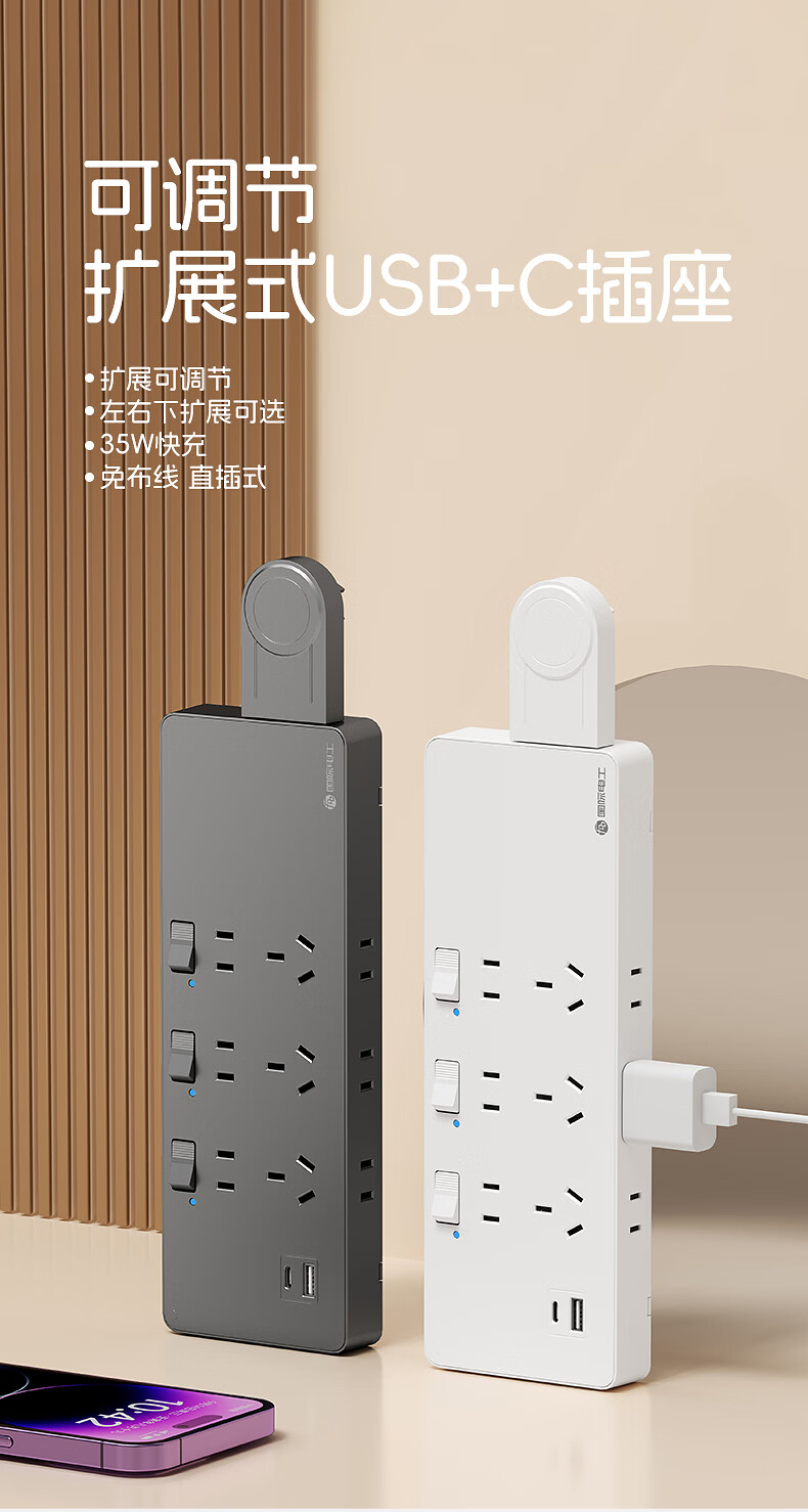 国际电工一转多扩展插座免接线多功能35W快充排插可调节转换器插板USB+C 灰色【向右扩展】35W快充USB+C-三位三开2孔