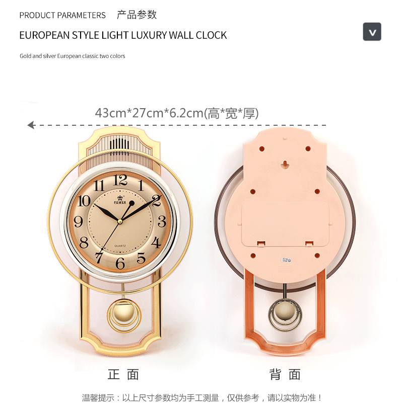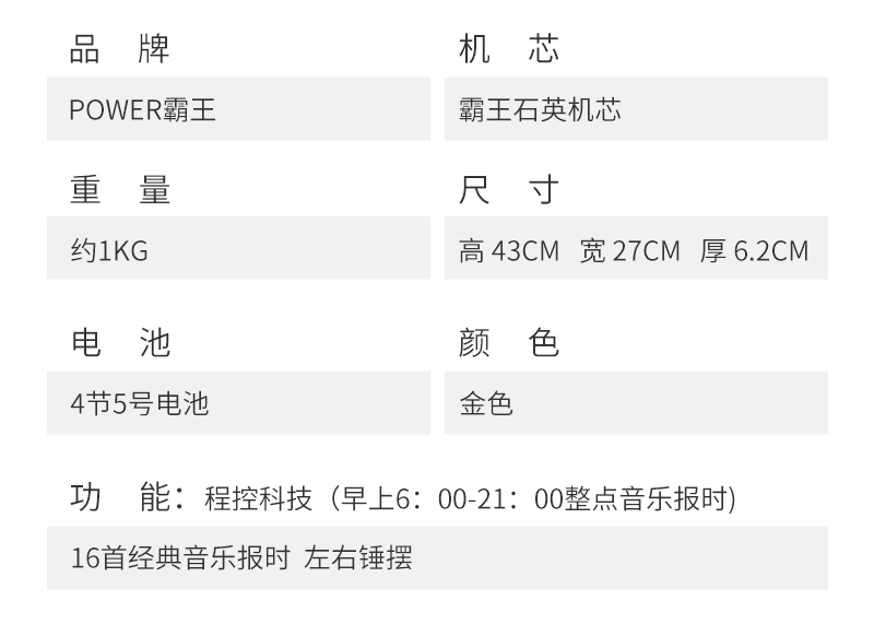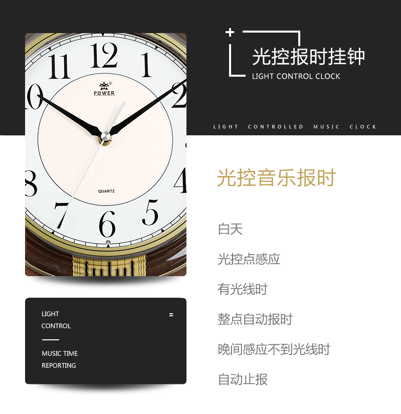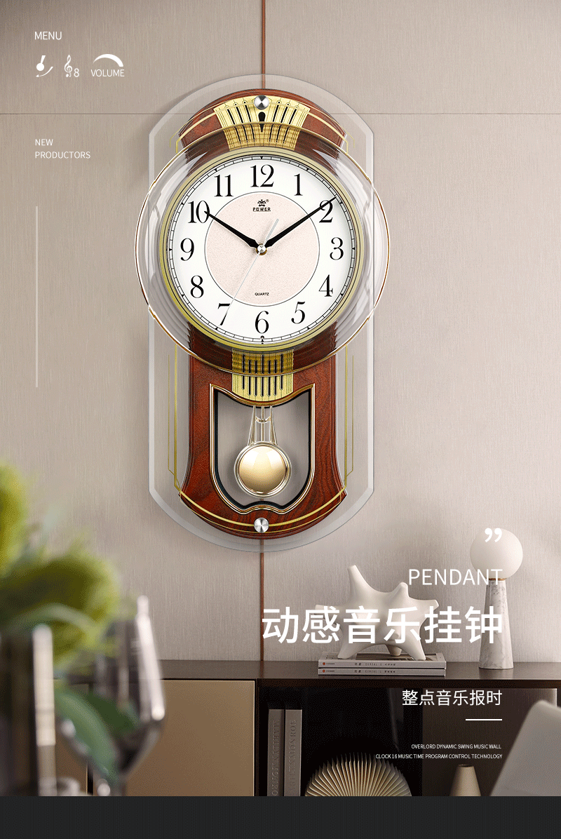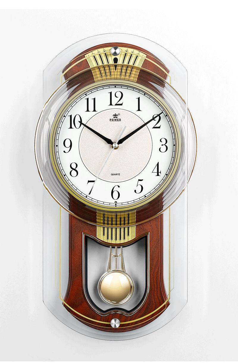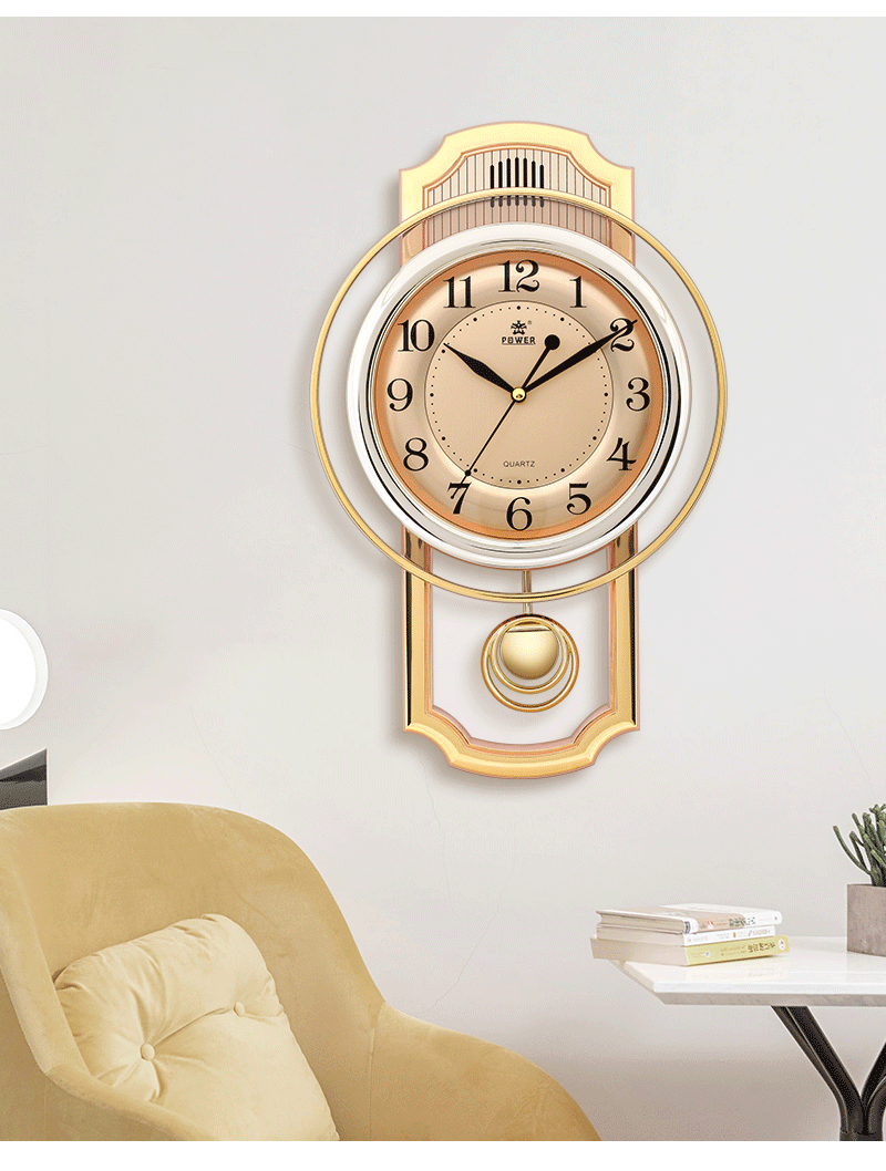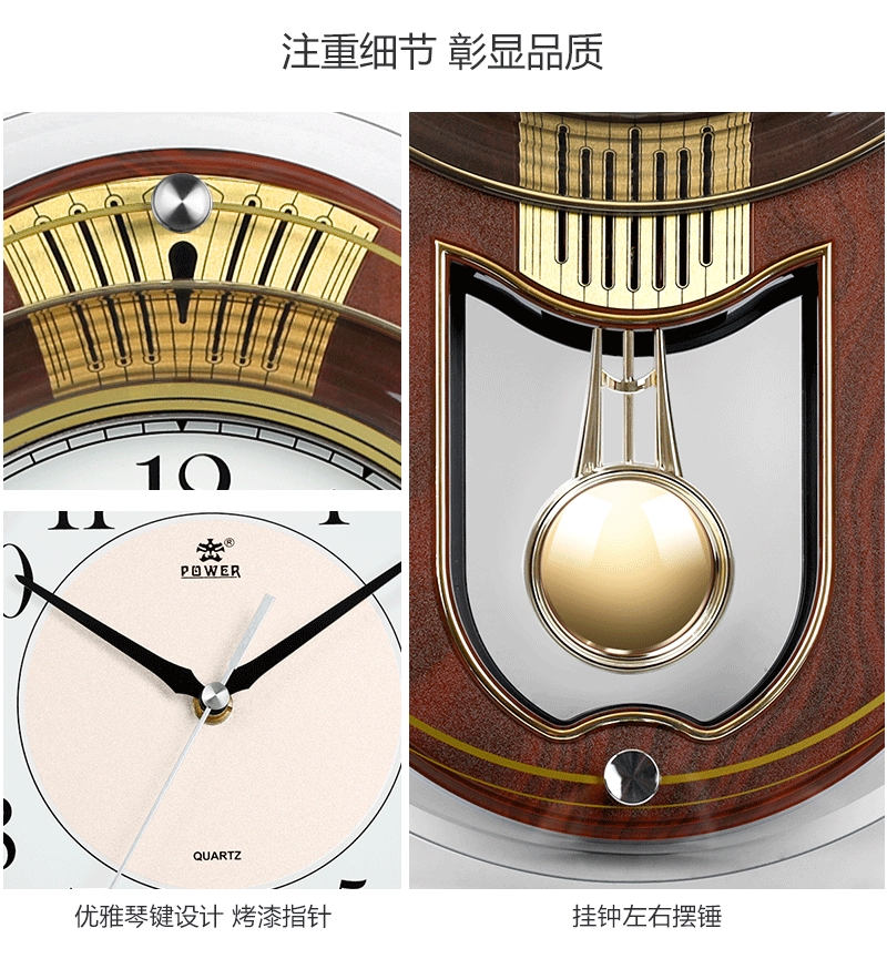 POWER霸王钟表客厅时钟整点音乐报时挂钟轻奢长43cm石英钟 6173APMKS