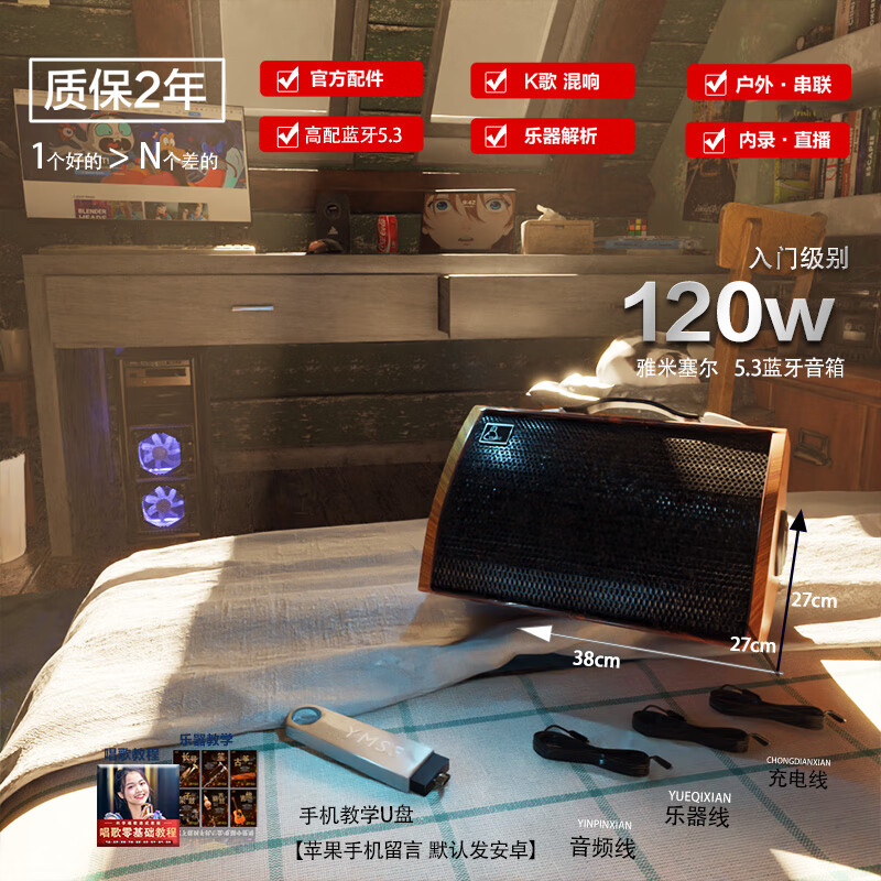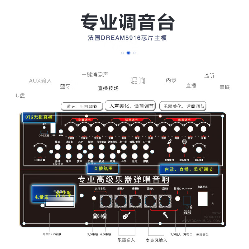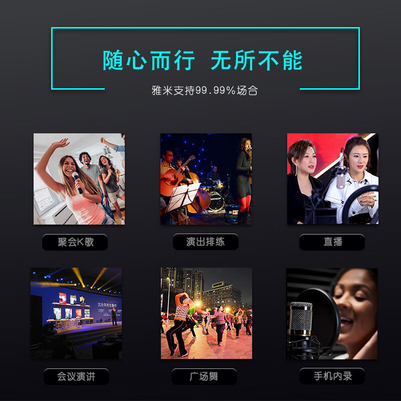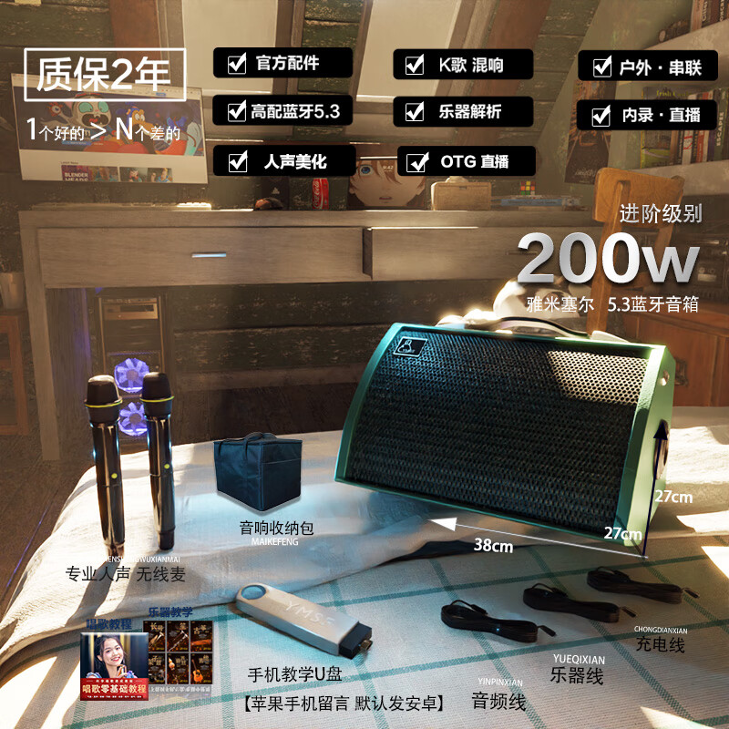 雅米塞尔新款大功率户外K歌音响乐器吉他电吹管弹唱便携式蓝牙音箱内录直播专用 200瓦户外室内通用+2U段麦+U盘