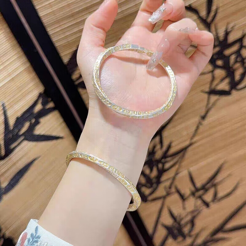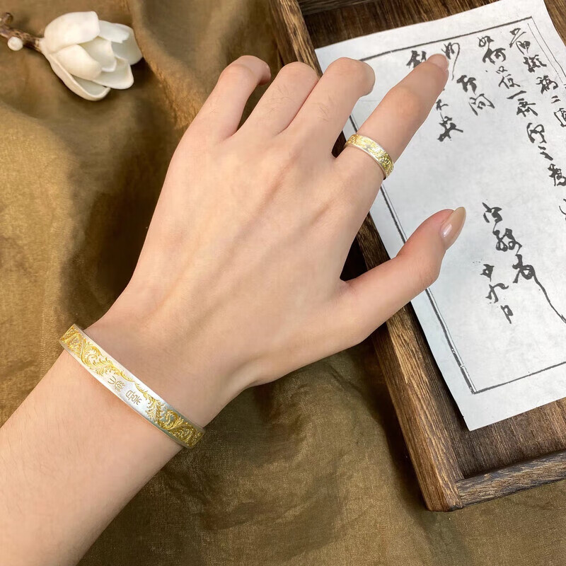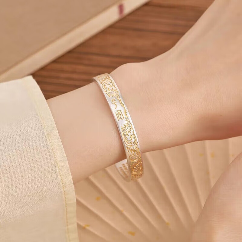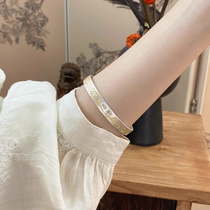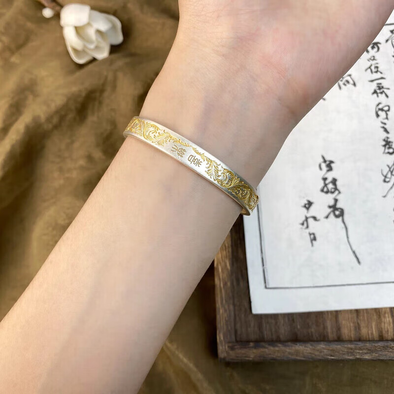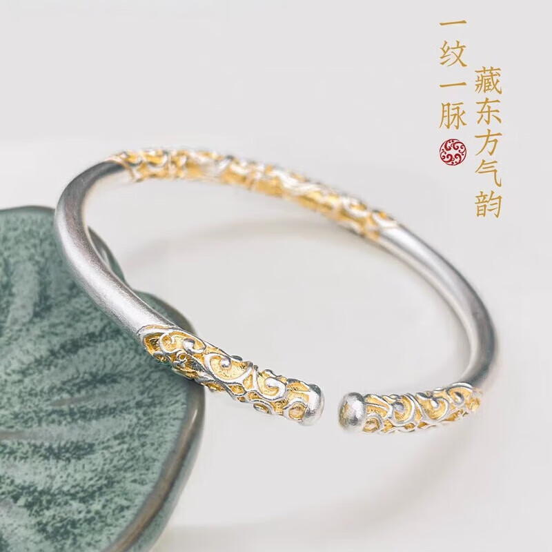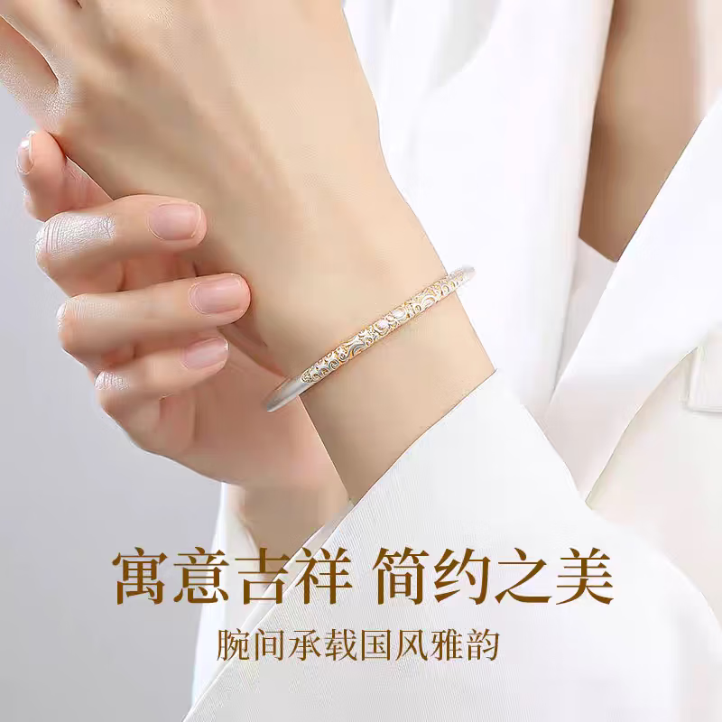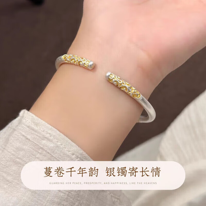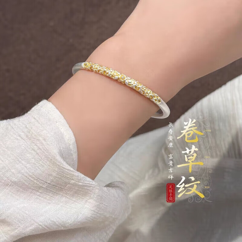 老凰祥足银9999浮云卷手镯新款纯银镯子卷草纹繁花手环礼物送女友 祥云卷草纹描金圈口60