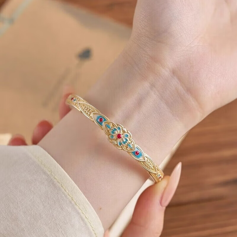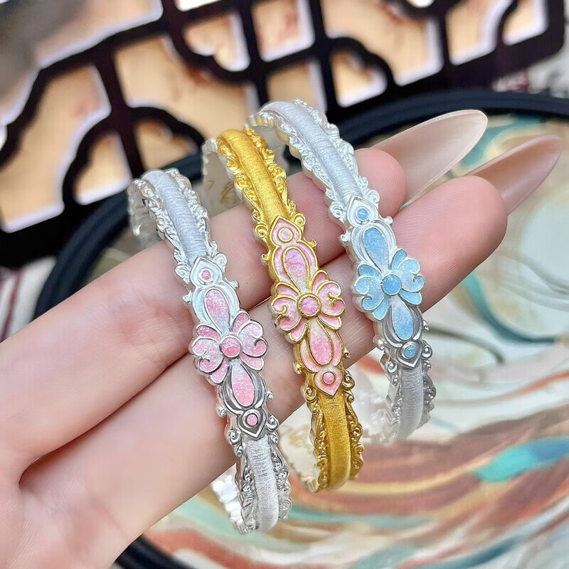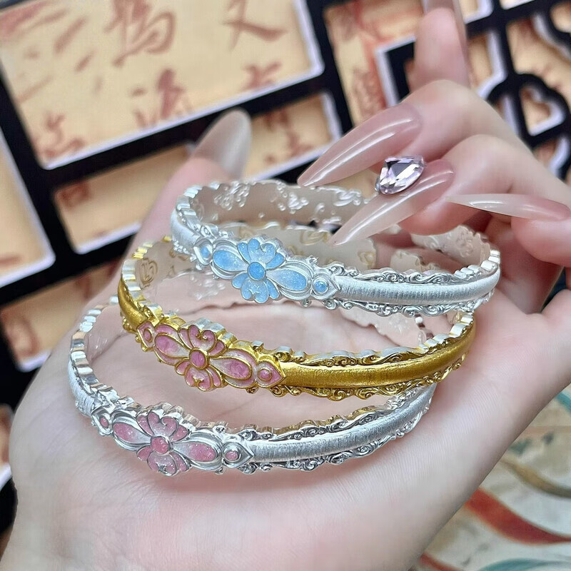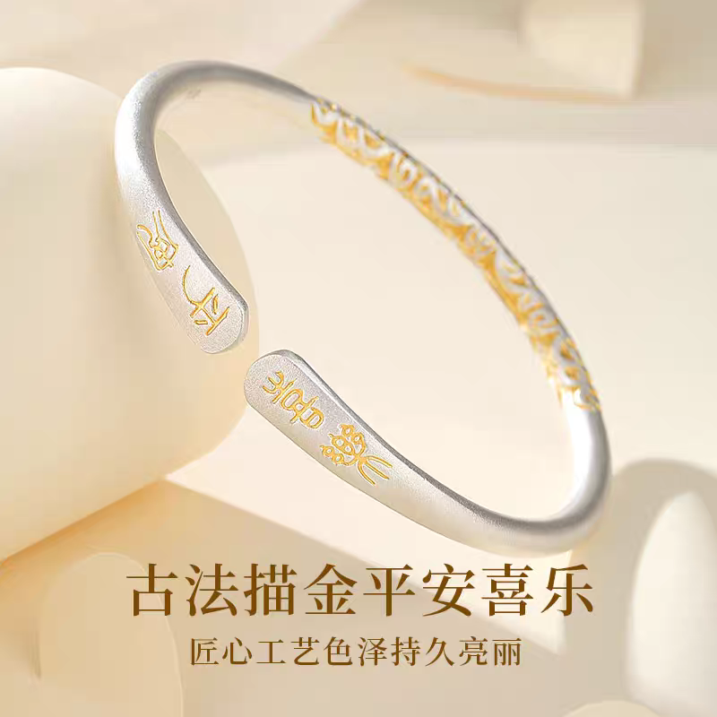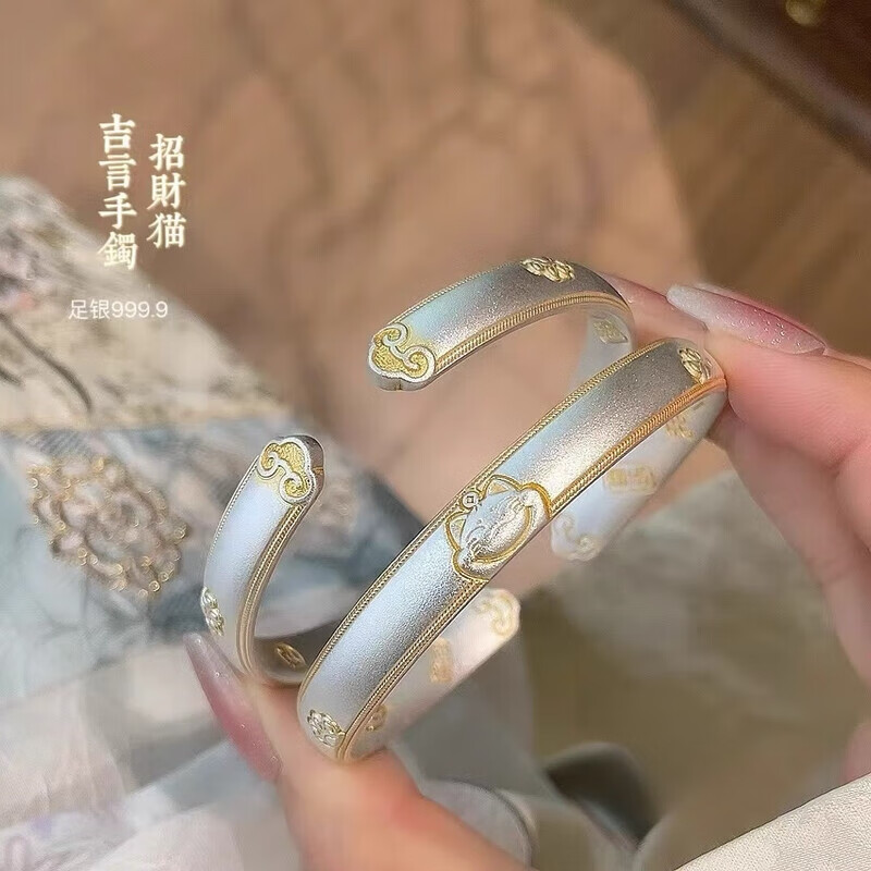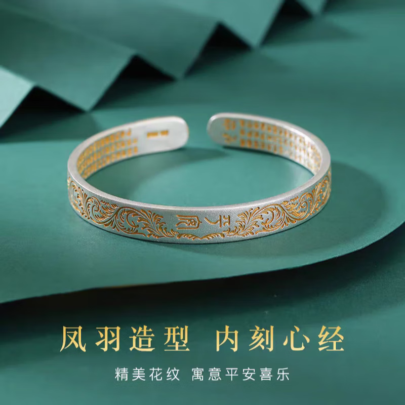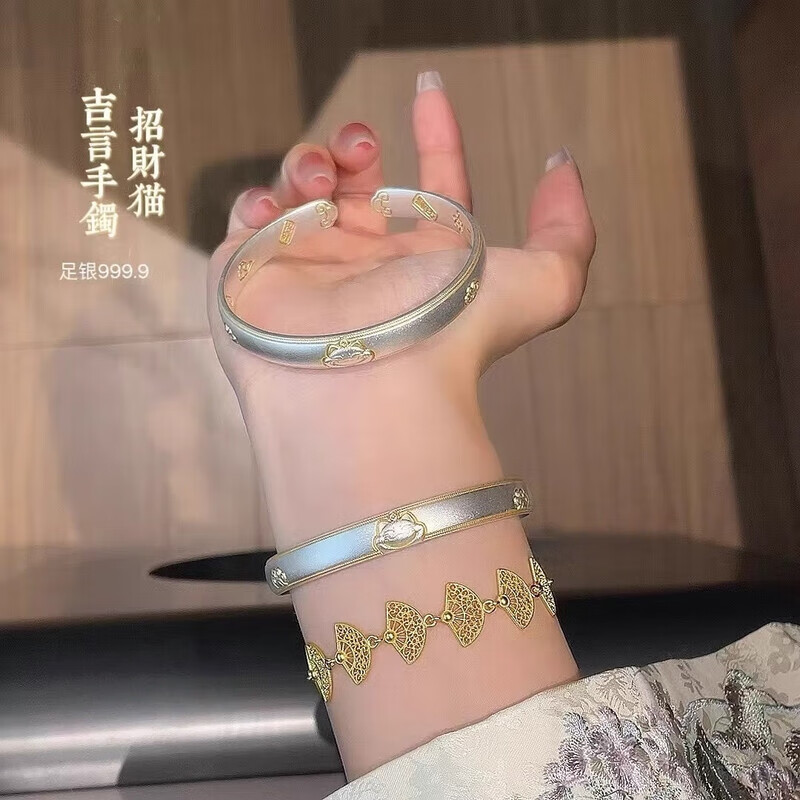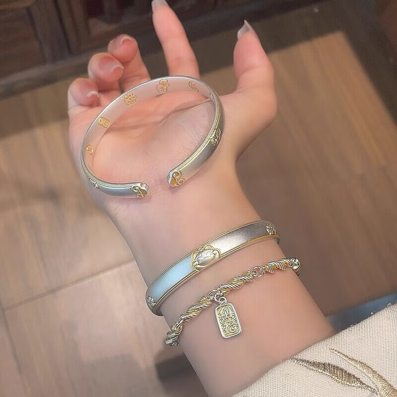 老凰祥足银9999浮云卷手镯新款纯银镯子卷草纹繁花手环礼物送女友 祥云卷草纹描金圈口60