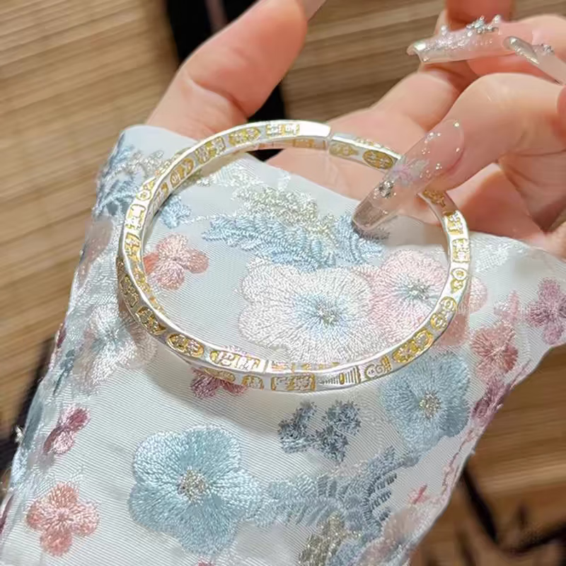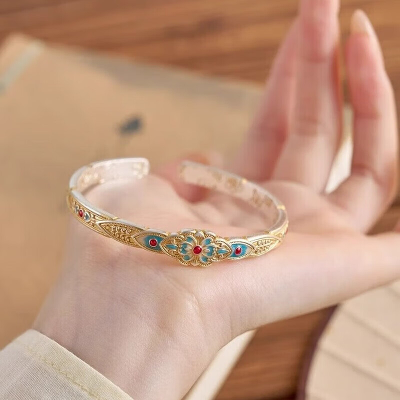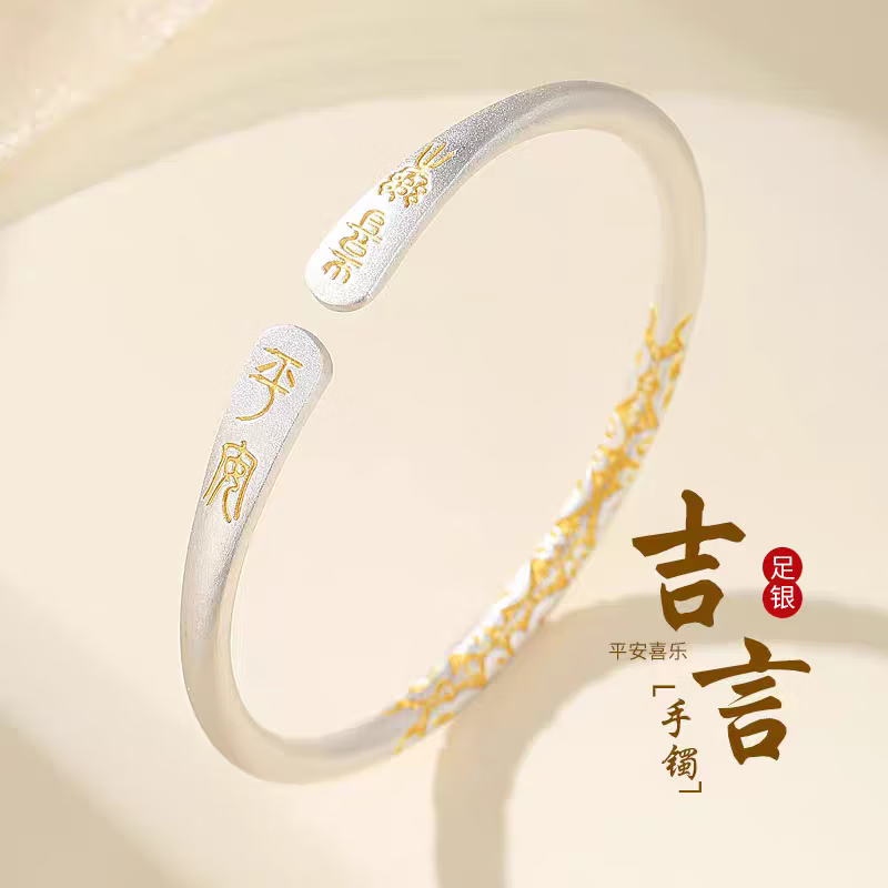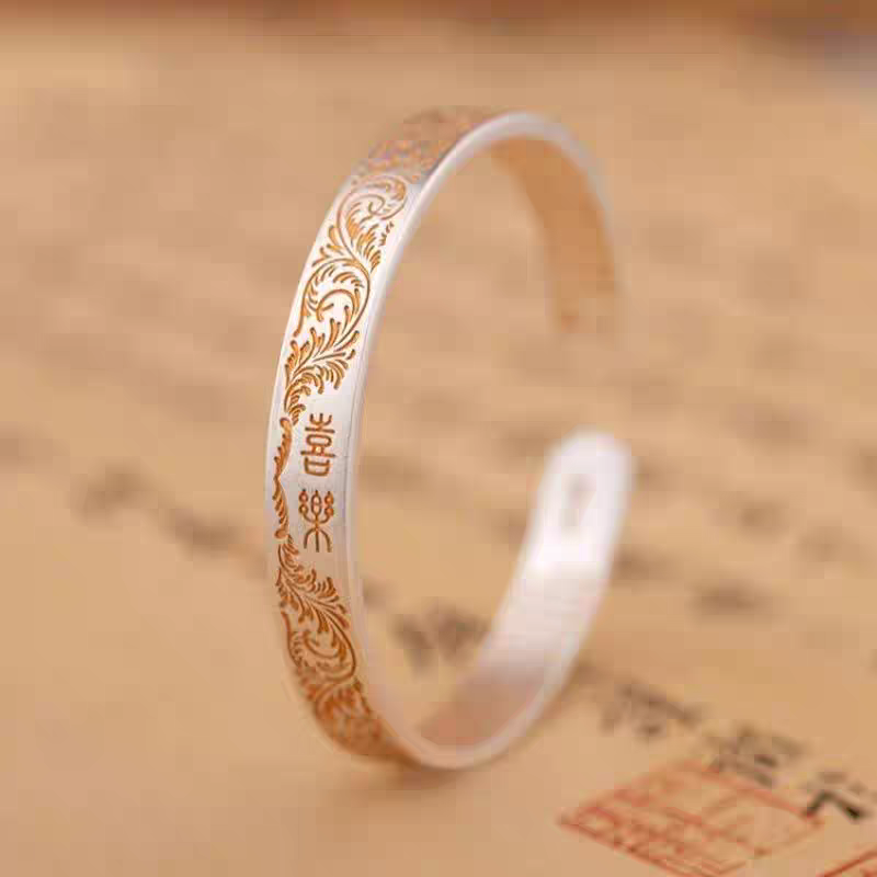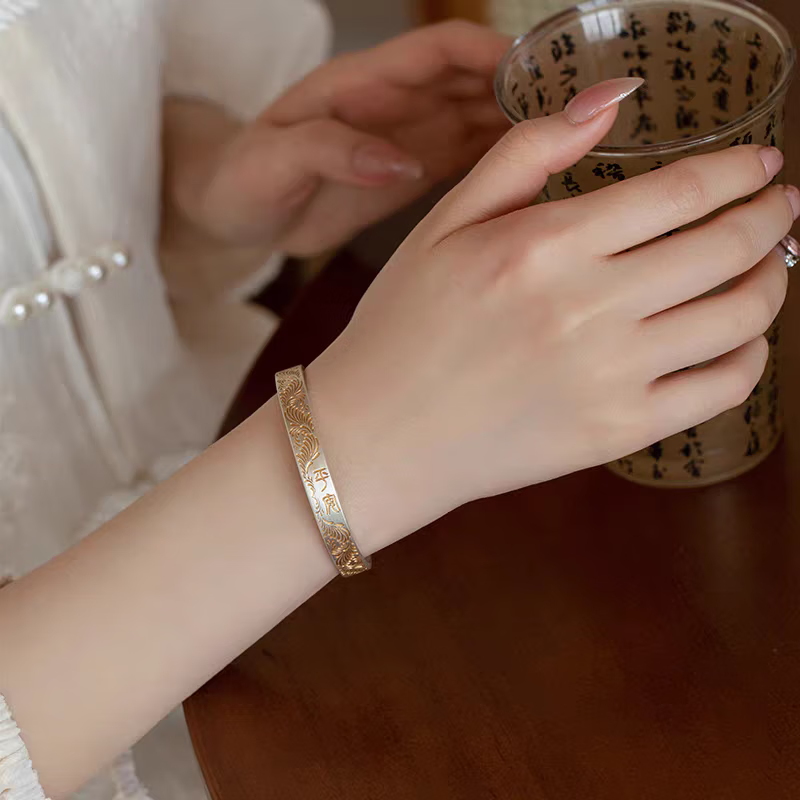 老凰祥纯银唐草纹手镯女9999实心足银镯子中式民族风复古传承手环 吉言描金银手镯30克丨证书丨礼盒
