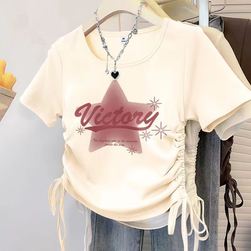 浮泽短款女上衣2024夏季新款甜辣风露腰印花短袖体恤小众抽绳正肩T恤 奶杏色/夏季新品【优质面料】 S 【建议60斤-85斤】