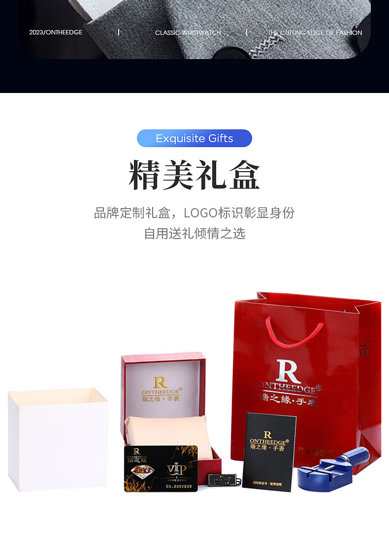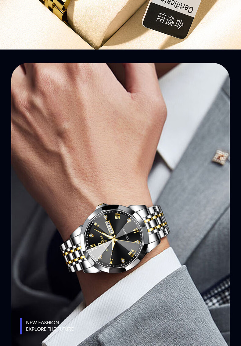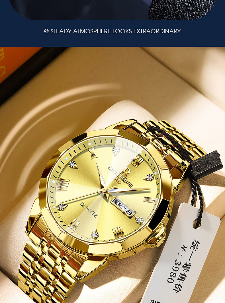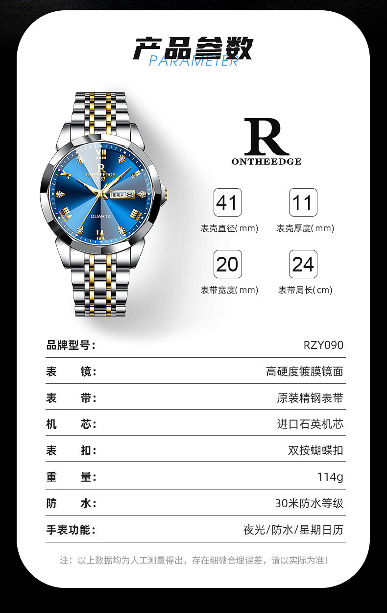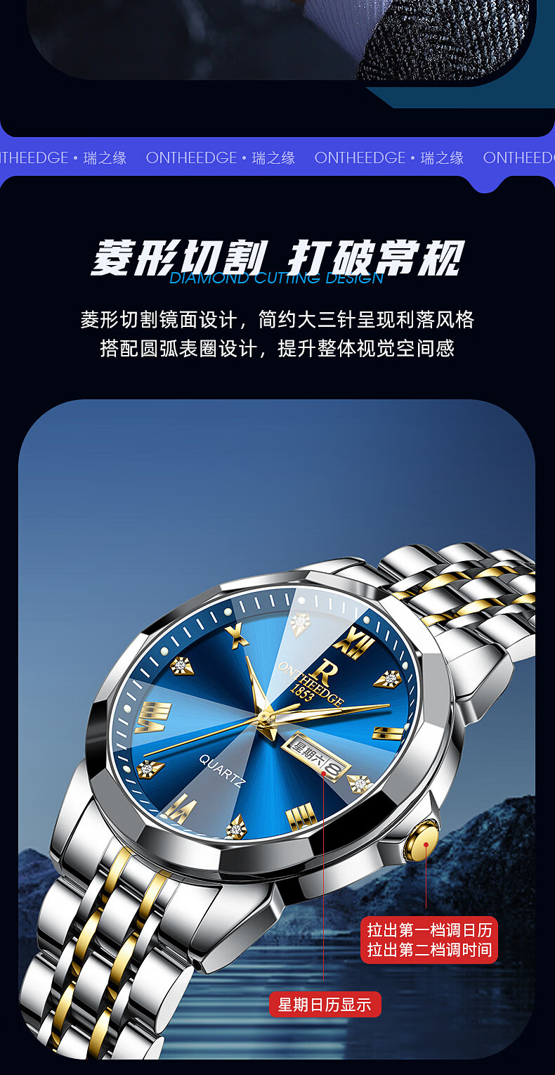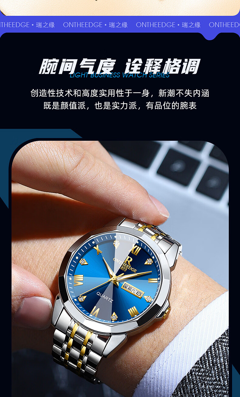 瑞之缘(ONTHEEDGE)商务防水双日历腕表男夜光石英表手表学生轻奢时尚女表情侣表礼物 090金白钢