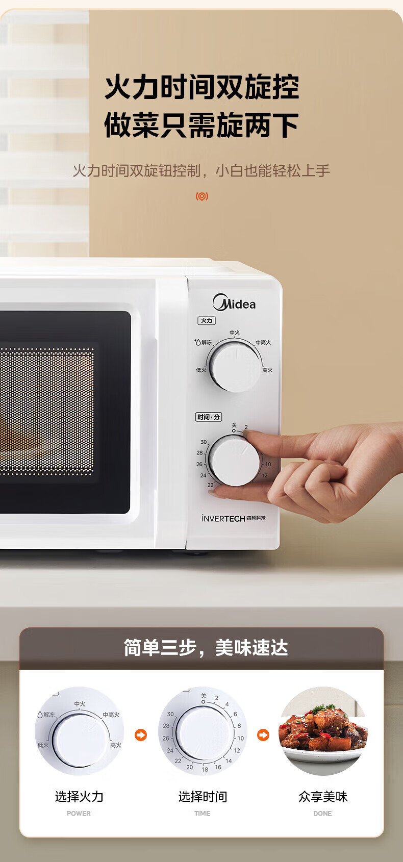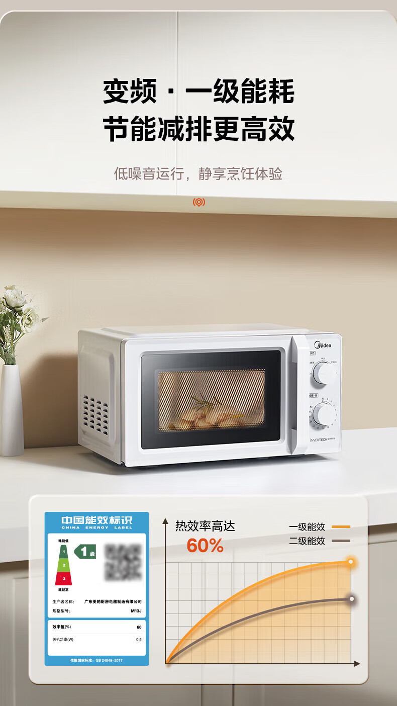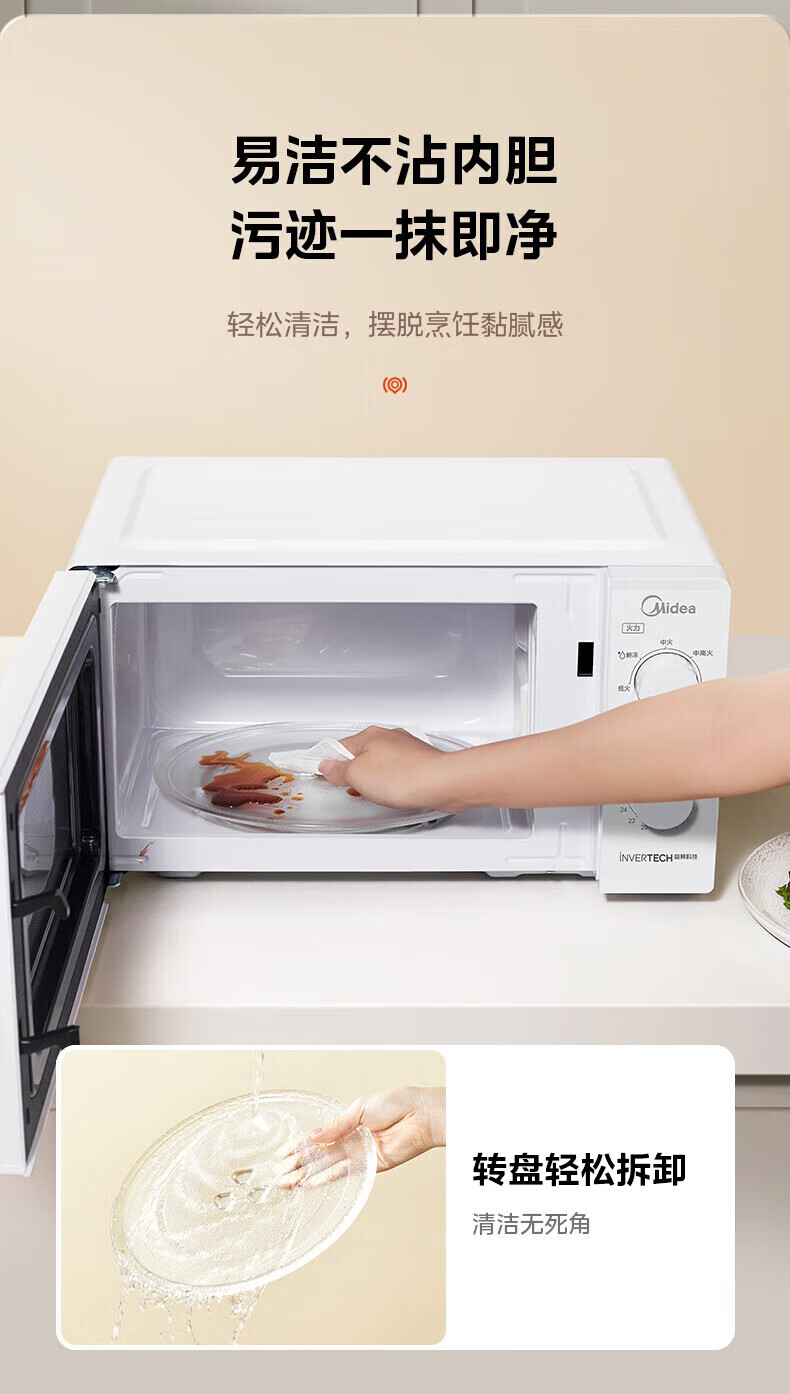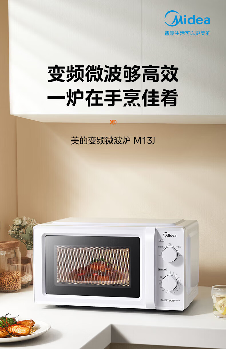 美的(Midea)家用小型快捷微波炉 双旋钮操控 一节能效五档火力 智能解冻360°旋转加热 (213B升级款) M13J 乳白色 M13J