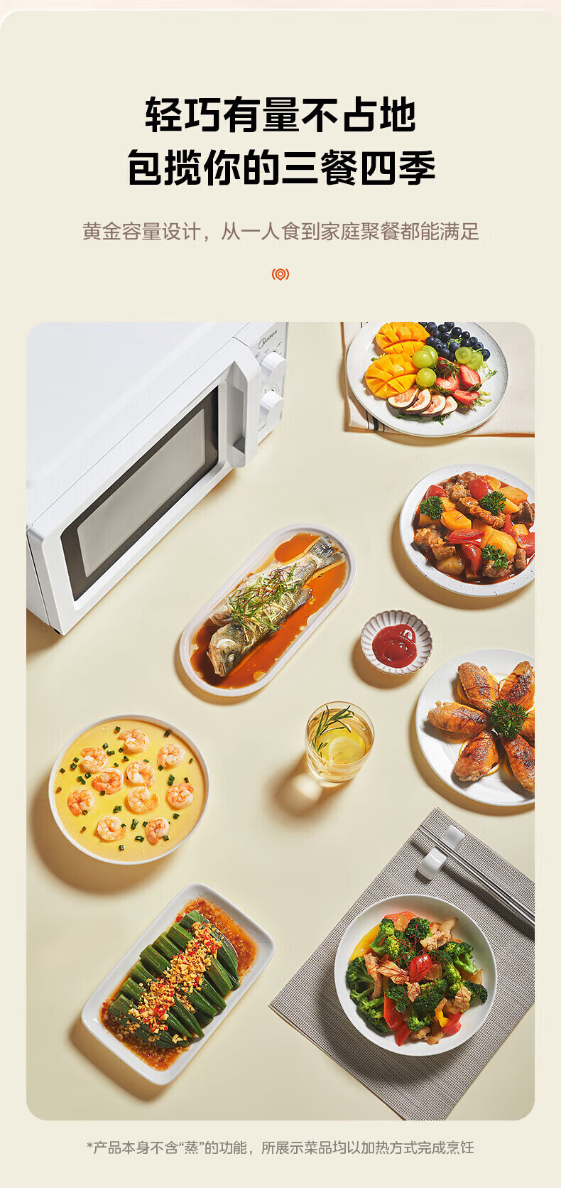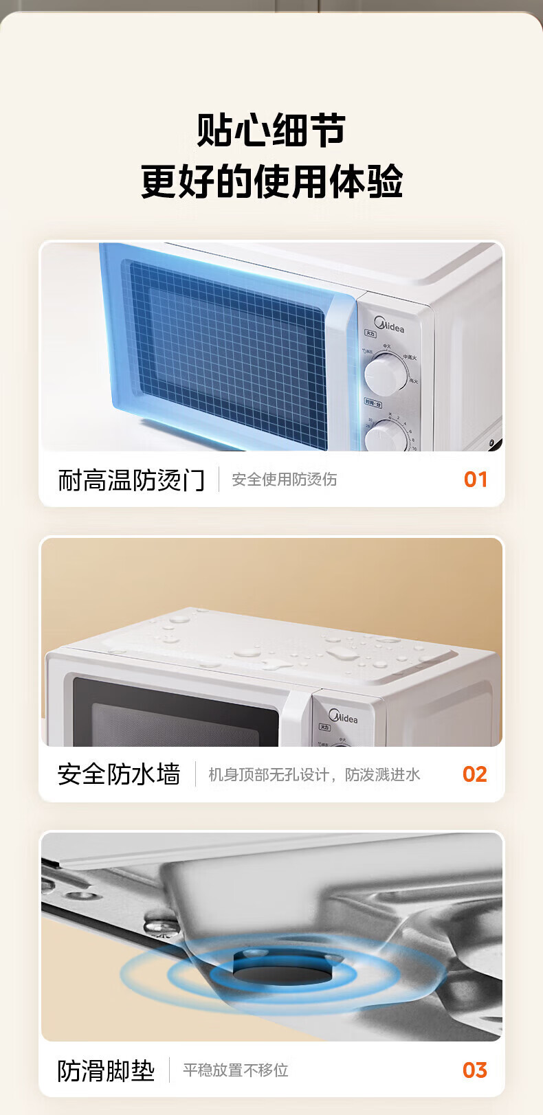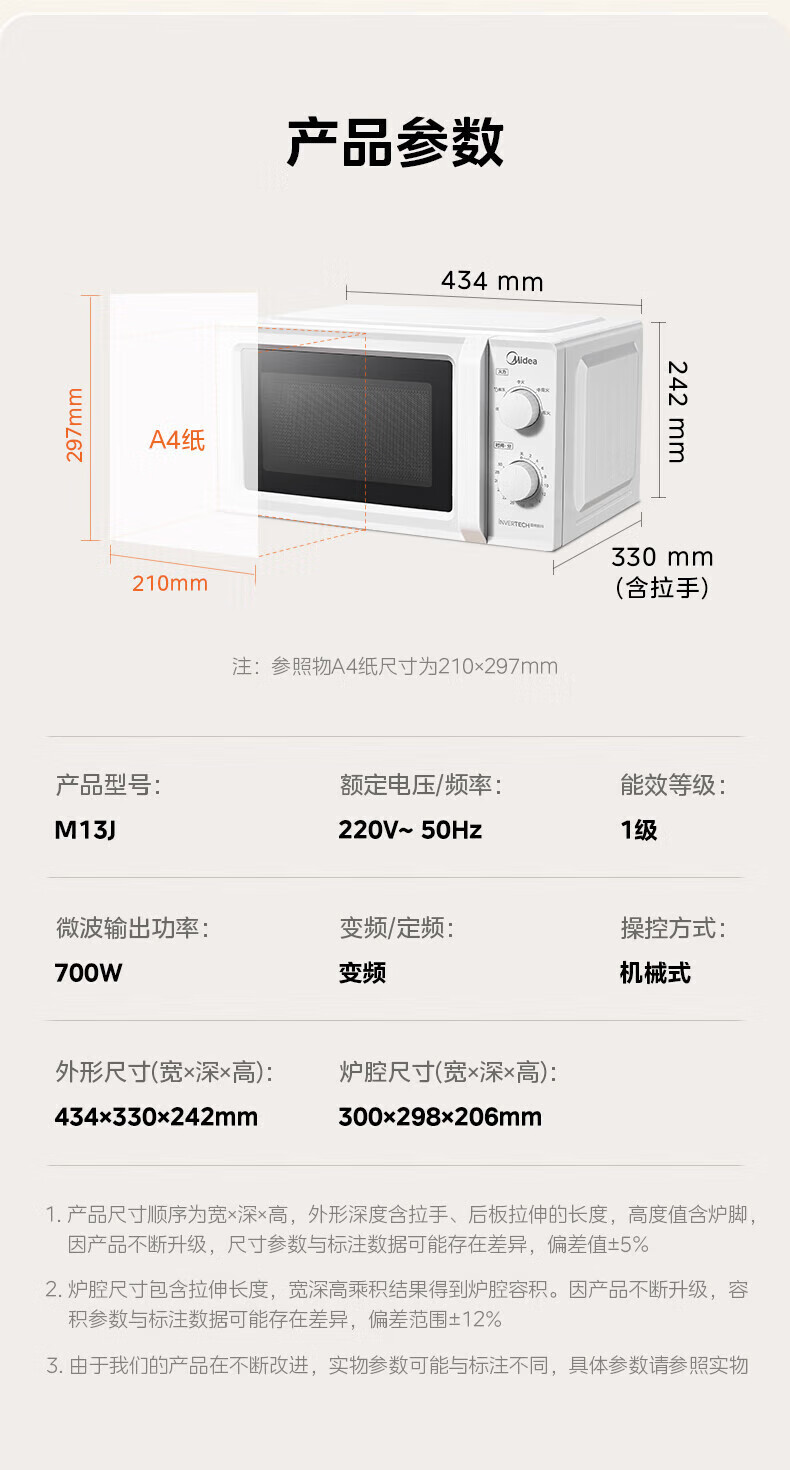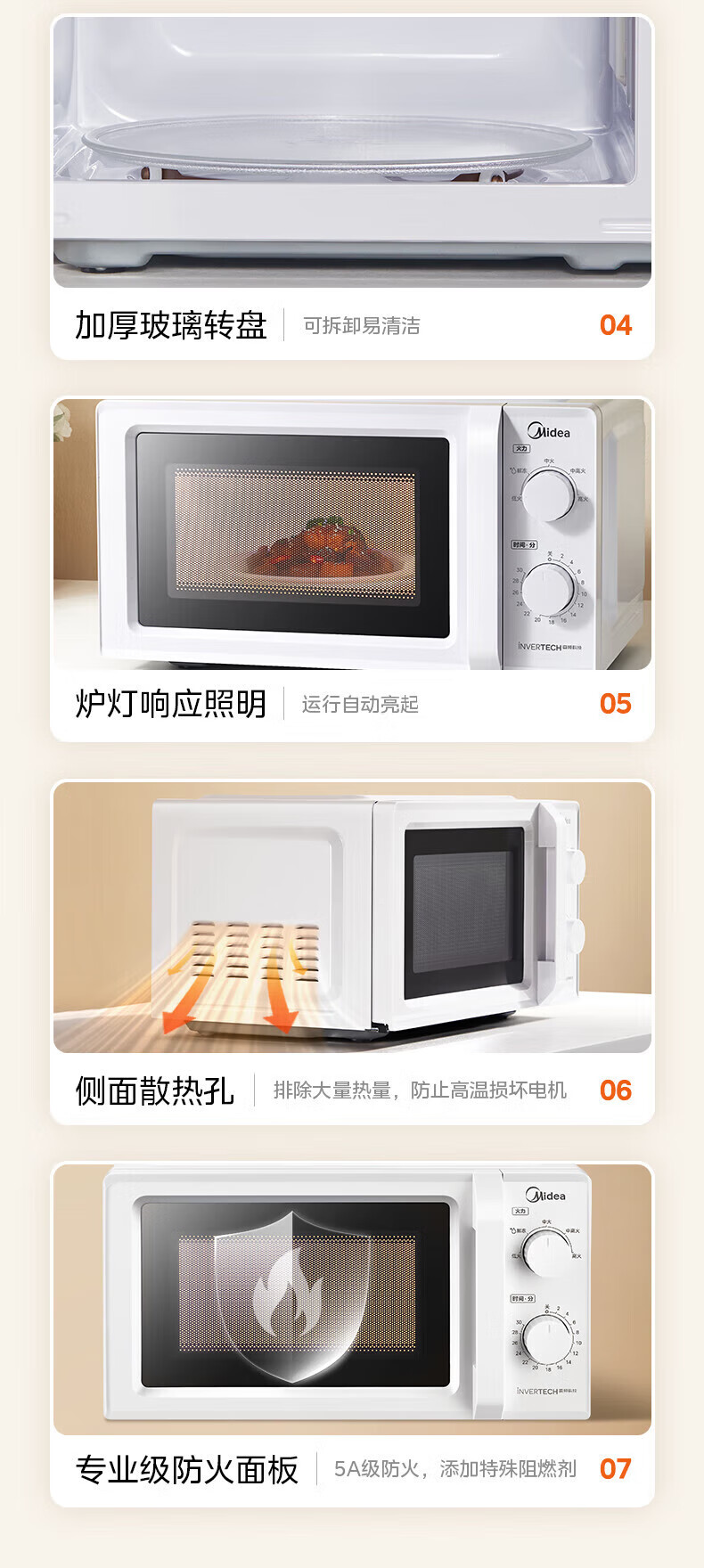美的(Midea)家用小型快捷微波炉 双旋钮操控 一节能效五档火力 智能解冻360°旋转加热 (213B升级款) M13J 乳白色 M13J