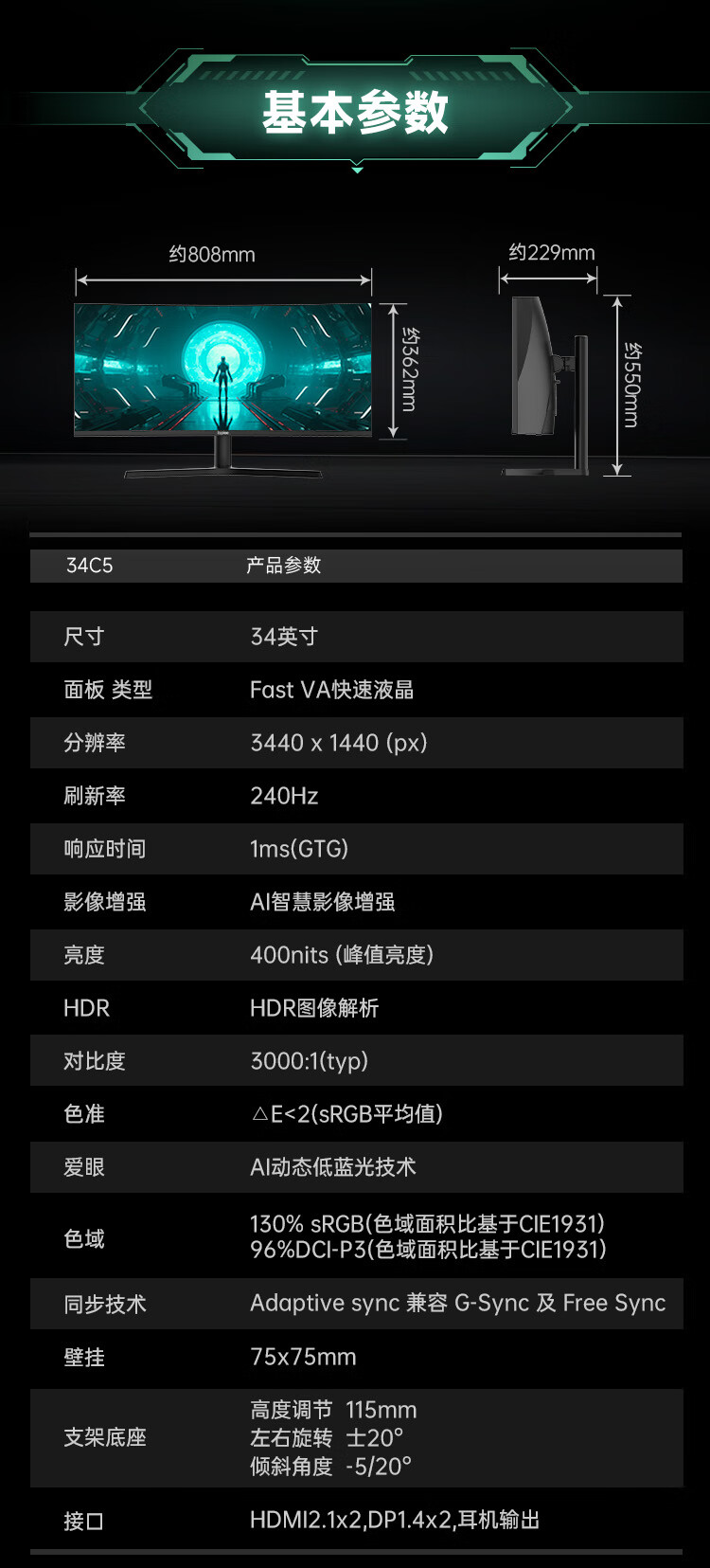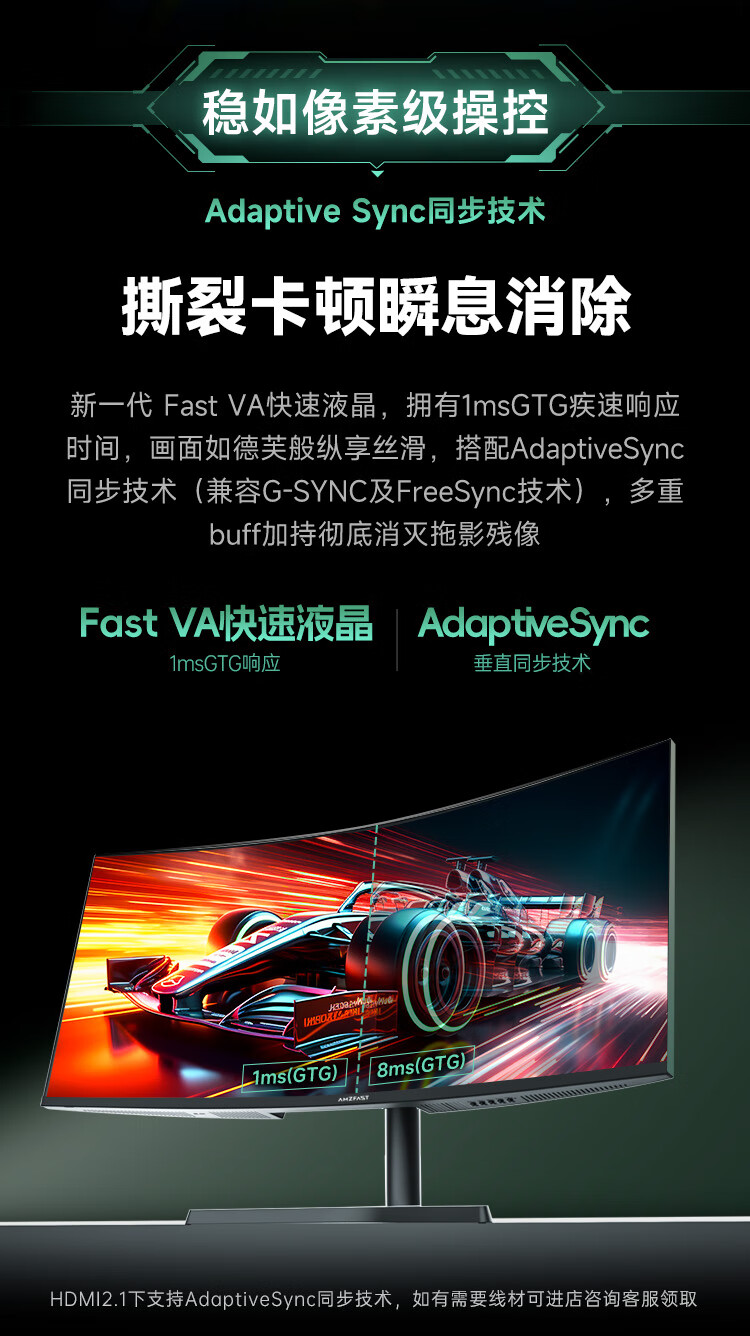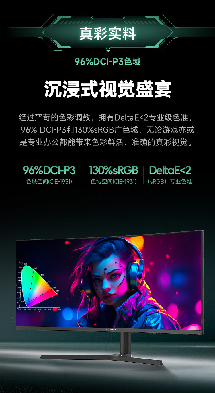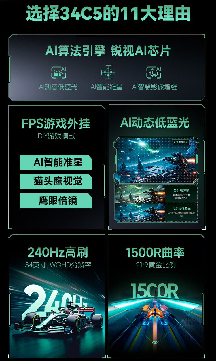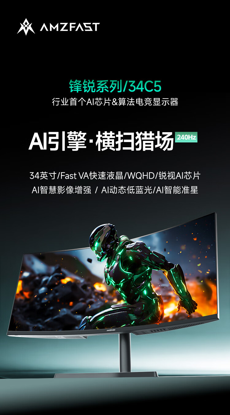 AMZFAST 34英寸WQHD带鱼屏 240Hz满血电竞FastVA 准4K 1500R曲面 AI算法办公游戏升降旋转显示器 锋锐34C5