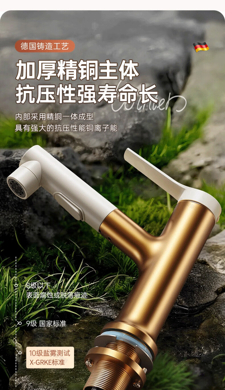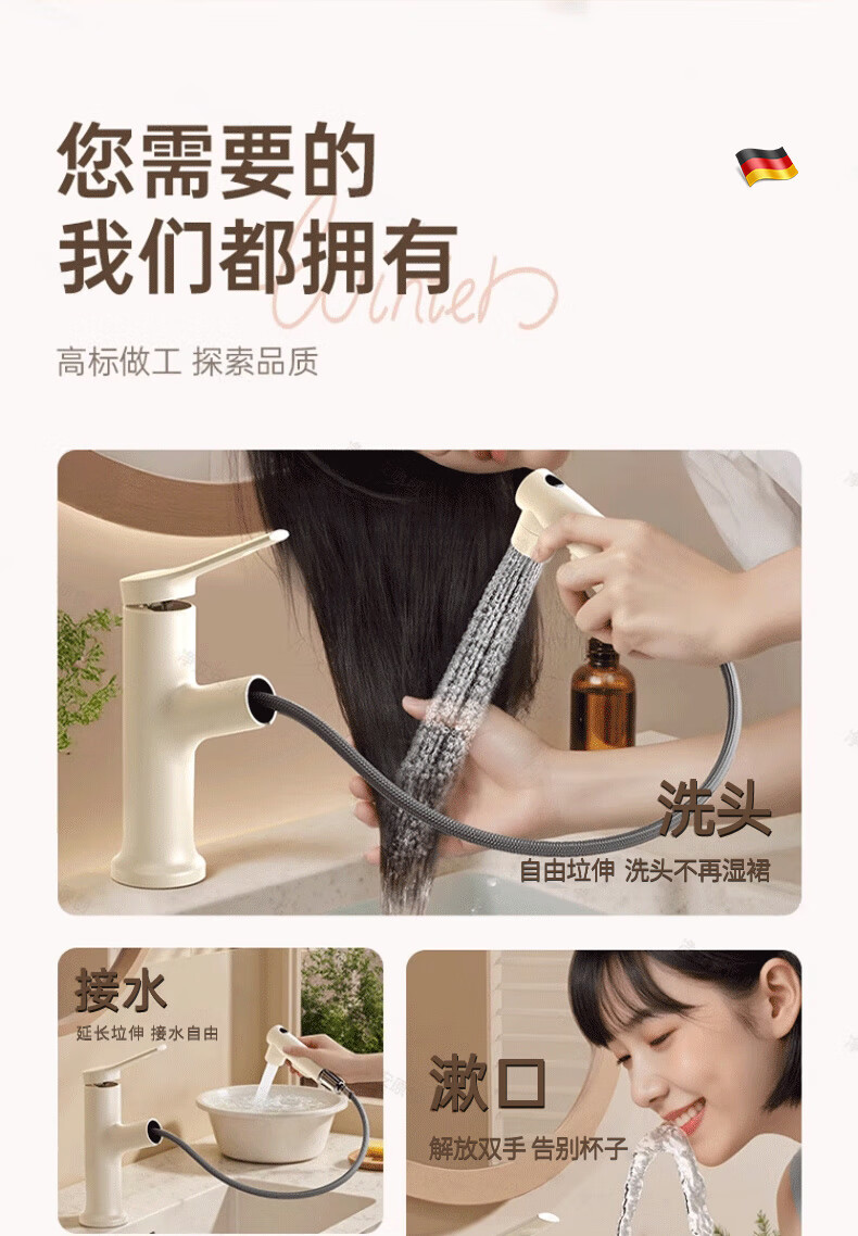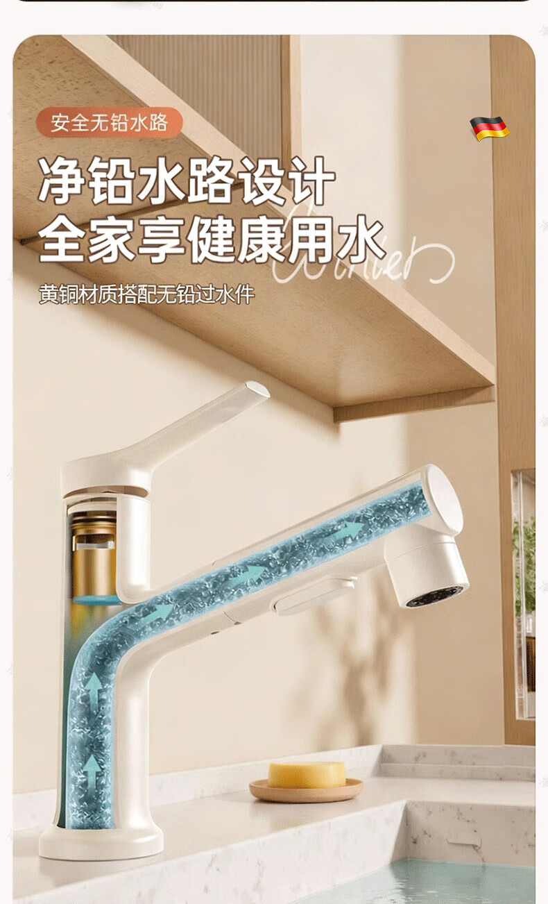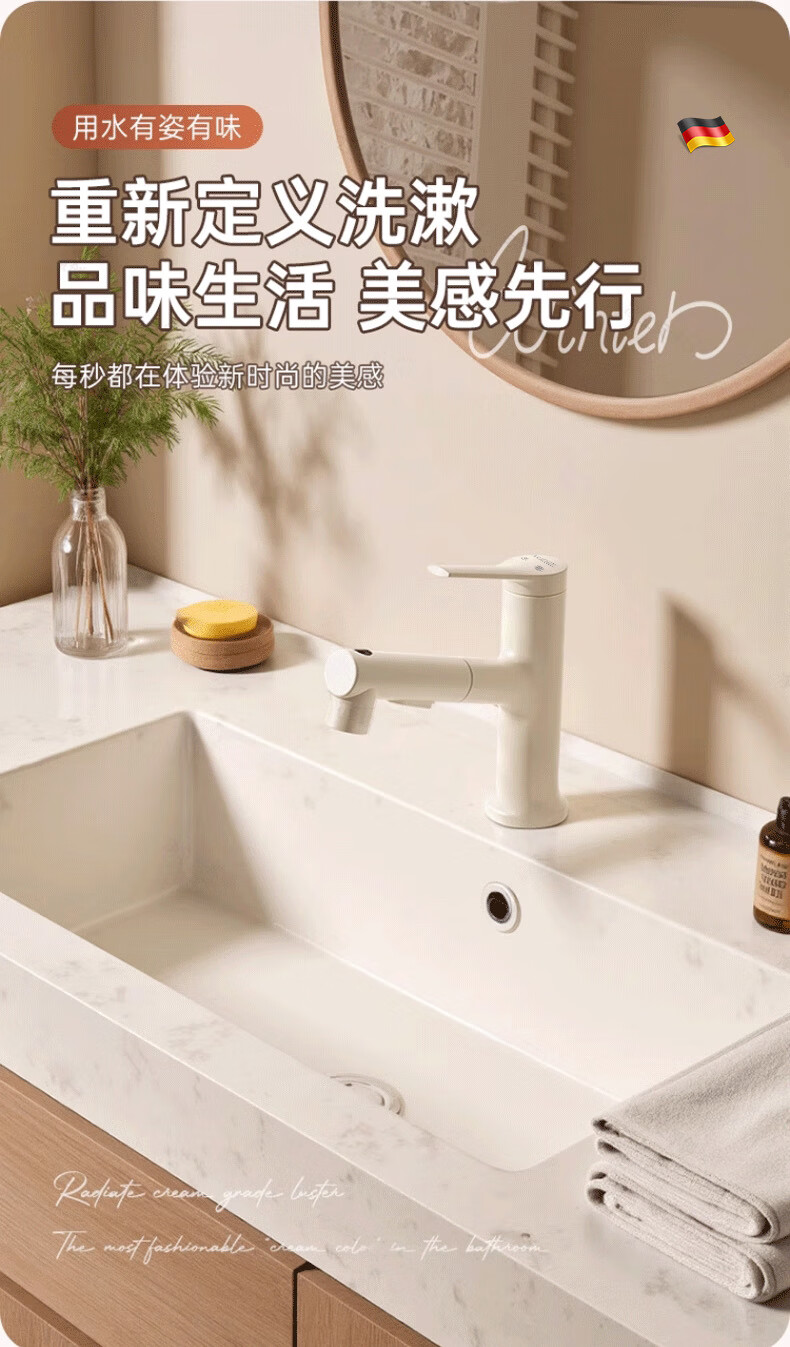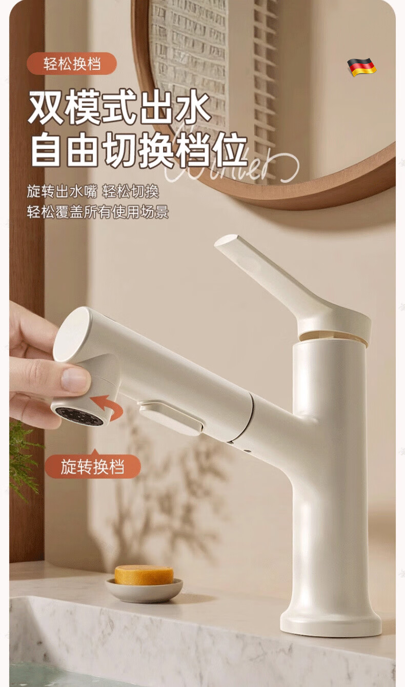 X-GRKE【德国】全铜面盆水龙头洗手盆洗脸盆洗手池卫生间抽拉式冷热龙头 全铜主体【3档抽拉上涌出水】奶油白 全铜上涌抽拉3档丨赠80cm冷热进水管