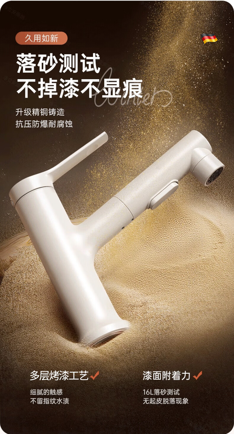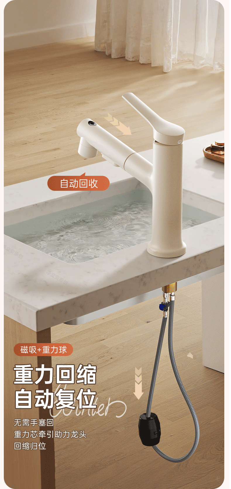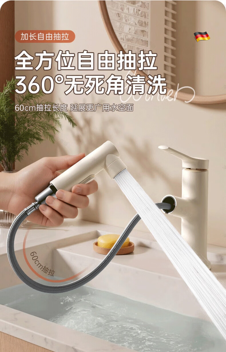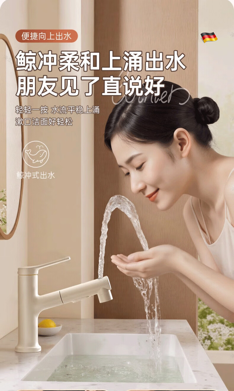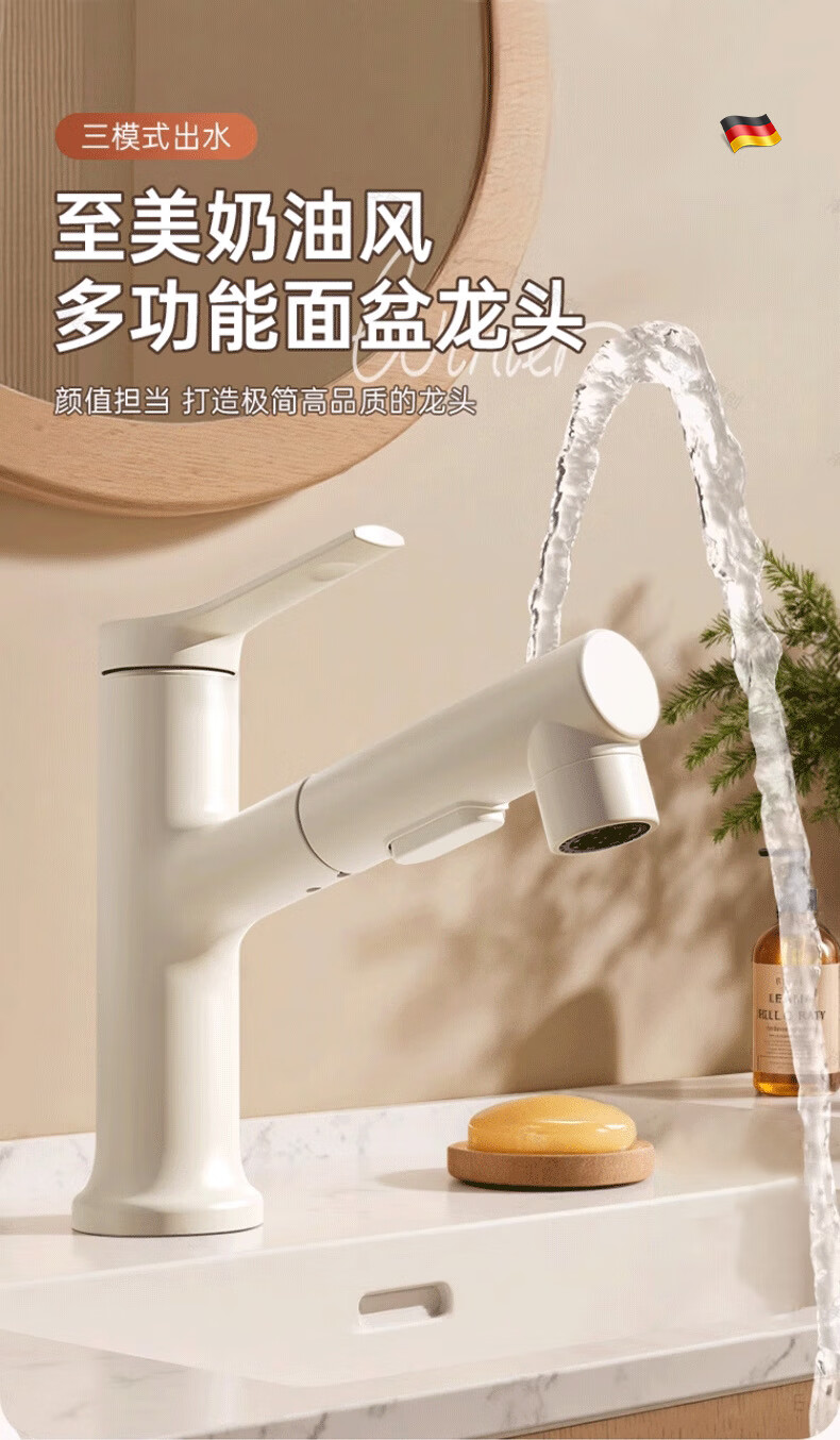 X-GRKE【德国】全铜面盆水龙头洗手盆洗脸盆洗手池卫生间抽拉式冷热龙头 全铜主体【3档抽拉上涌出水】奶油白 全铜上涌抽拉3档丨赠80cm冷热进水管