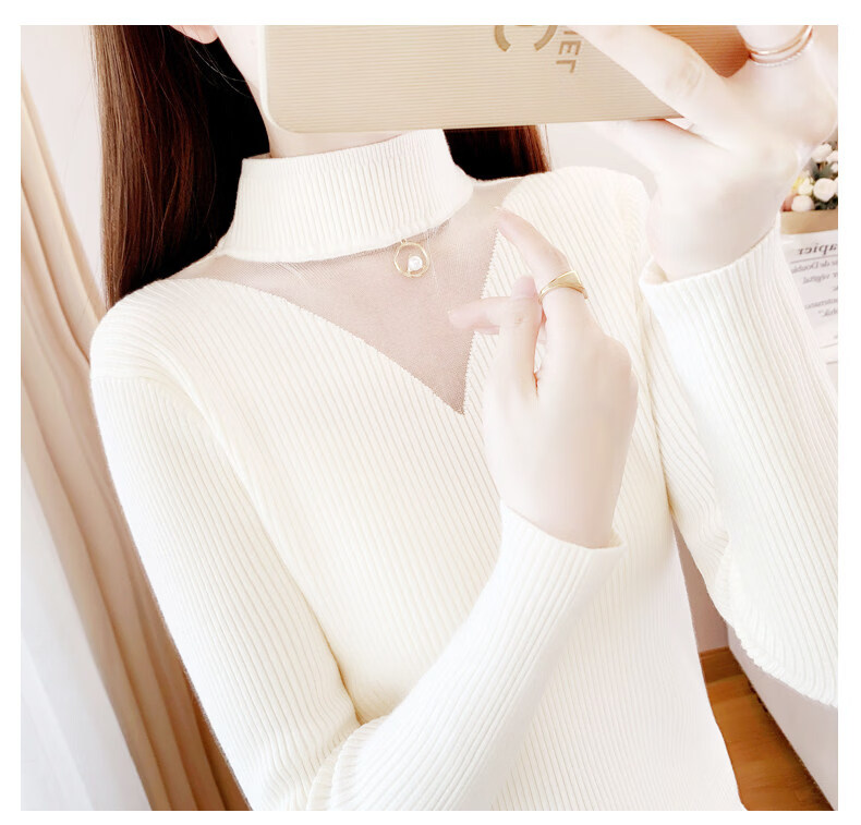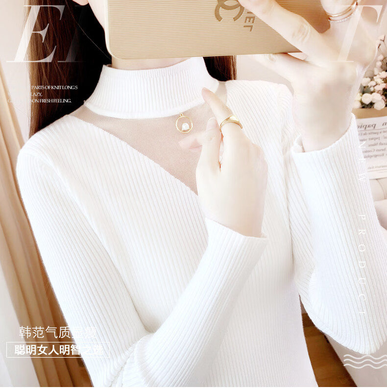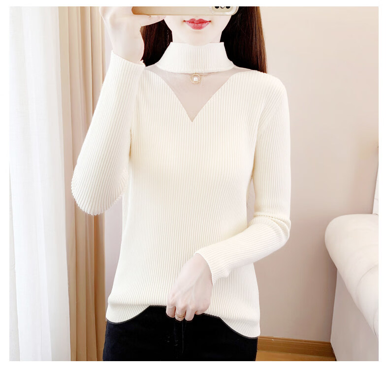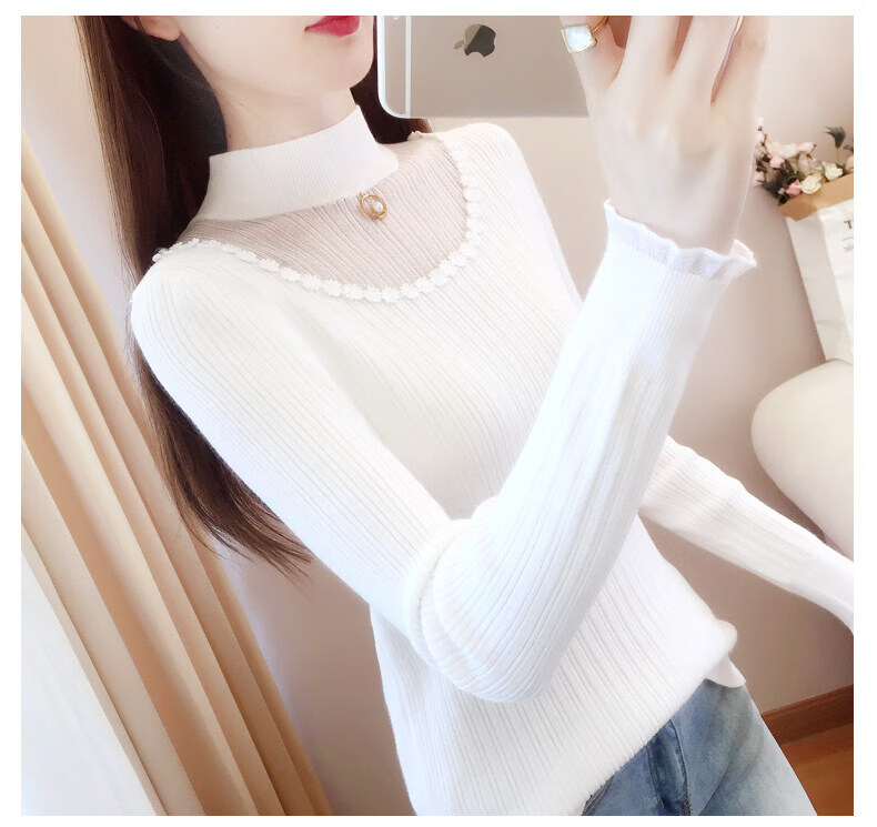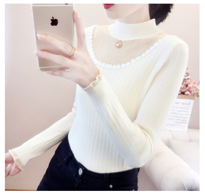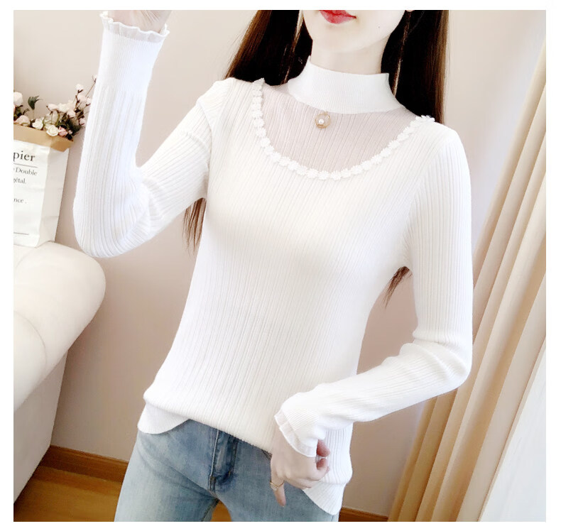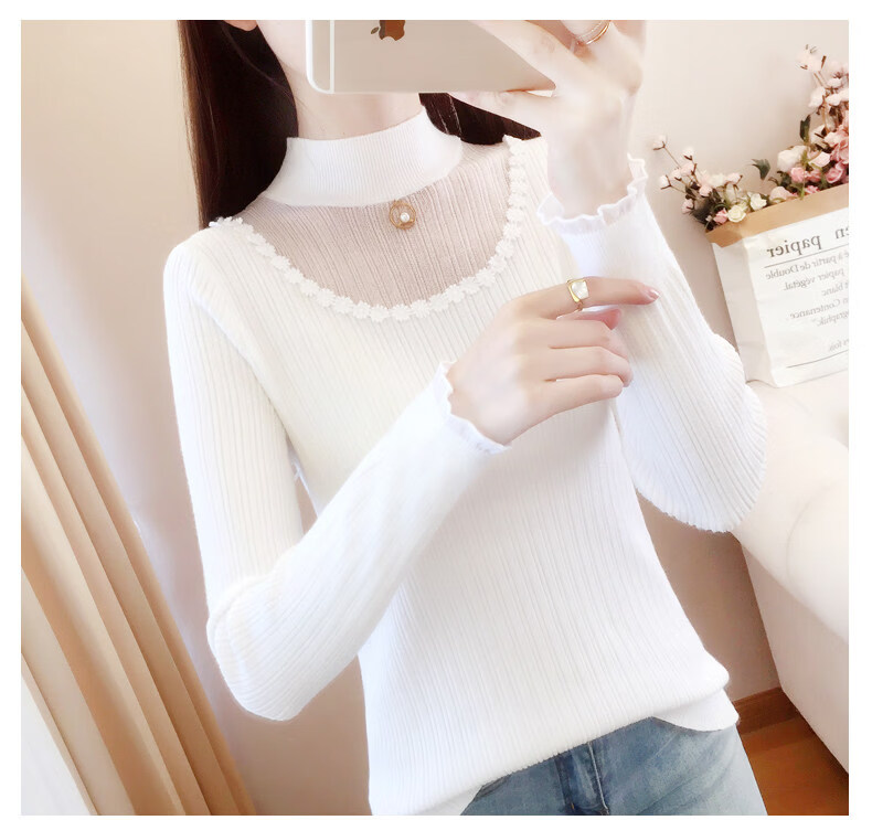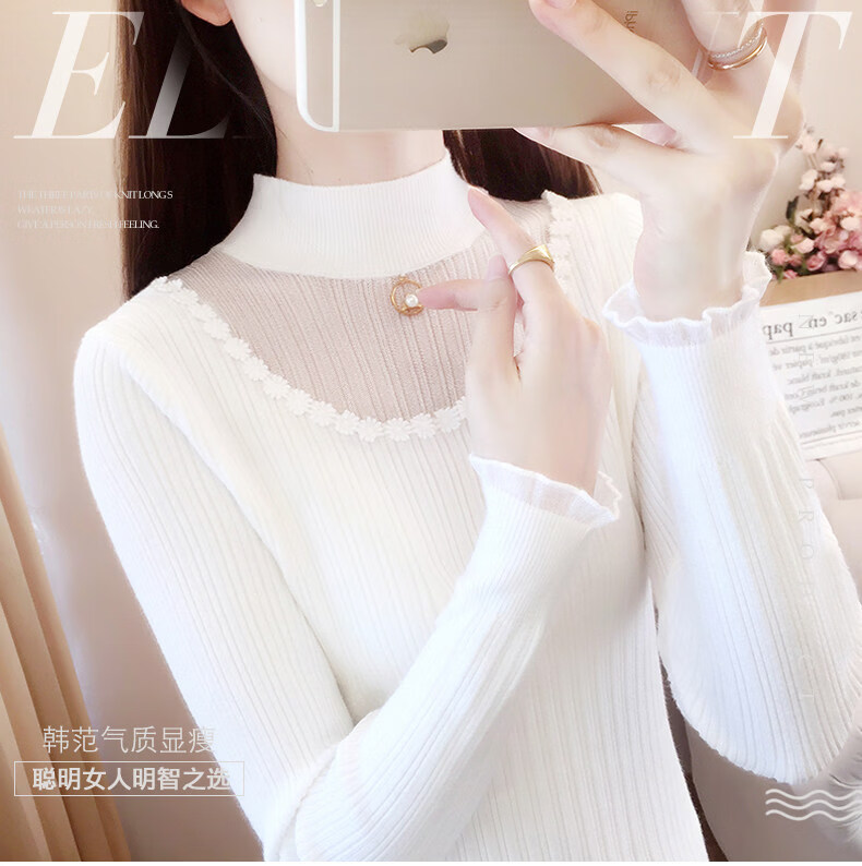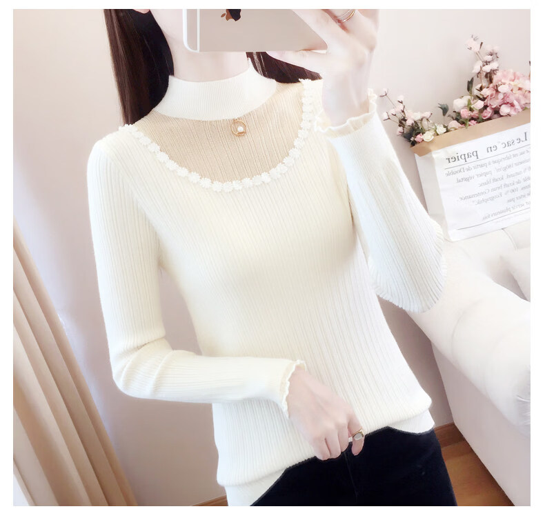 香影纯半高领打底衫蕾丝毛衣女套头2025秋冬新款显瘦内搭针织衫外穿上衣 圆领蕾丝白色 L (建议105-115斤)
