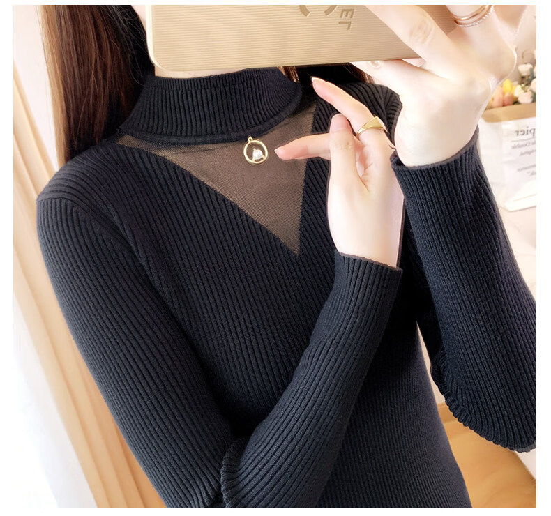Olrain欧芮儿半高领莫代尔长袖T恤秋季女装弹力修身内搭打底衫 黑色 L