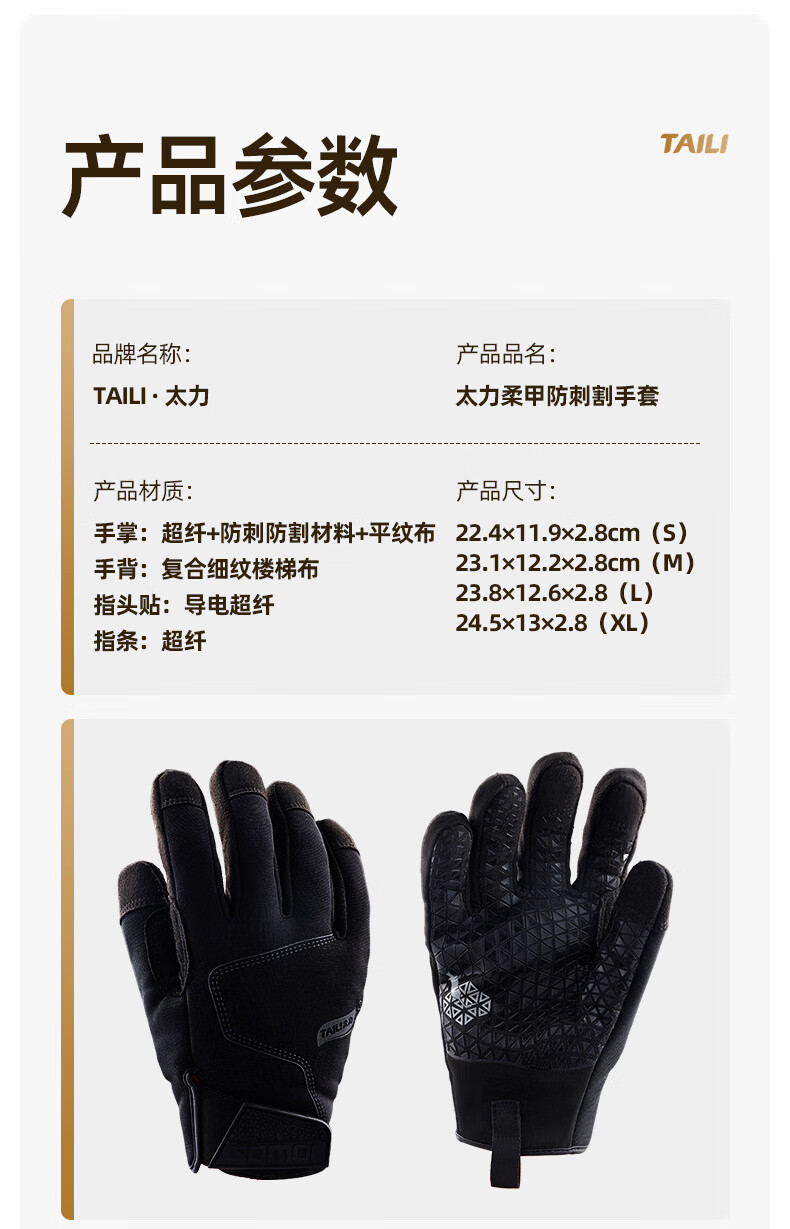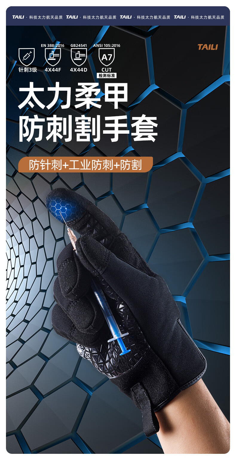 太力防刺割手套防滑柔甲透气园艺裁剪搬运防护耐磨防割手套 黑色L码