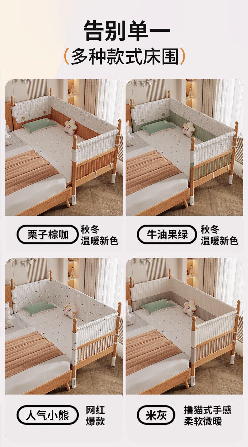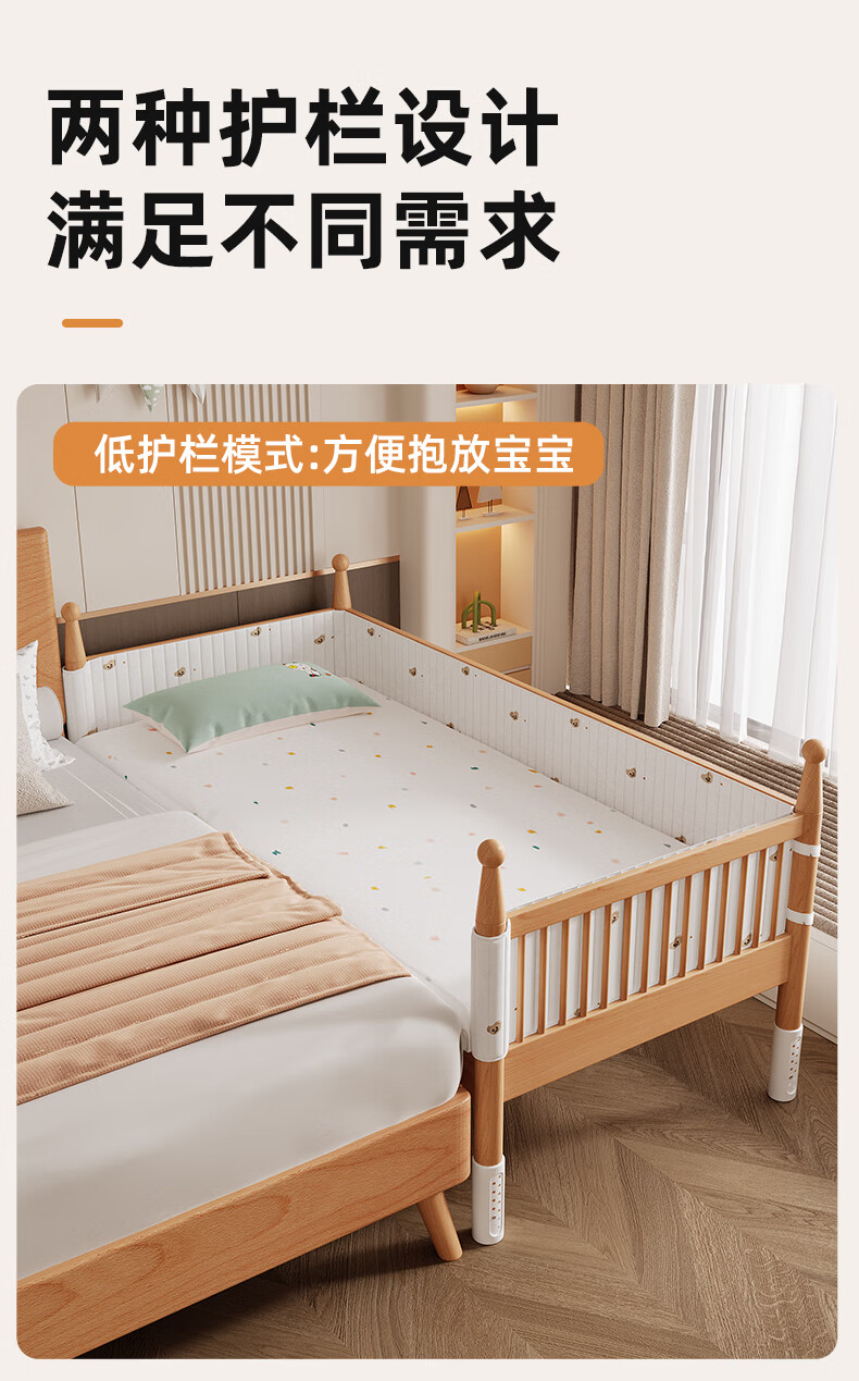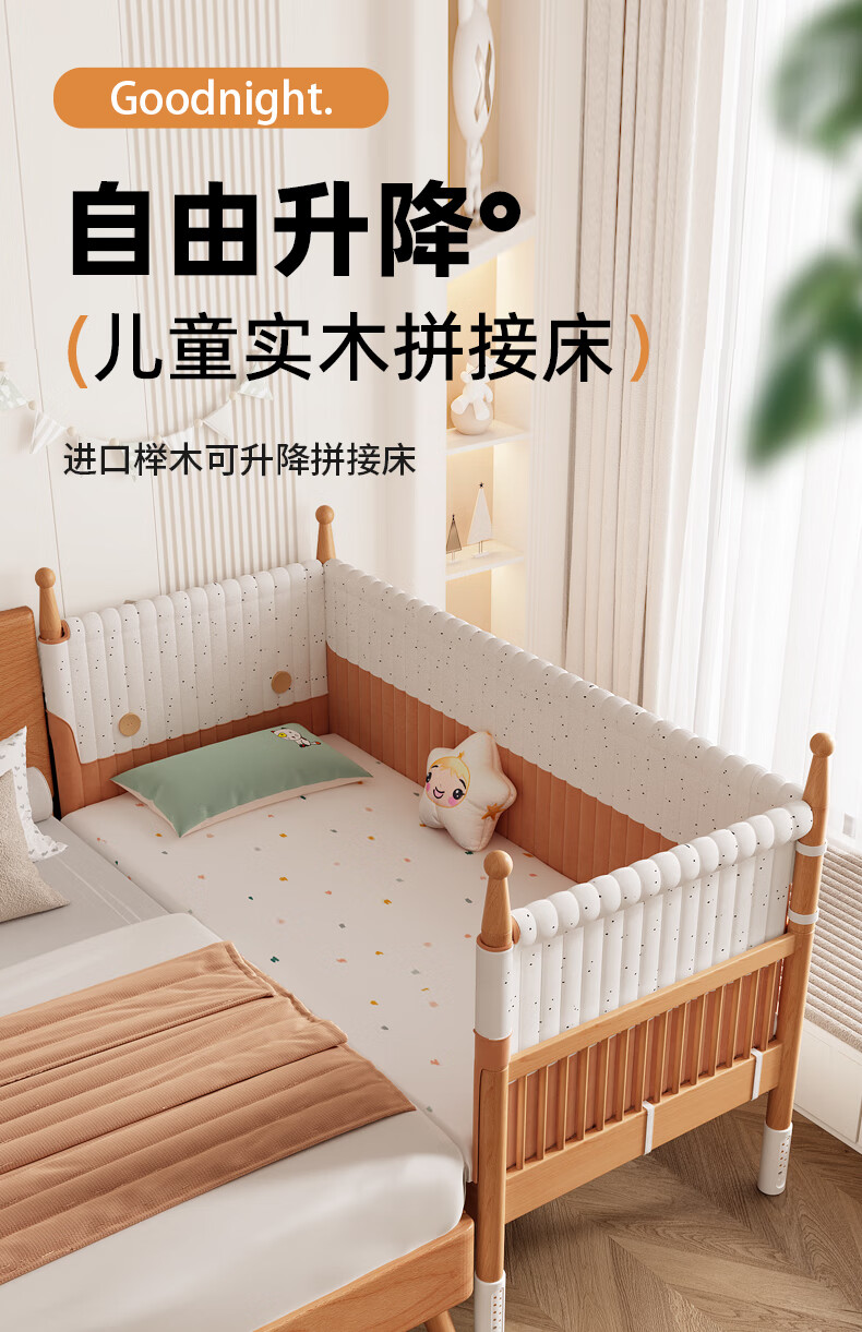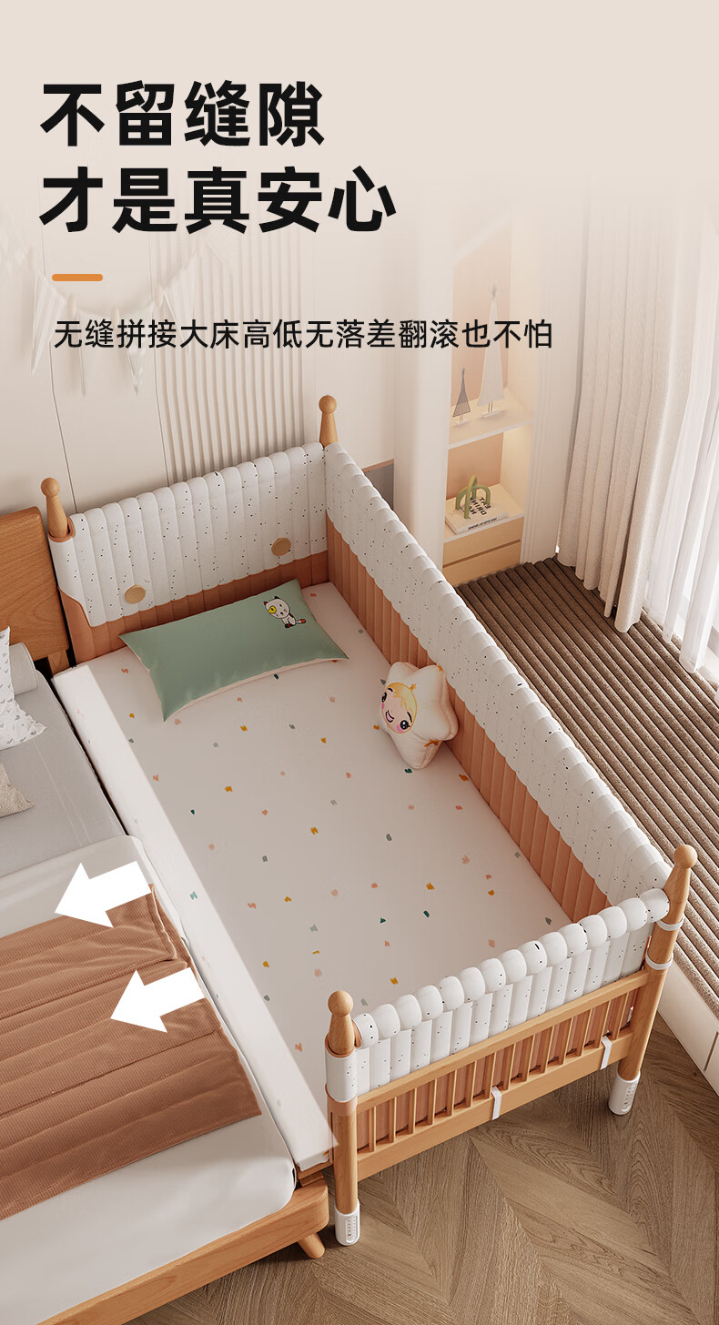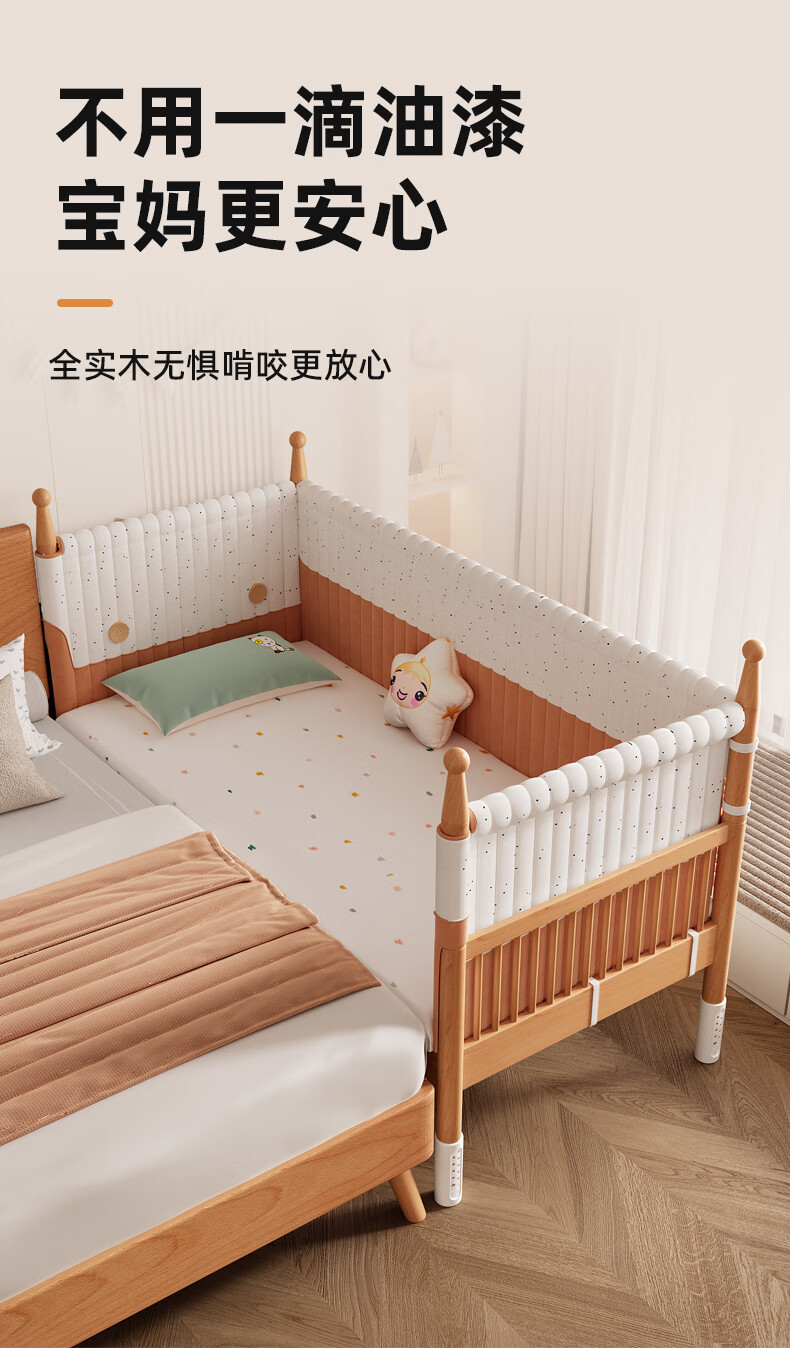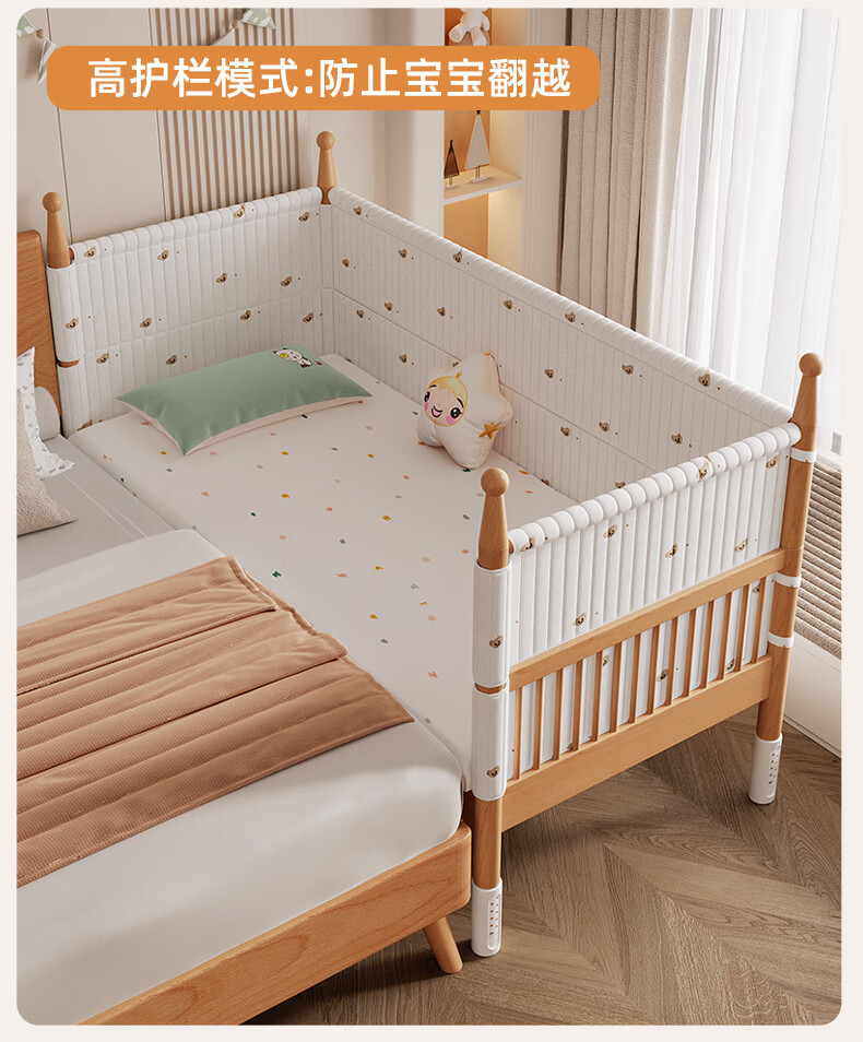 枫眠榉木婴儿拼接床实木加高带护栏加宽床大人可睡小床宝宝儿童床 床+牛油果绿床围+6cm椰棕乳胶垫 180x80cm