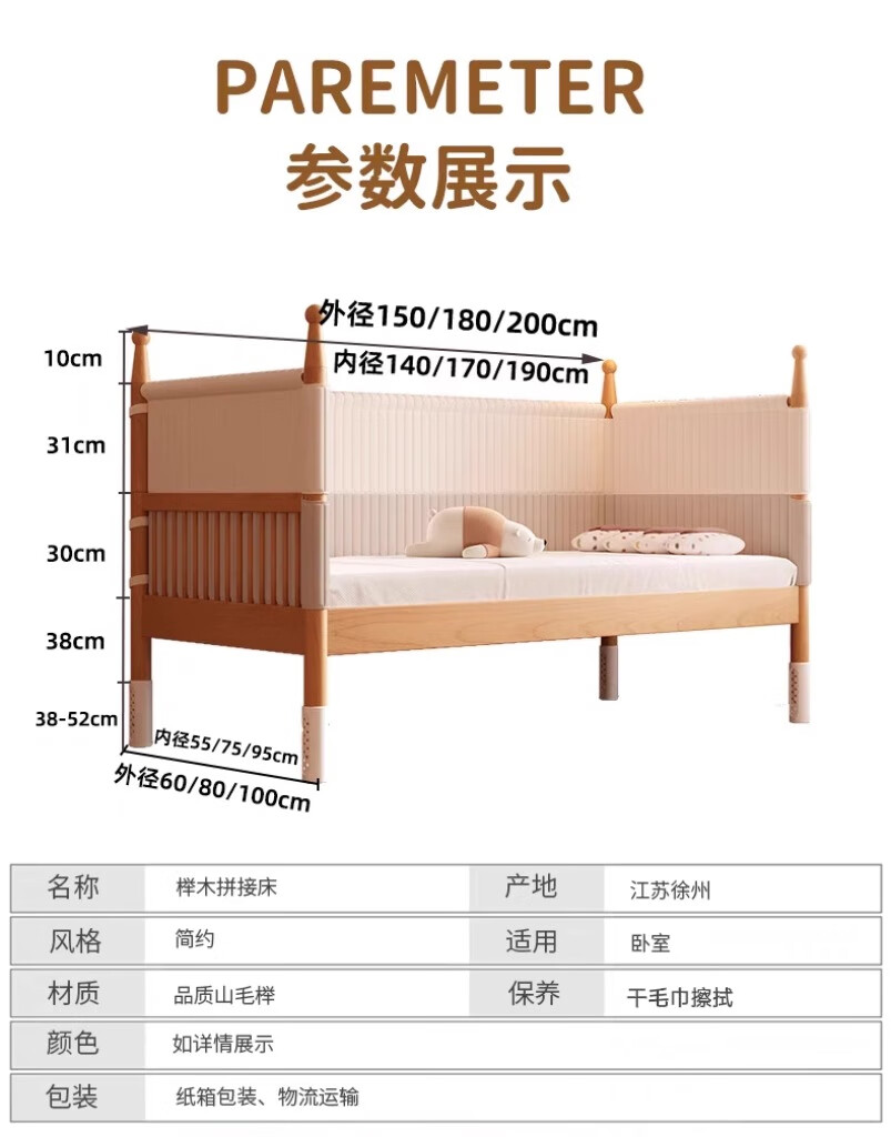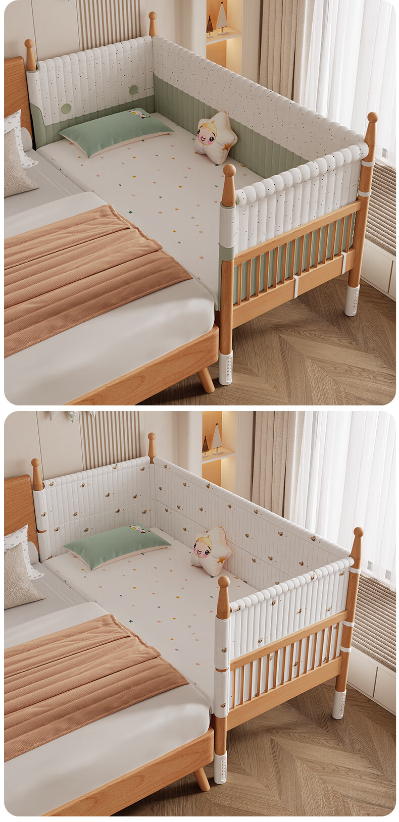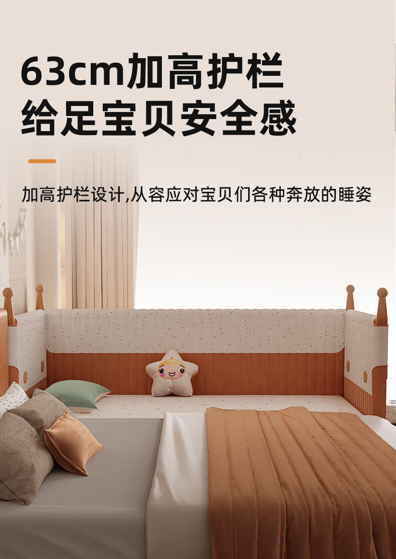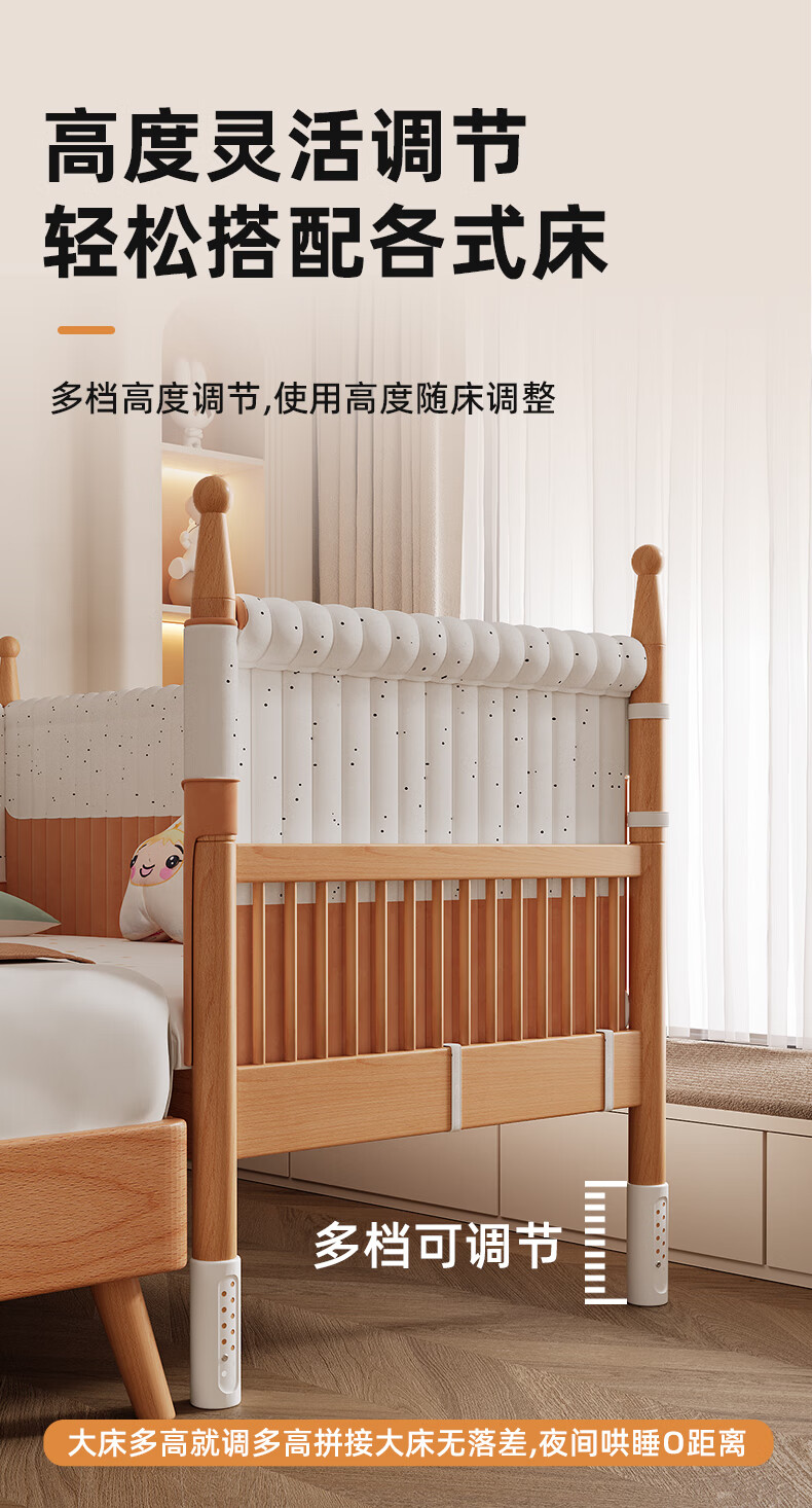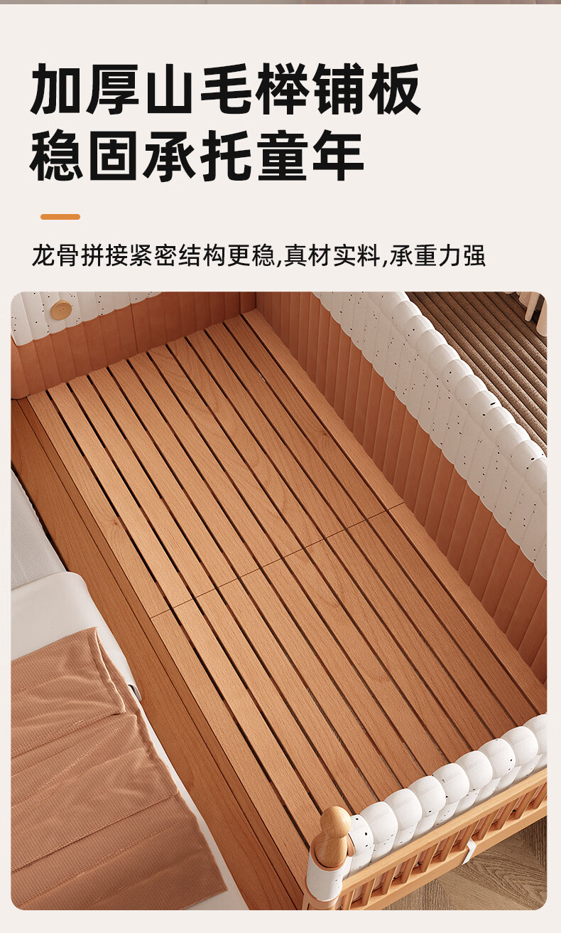 枫眠榉木婴儿拼接床实木加高带护栏加宽床大人可睡小床宝宝儿童床 床+牛油果绿床围+6cm椰棕乳胶垫 180x80cm