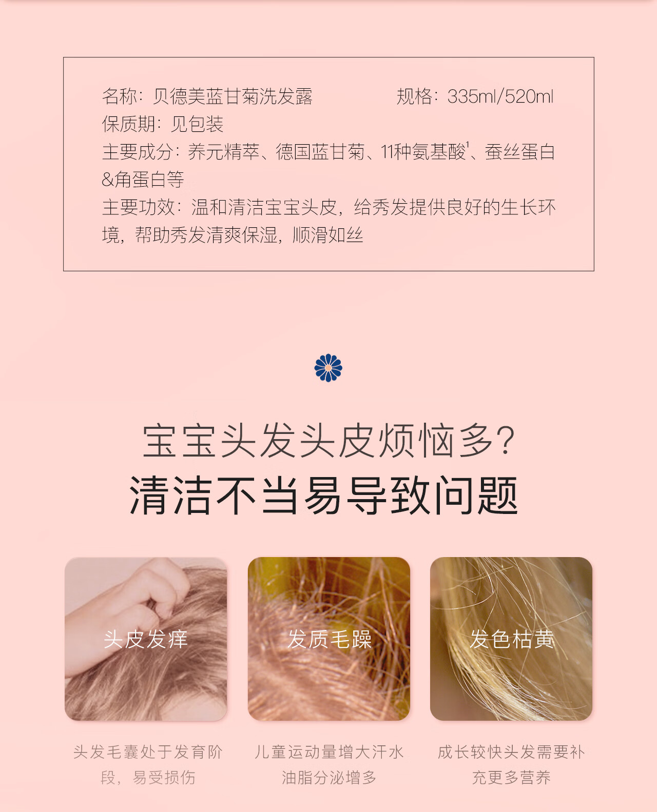 贝德美蓝甘菊儿童洗发水护发素 3-4-6-12岁氨基酸无硅油男女孩520ml套装