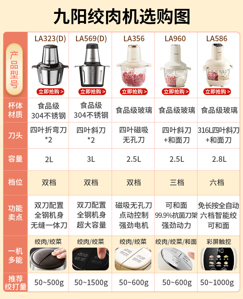 九阳(Joyoung)绞肉机家用 辅食机婴儿绞馅机 碎肉机多功能料理搅拌打蒜器电动 搅肉机2L S18-LA323