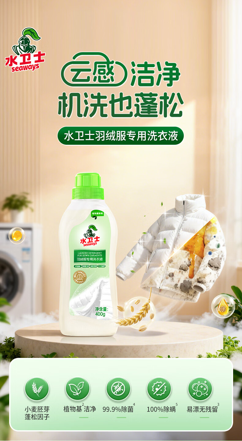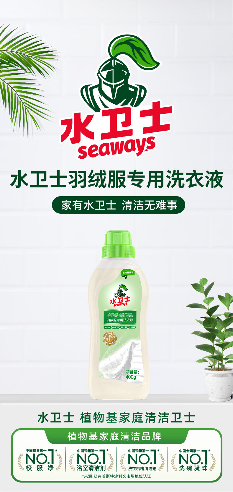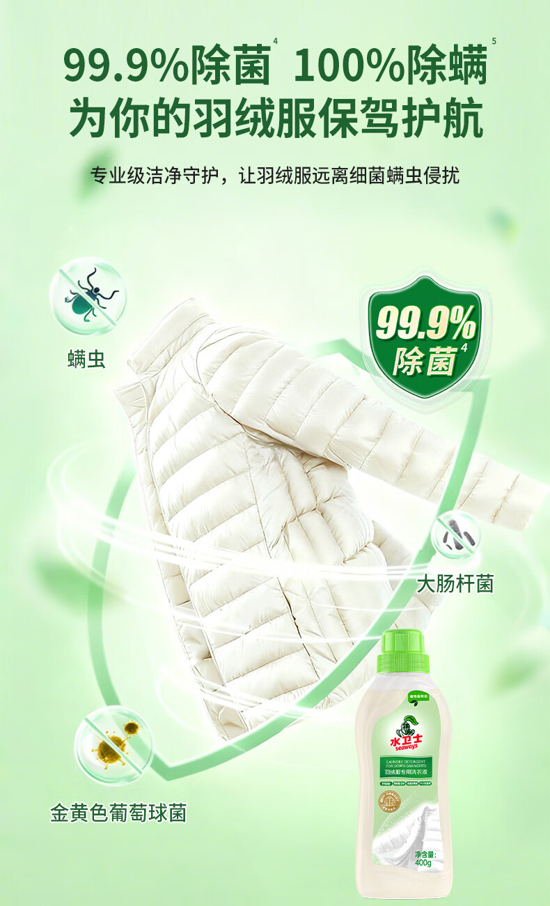 水卫士羽绒服专用洗衣液 机洗不伤羽绒服清洁去黄去污渍去油洗白 【去污护绒】2瓶*400g