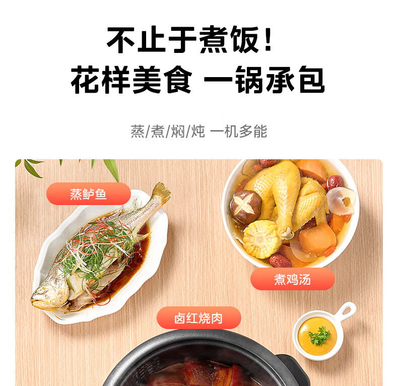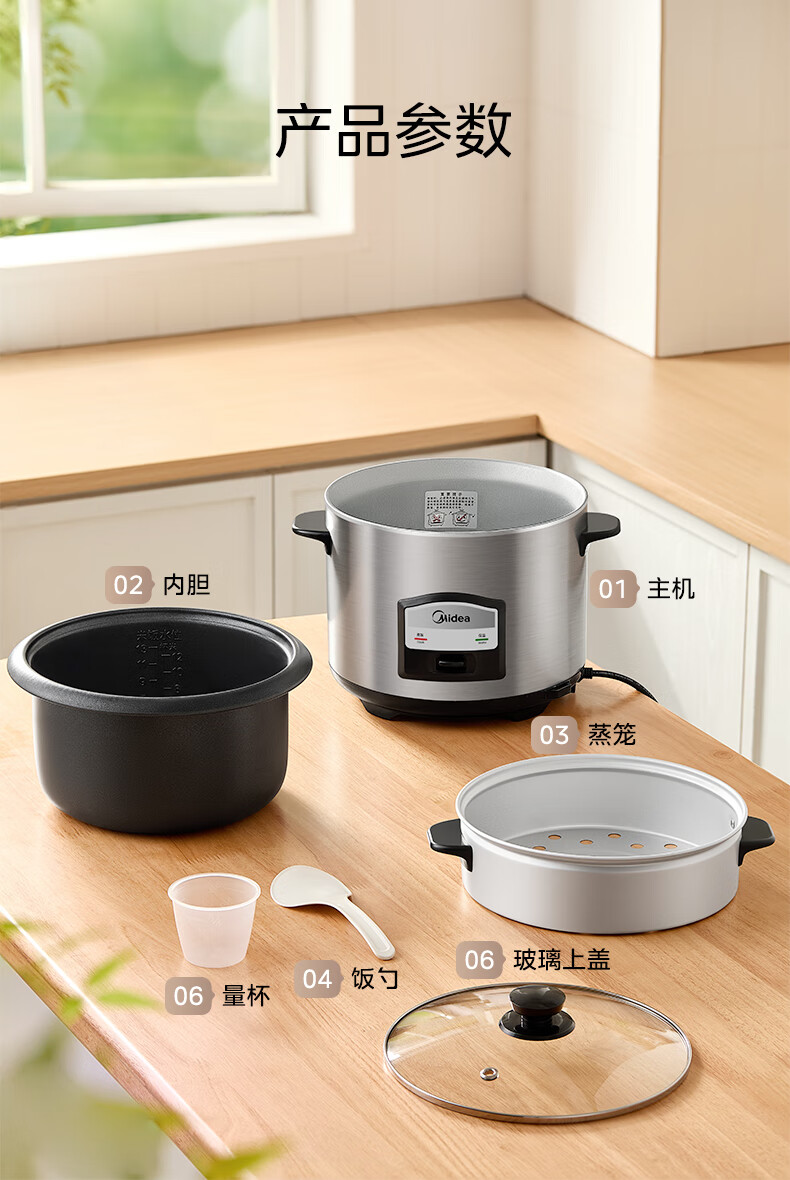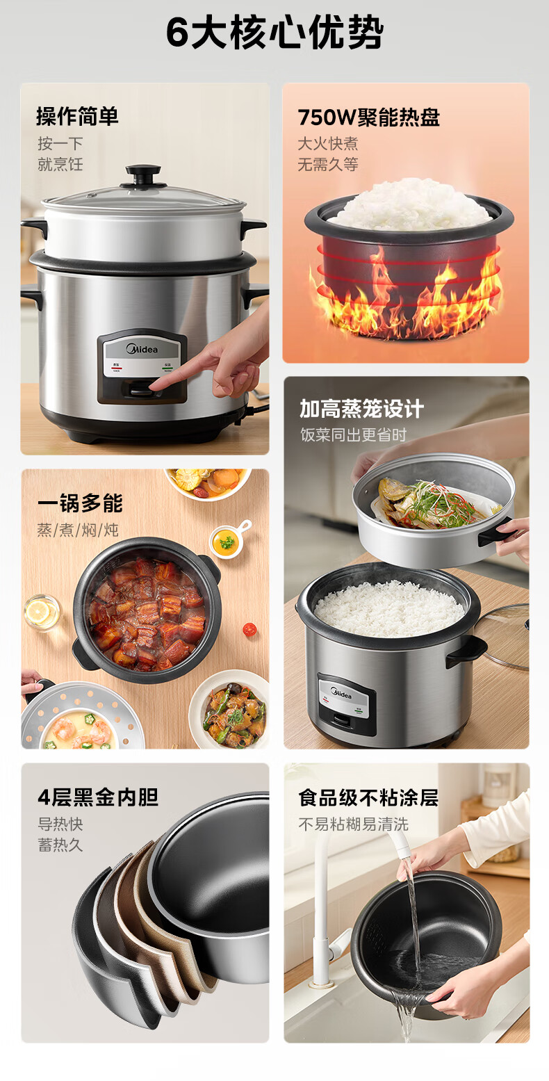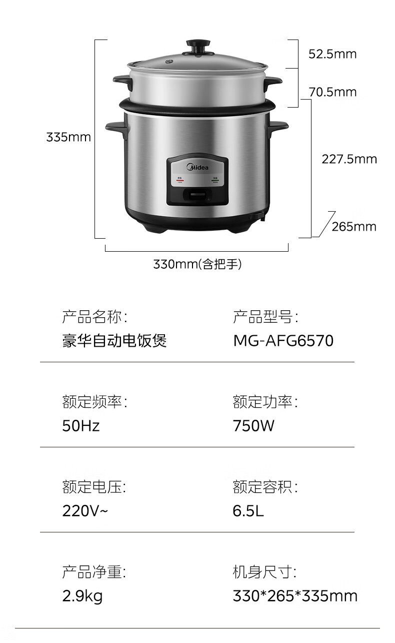 美的(Midea)电饭煲家用双层蒸煮多功能电饭锅小米粥煮粥煮饭锅带蒸笼老人用老式机械电饭煲4.5L MG-AFG4570 6.5L 【升级容量】适合6-10人