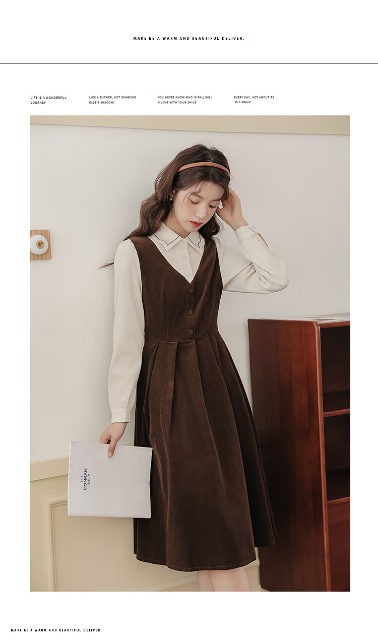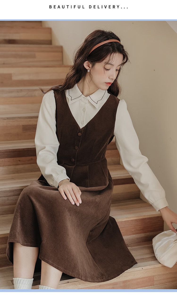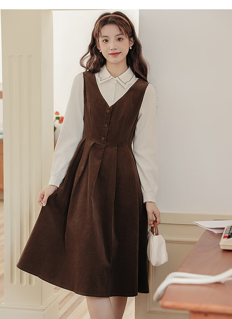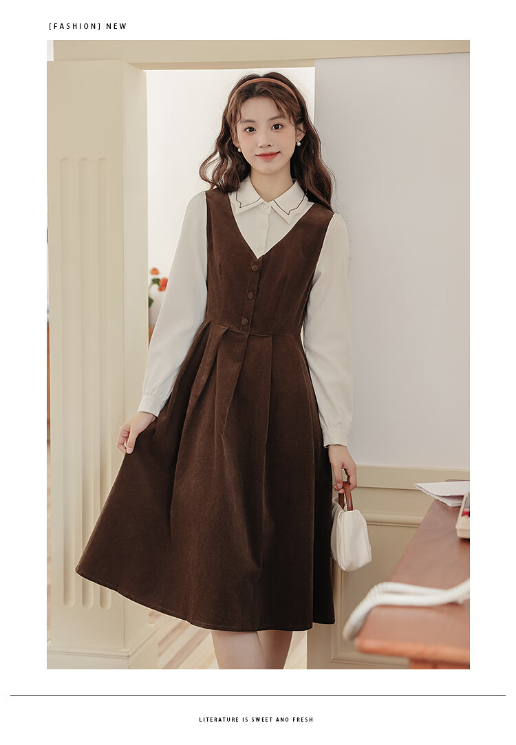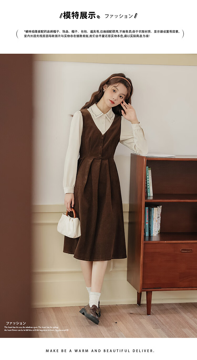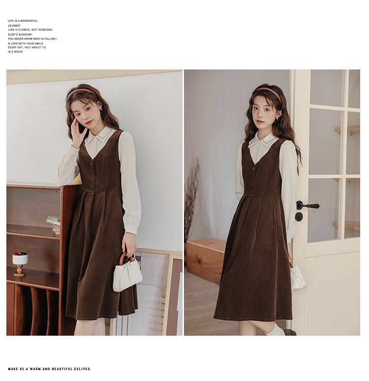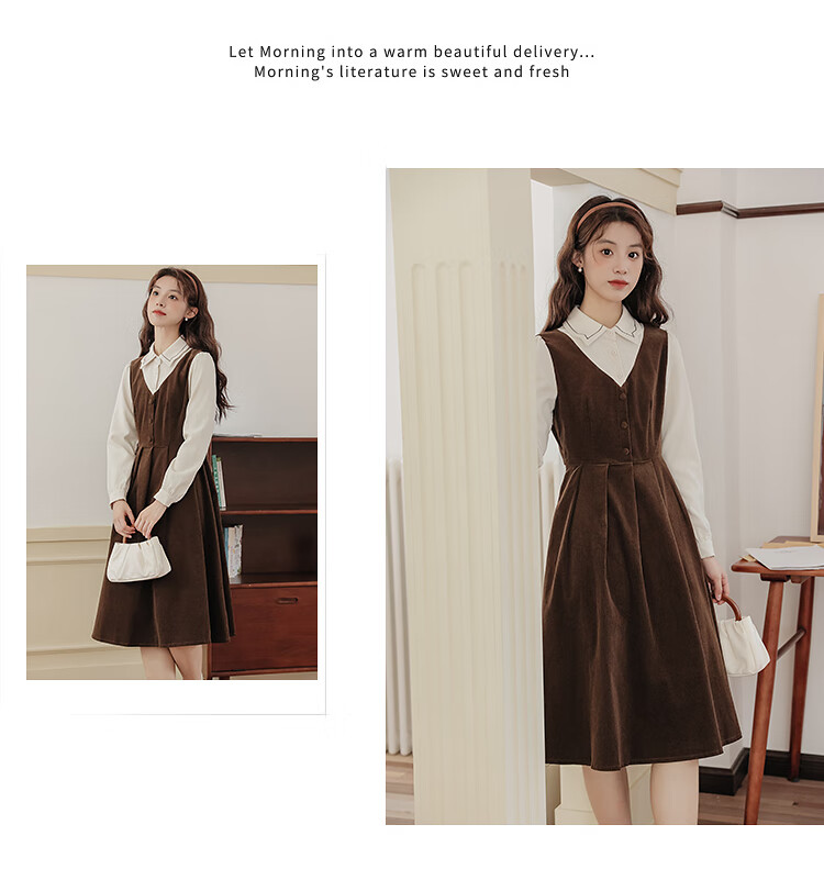 西遇(Westlink)西遇收腰假两件连衣裙女2025年秋季新款长袖衬衫领灯芯绒背带裙 棕色 (预售15天) M (160)