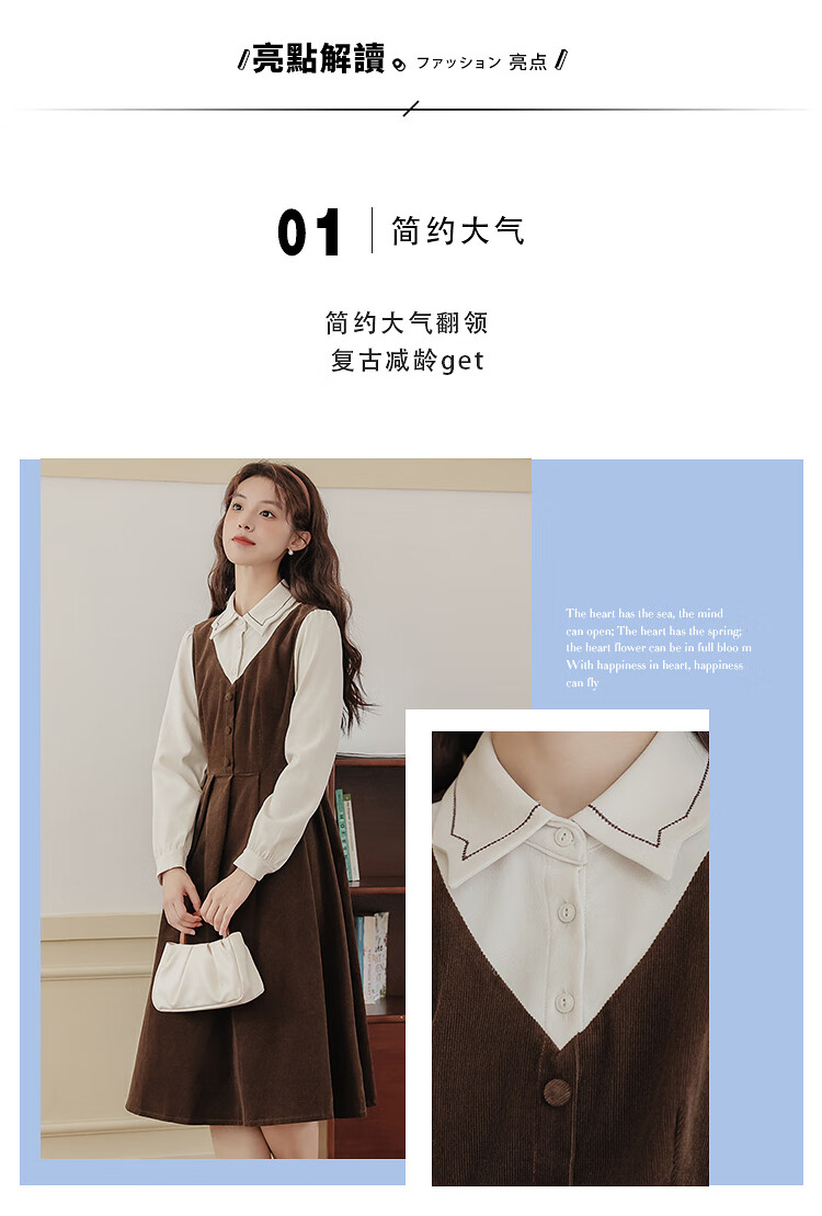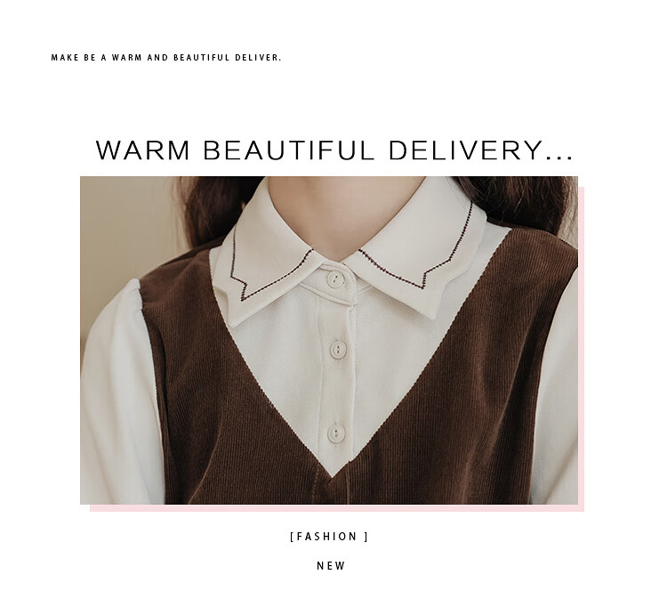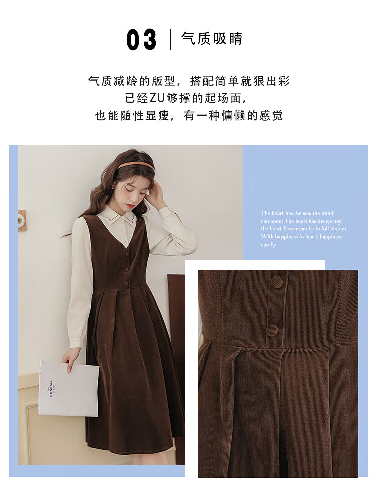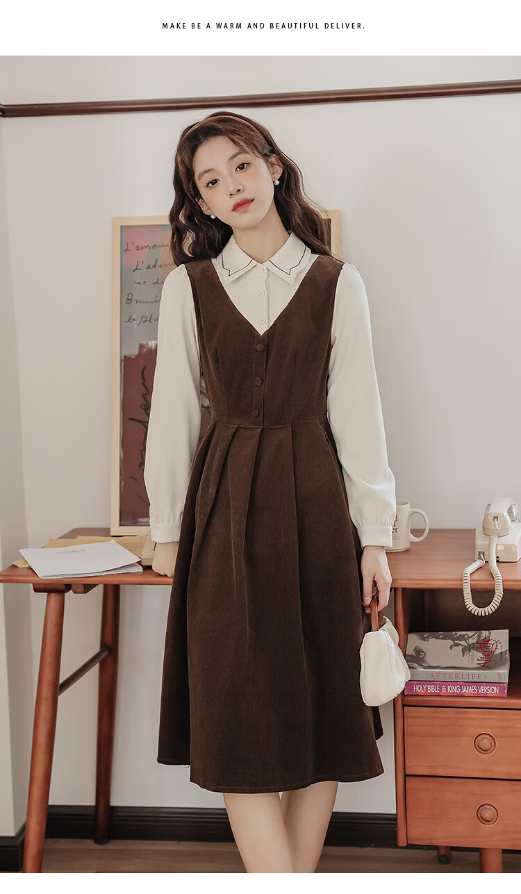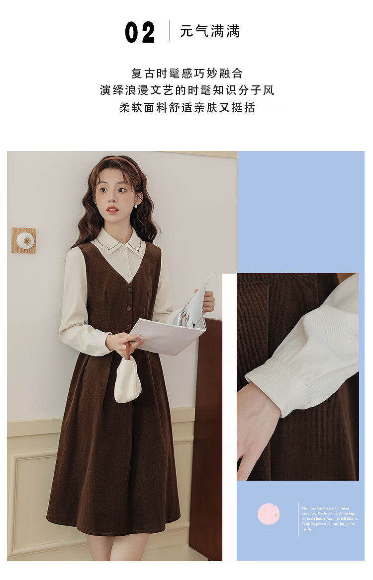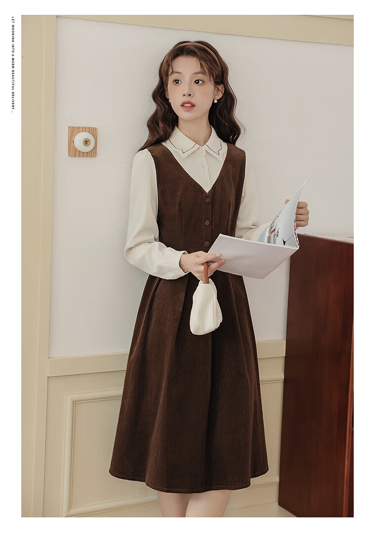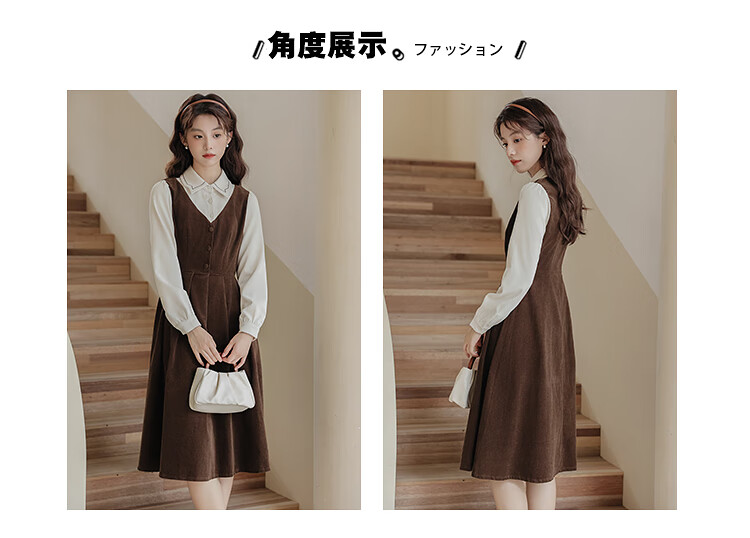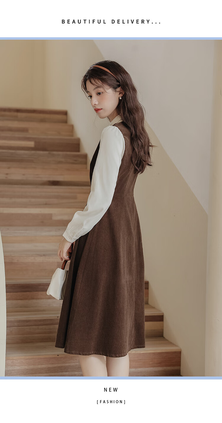 西遇(Westlink)西遇收腰假两件连衣裙女2025年秋季新款长袖衬衫领灯芯绒背带裙 棕色 (预售15天) M (160)
