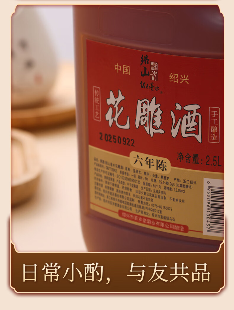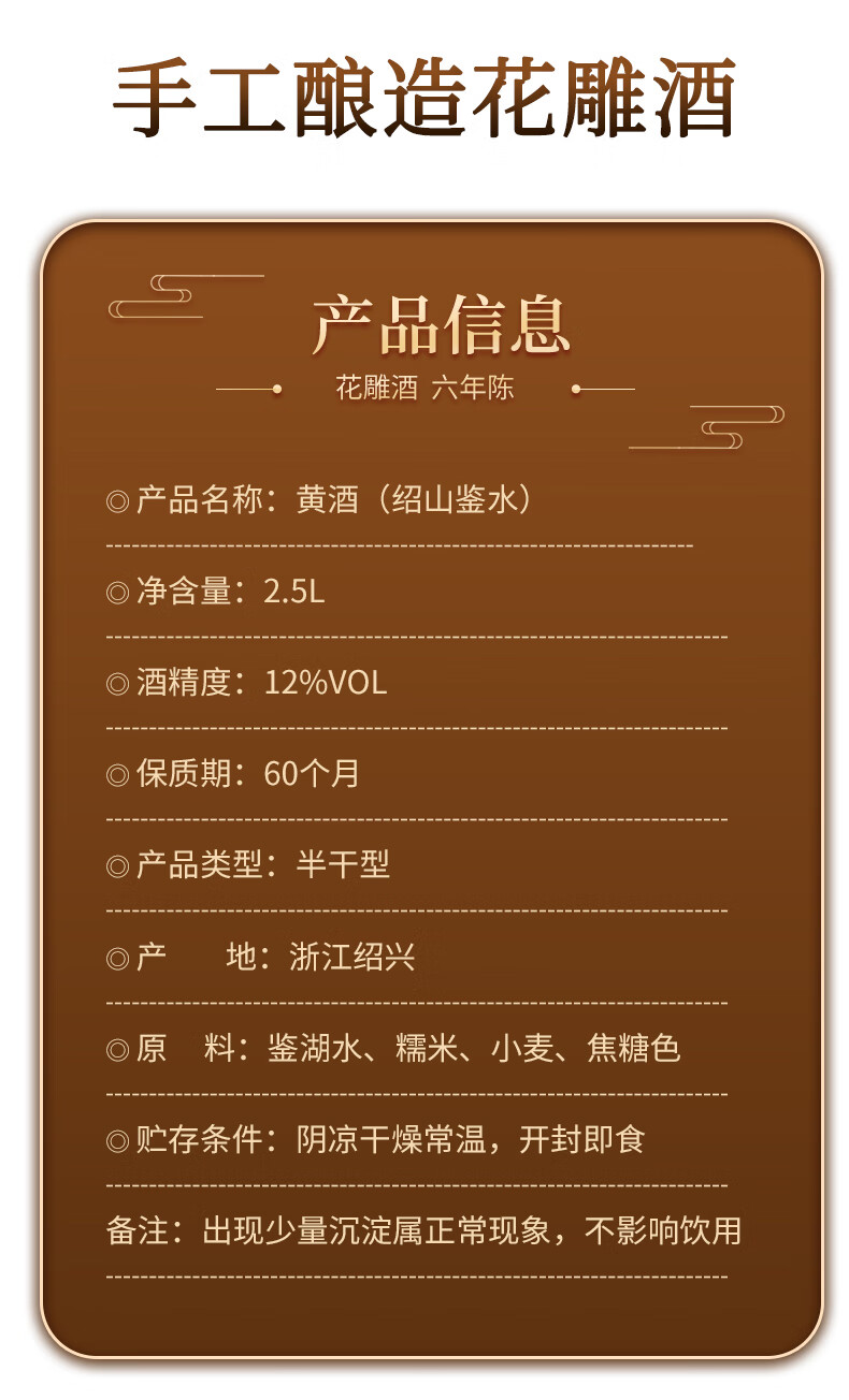 绍山鉴水黄酒六年陈自饮花雕酒绍兴半干型2.5L桶装糯米酒家用厨用料酒