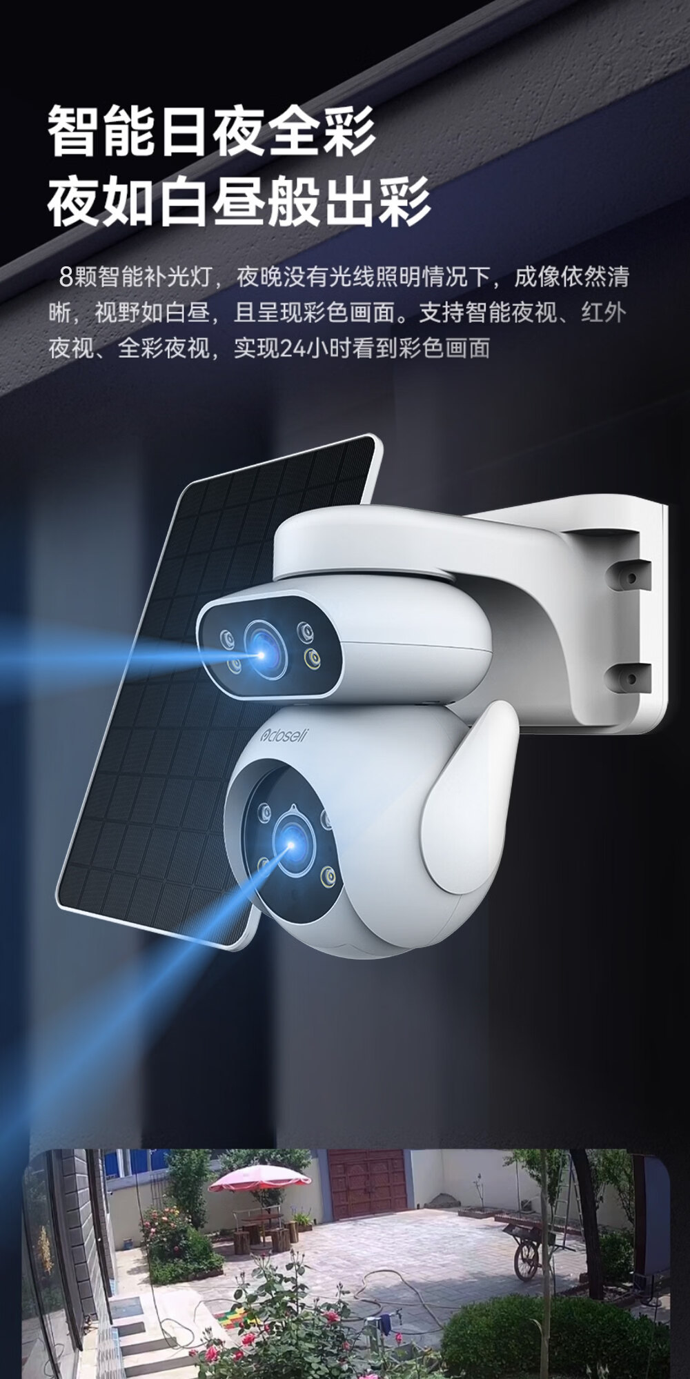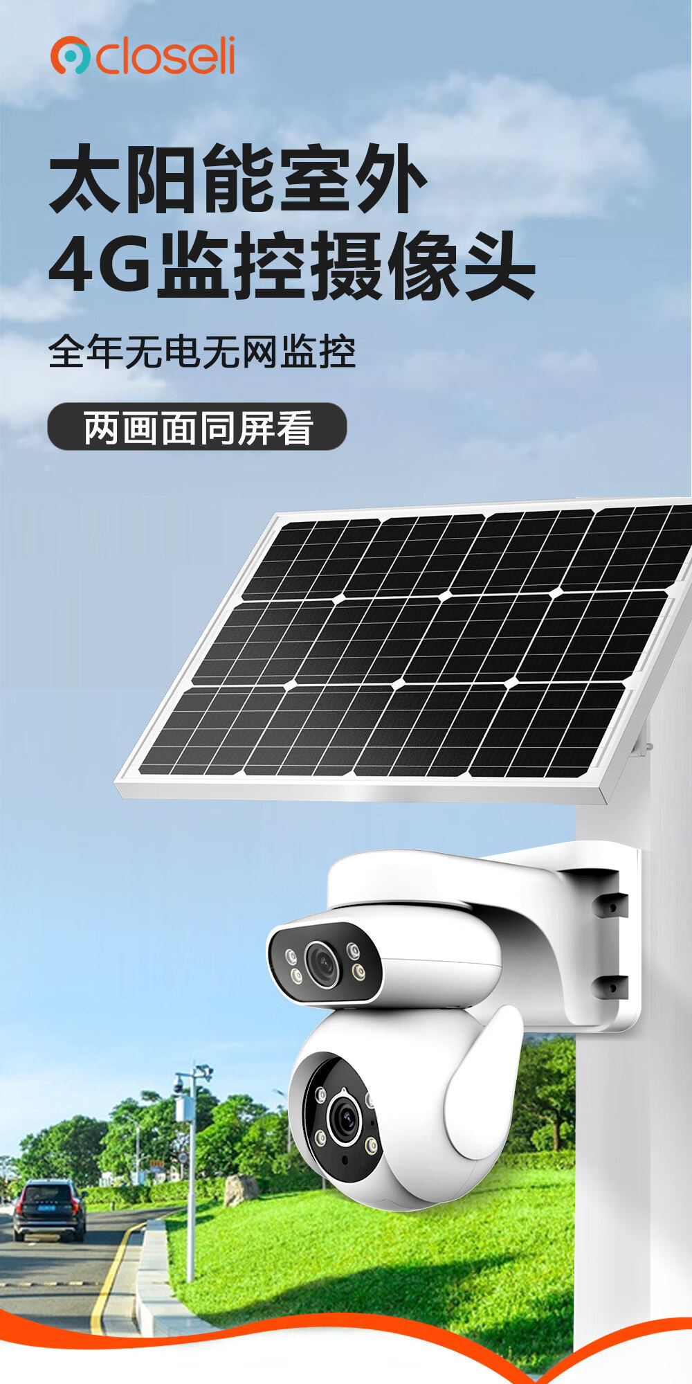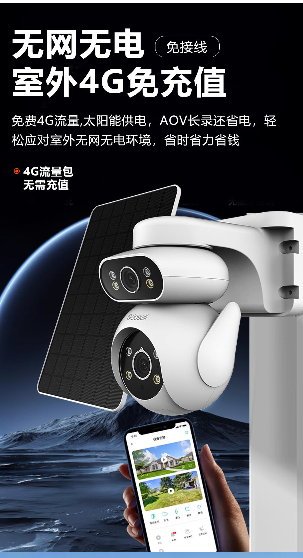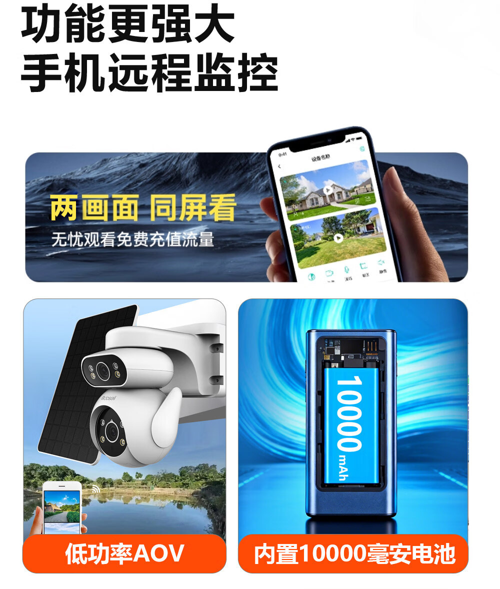 可梨免充值太阳能板4G无线室外监控摄像头手机远程摄影机插卡免流量监控器360度全景高清双镜头低功耗 [太阳能套装]【4G免充值】500万高清*无电无网 30天监控高速循环录像卡