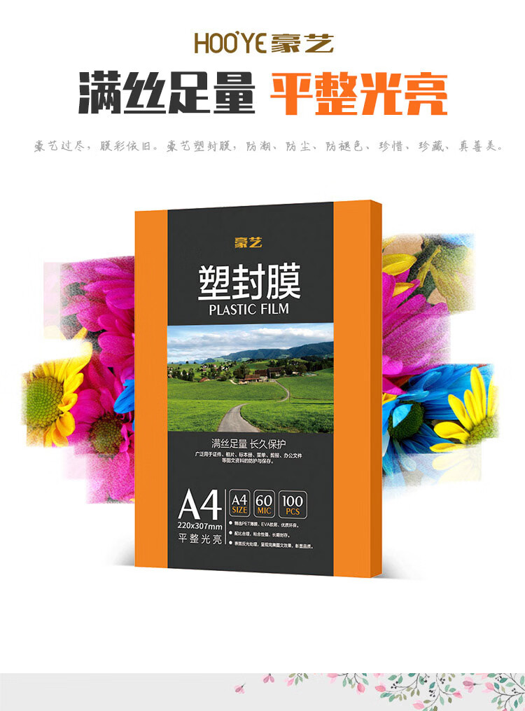 豪艺(HOOYE)A4 60mic塑封膜文件照片高清透明护卡膜塑封机过塑膜高性价比6丝