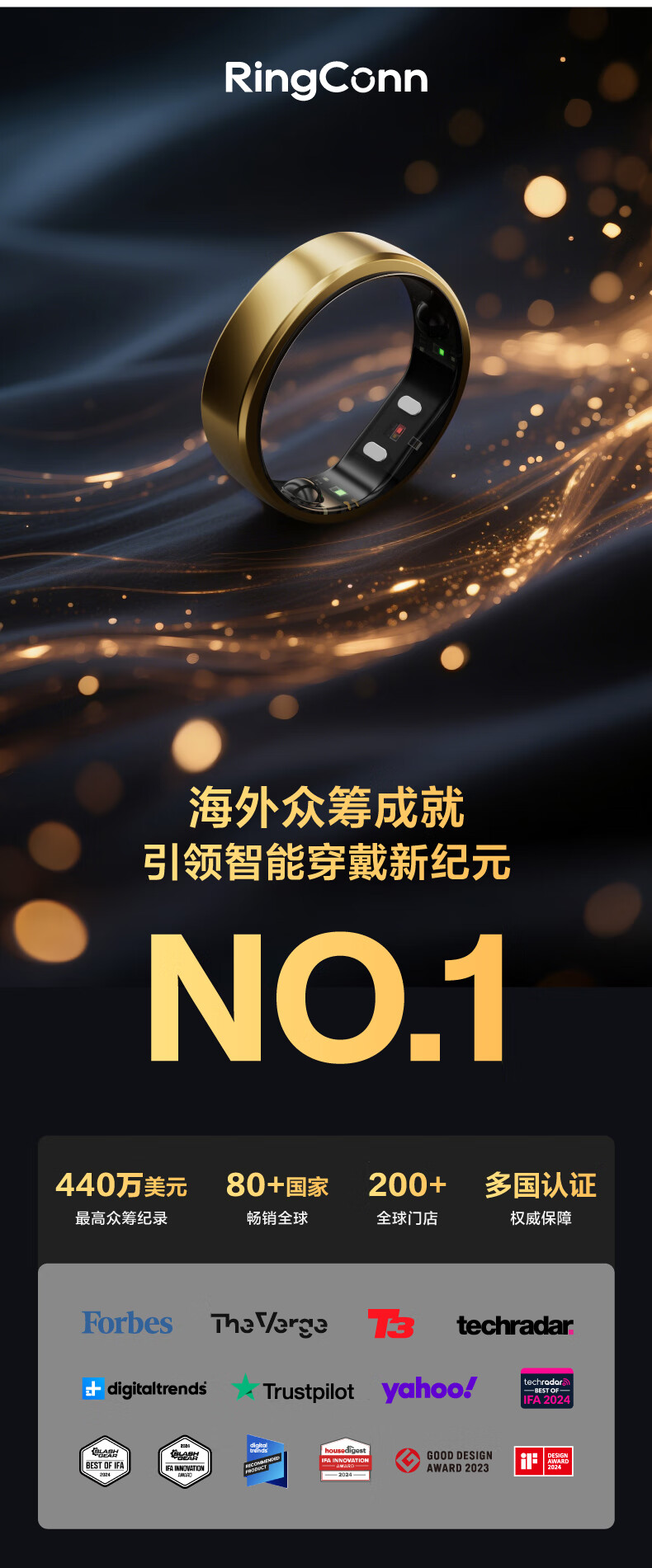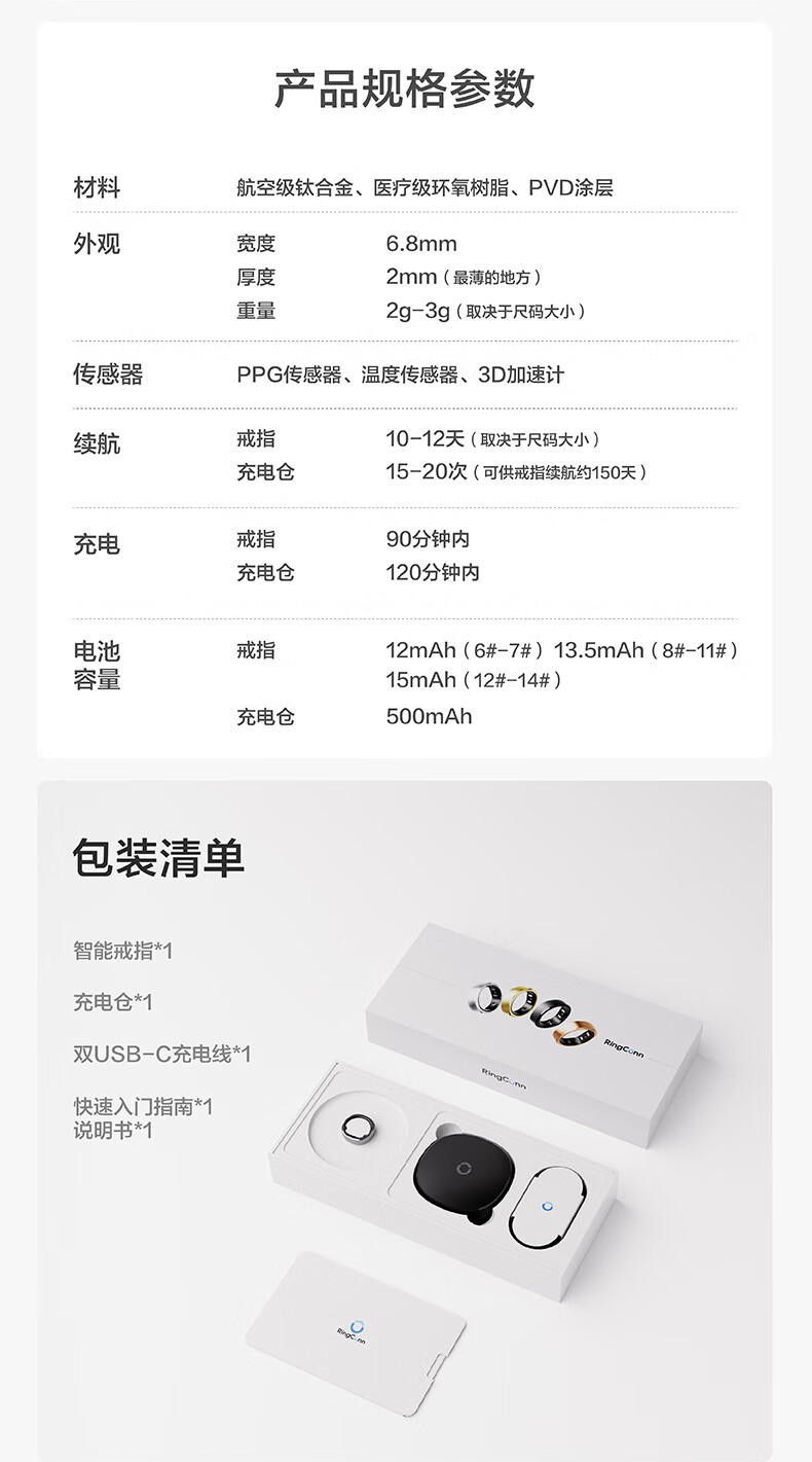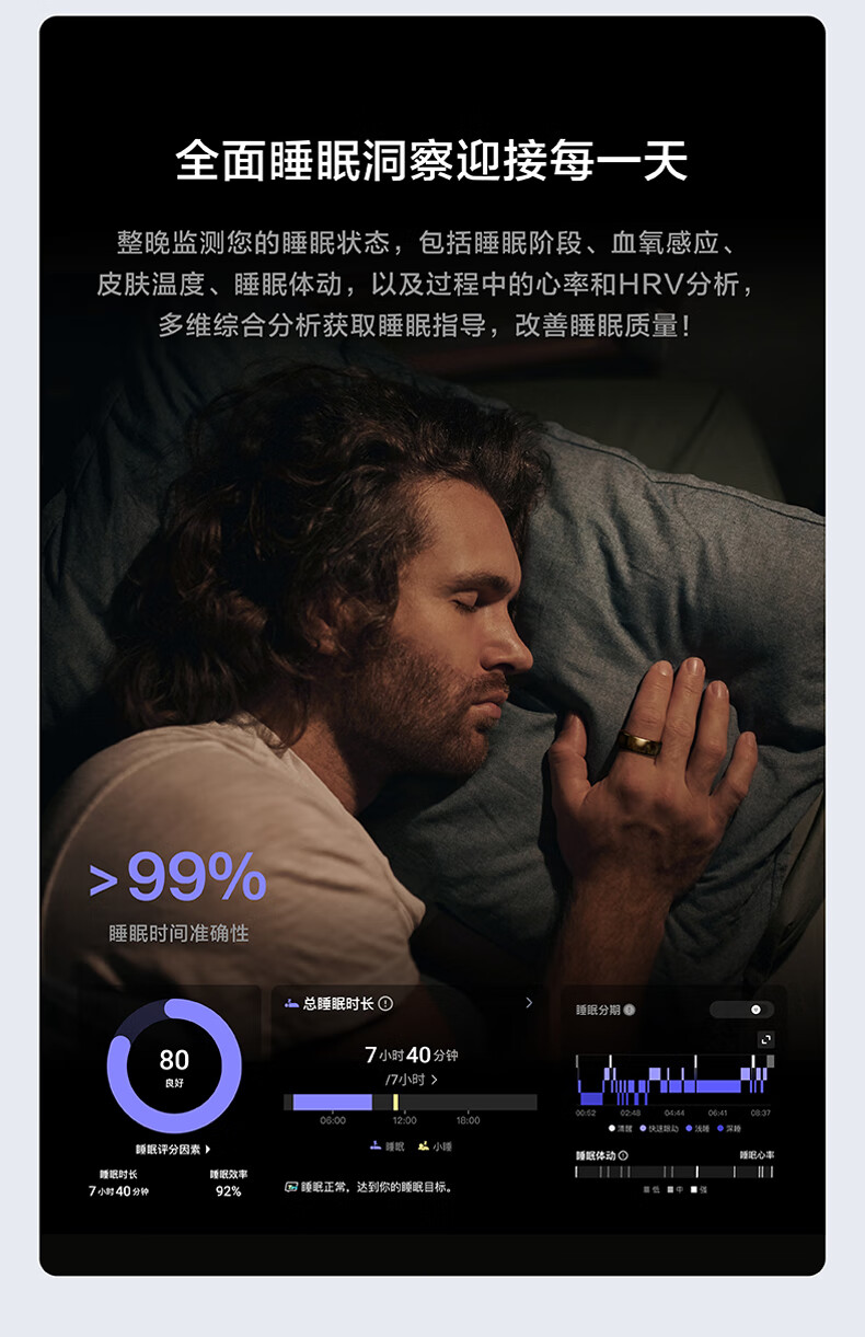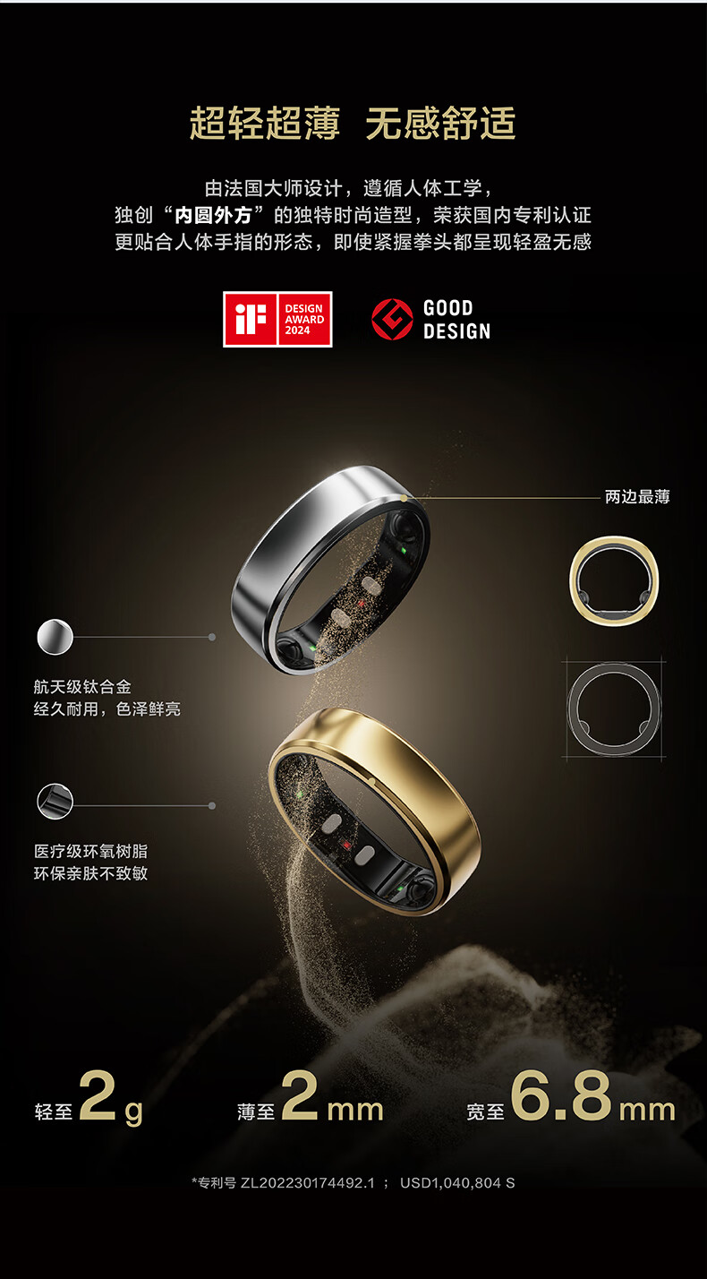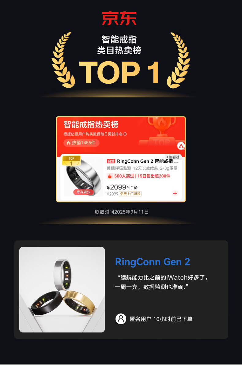 RingConn Gen 2 智能戒指 睡眠呼吸暂停监测心率异变血氧女性生理期预测 健康指导12天长续航 未来银9号