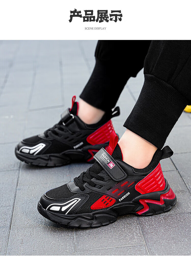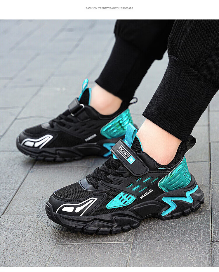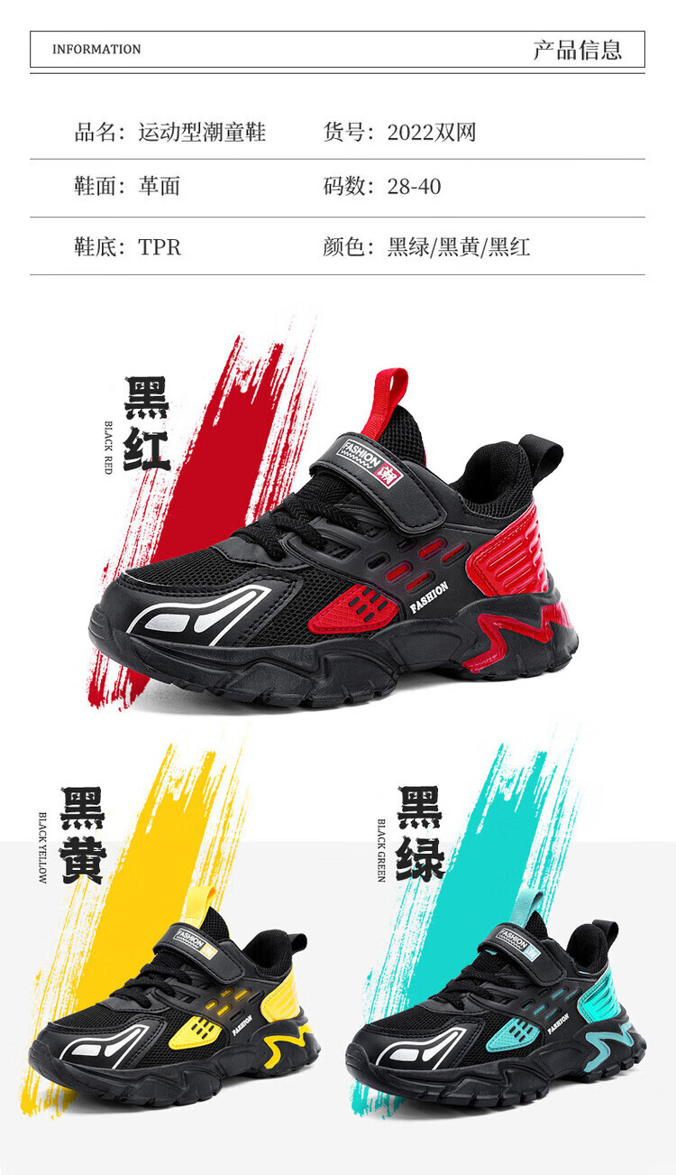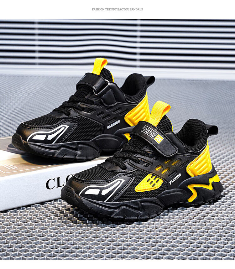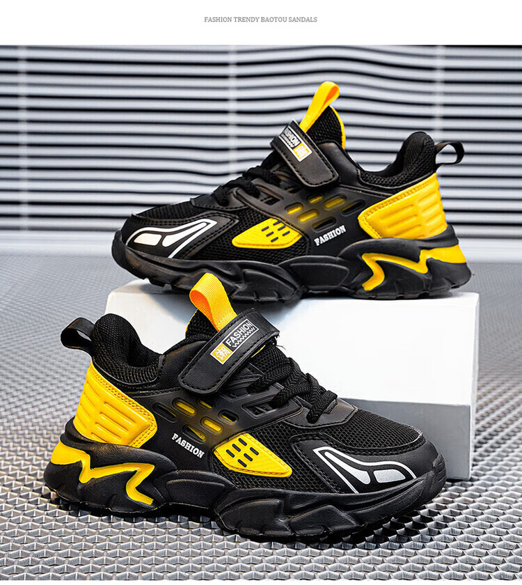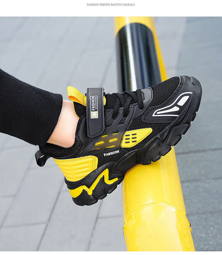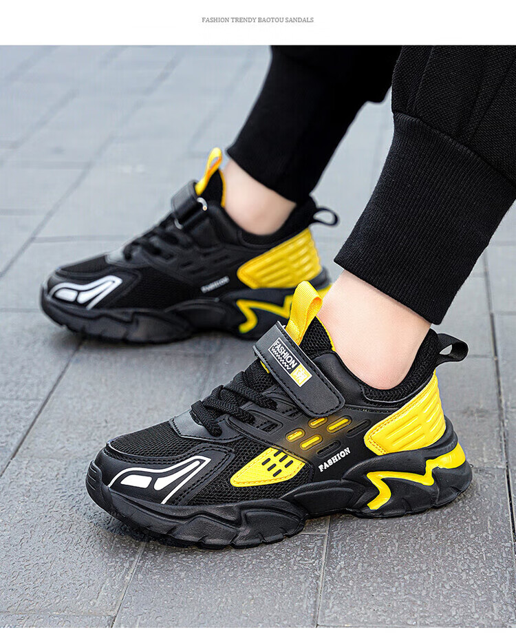 贝天熊儿童运动鞋秋冬款中大童透气网面跑步运动鞋男女童革面魔术贴童鞋 BJL2022黑黄【四季革面】 37 内长23.3/脚22.3