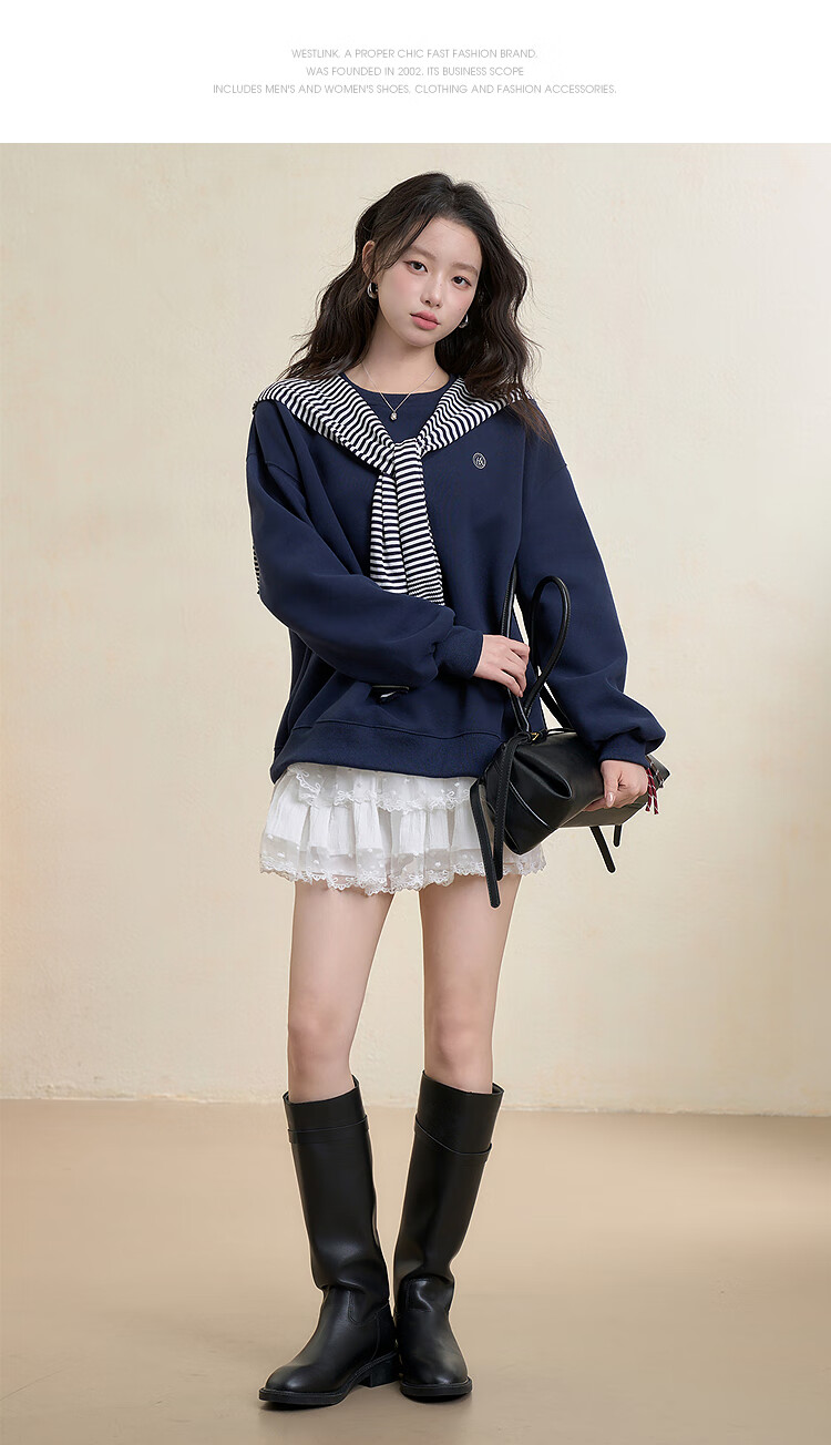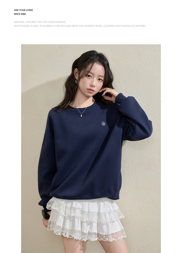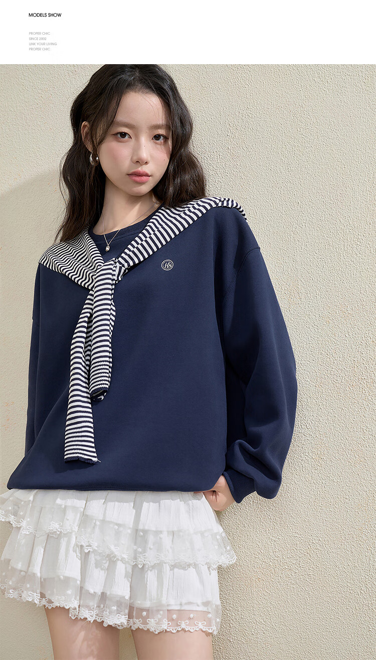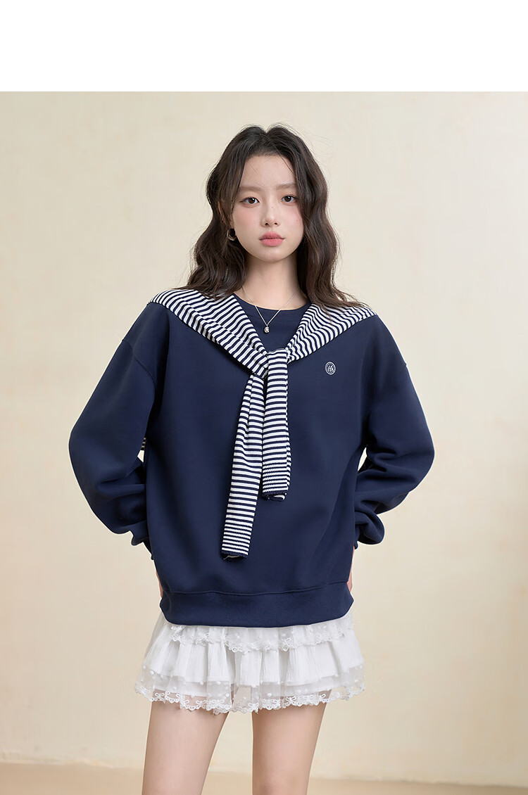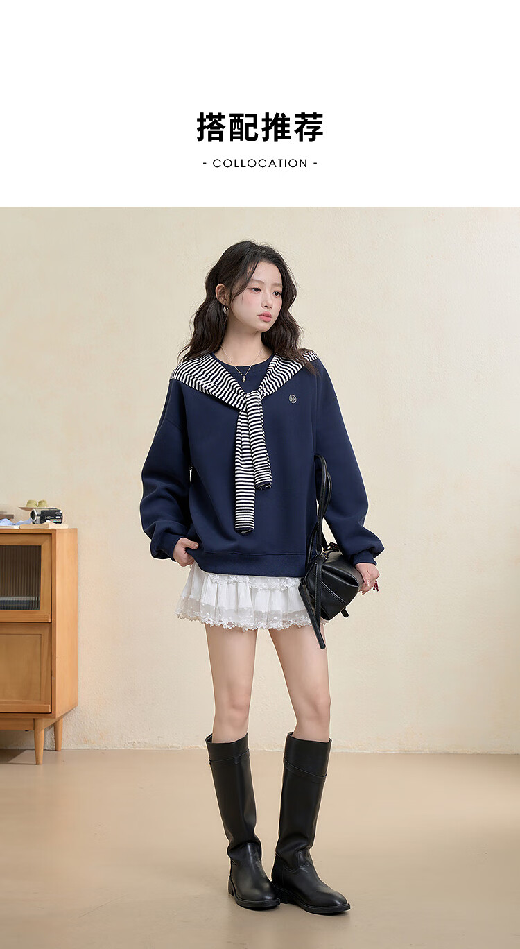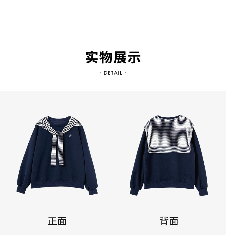 西遇(Westlink)西遇宽松圆领卫衣女秋季新款学院风条纹披肩叠穿长袖上衣 宝蓝色 (预售15天) M (160)