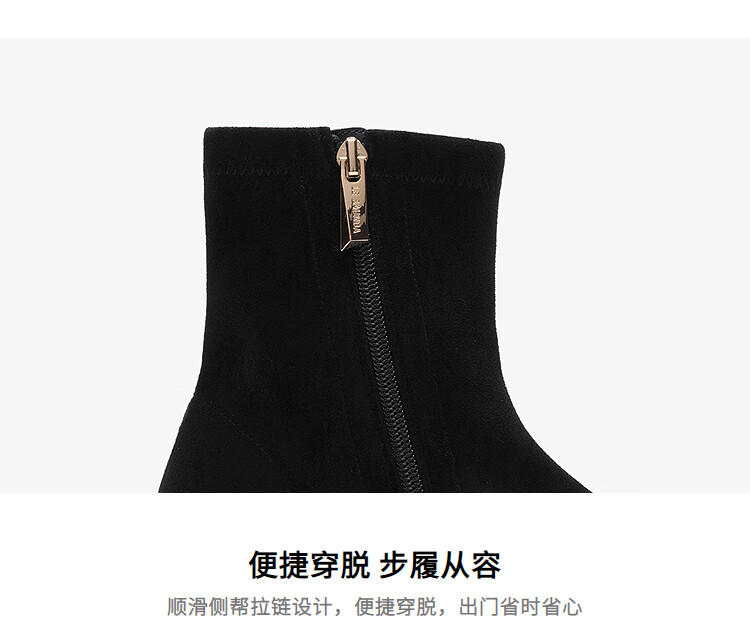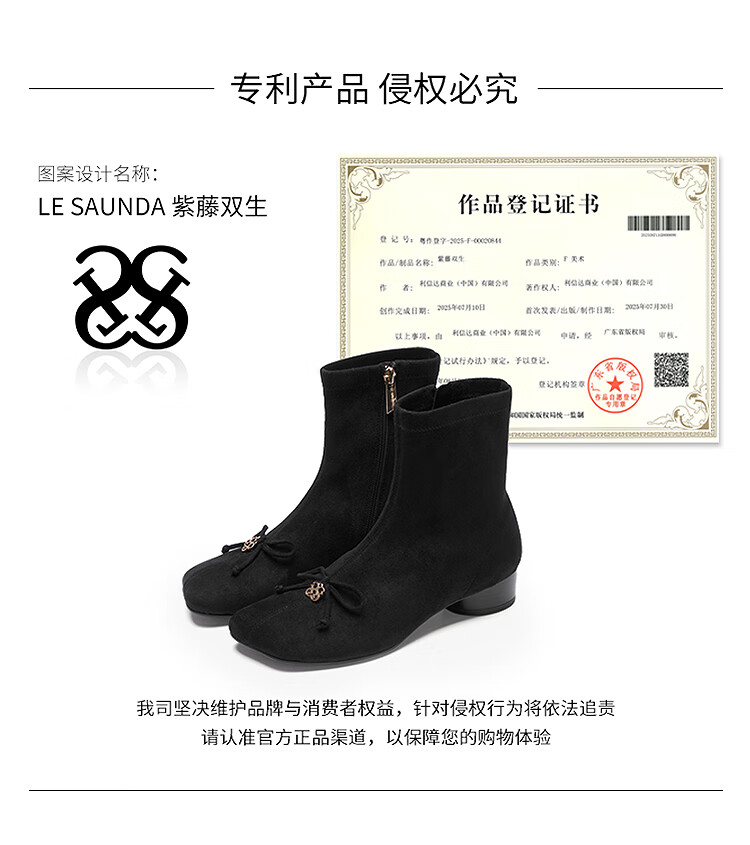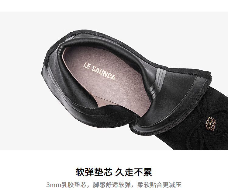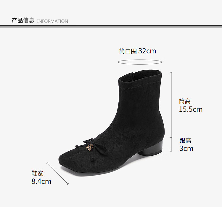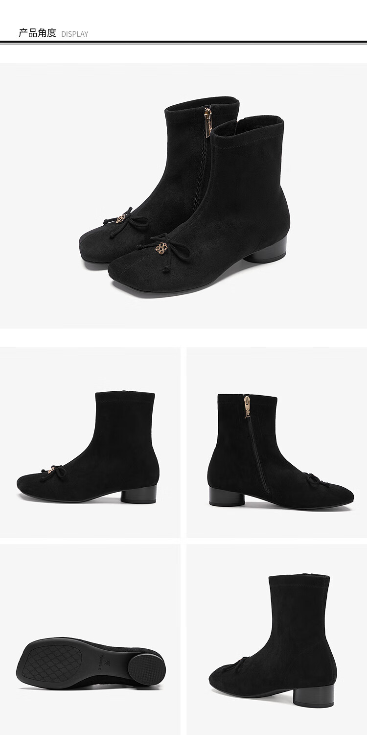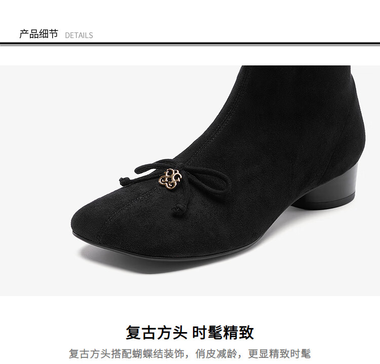 莱尔斯丹(le saunda)复古蝴蝶结时装靴2025秋冬新款时尚通勤粗跟瘦瘦短靴女靴6T34504 松露黑 BKF 34