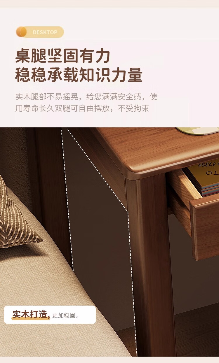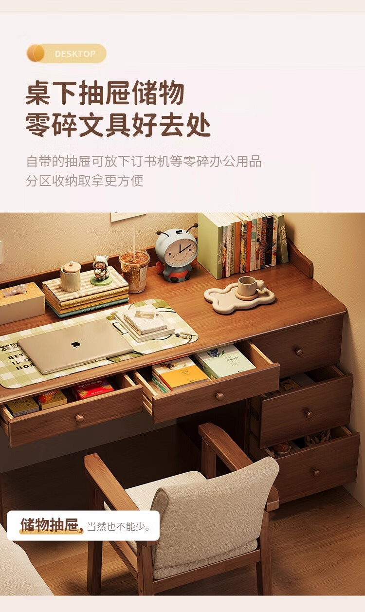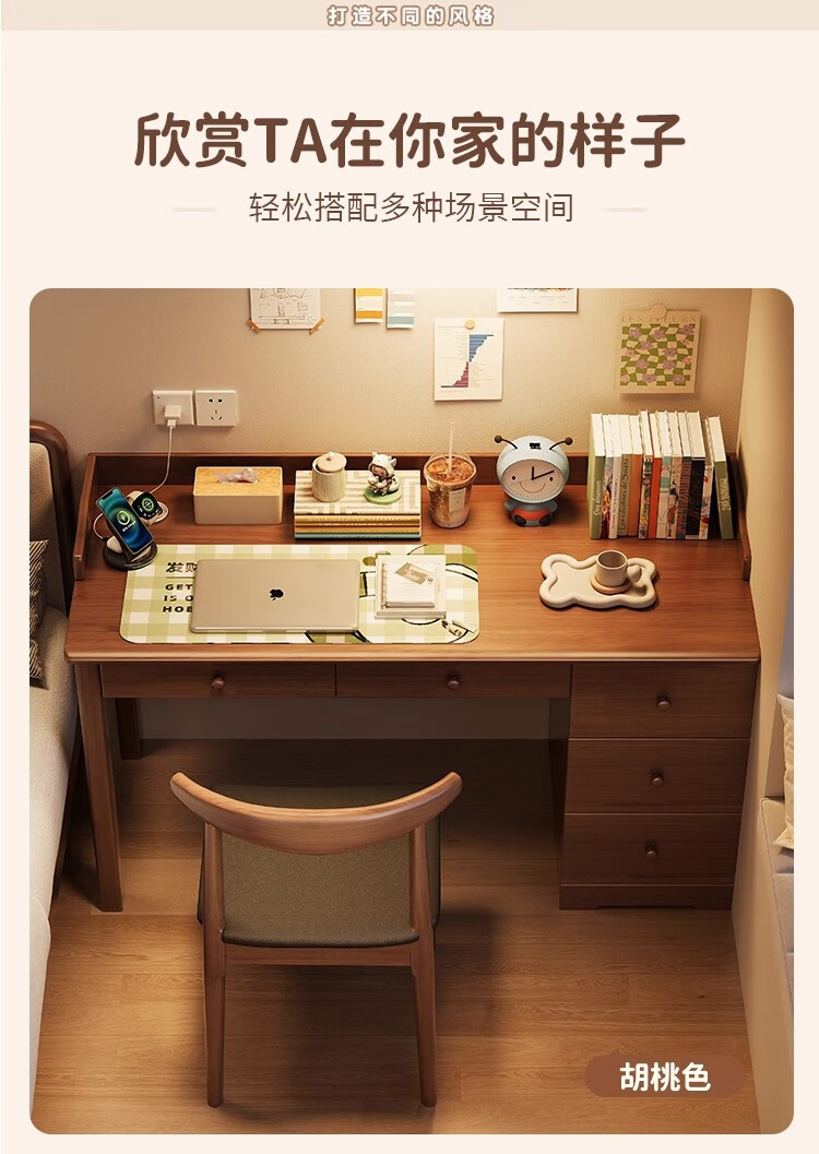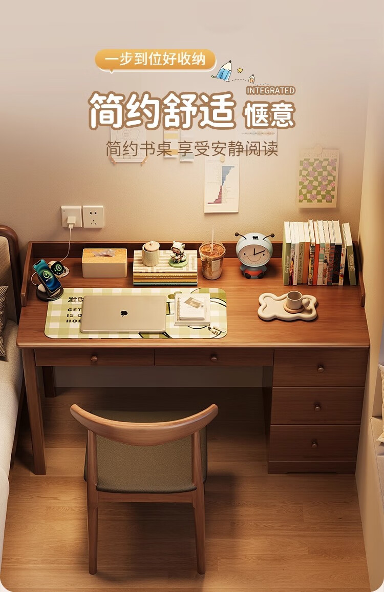 芈迪实木书桌书柜一体卧室家用电脑桌小户型学生学习桌写字桌办公桌 胡桃色单桌 100*60*75cm