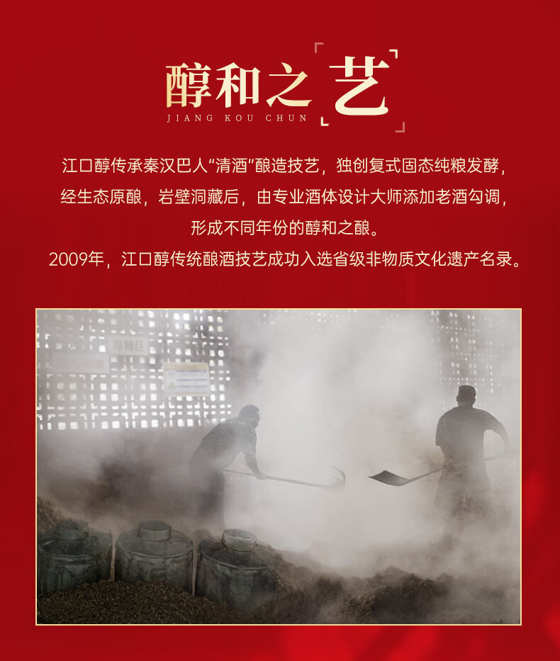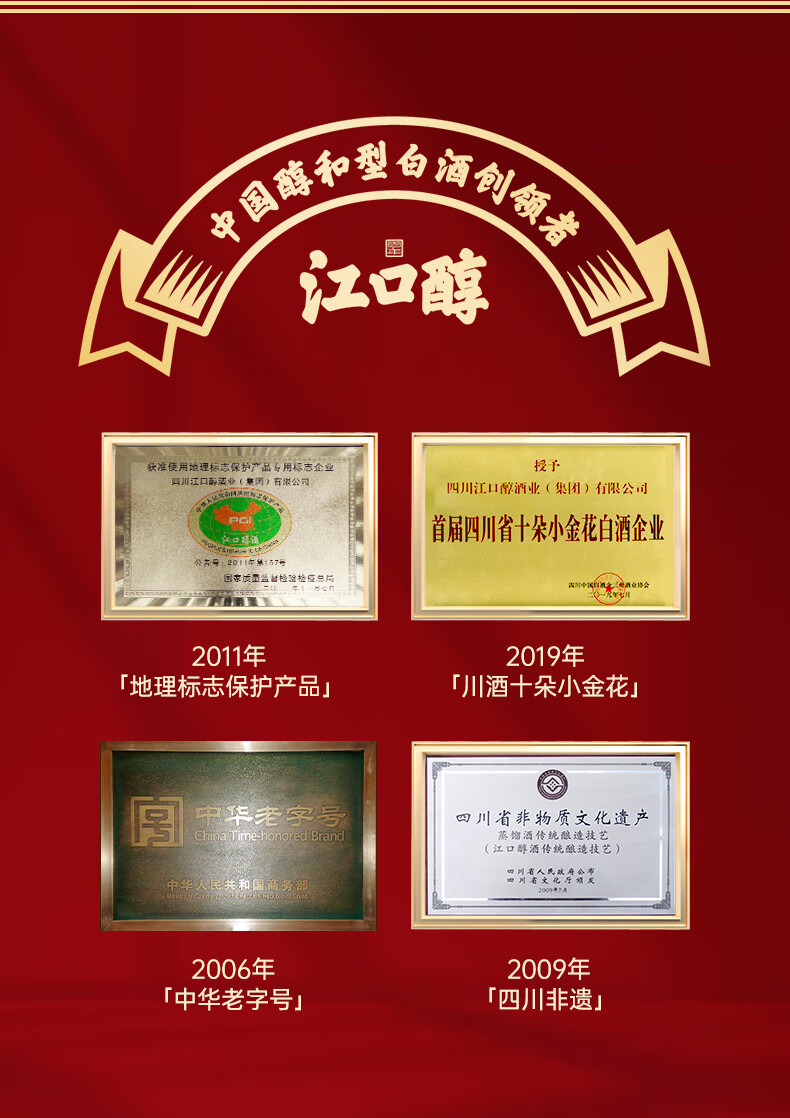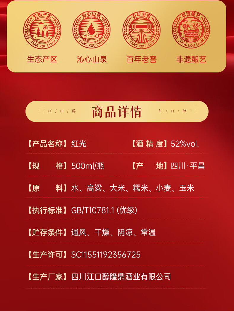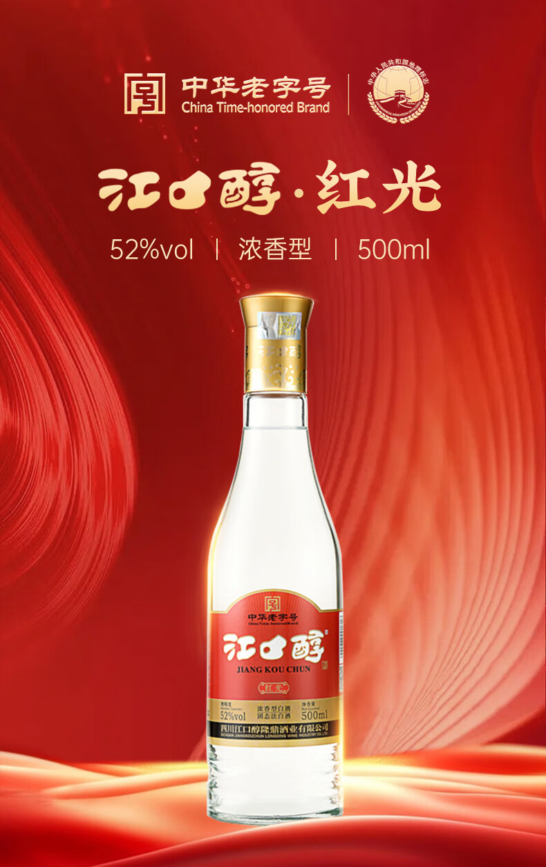 江口醇 红光 浓香型白酒 口粮光瓶酒 52度纯粮川酒 中华老字号 52度 500mL 6瓶