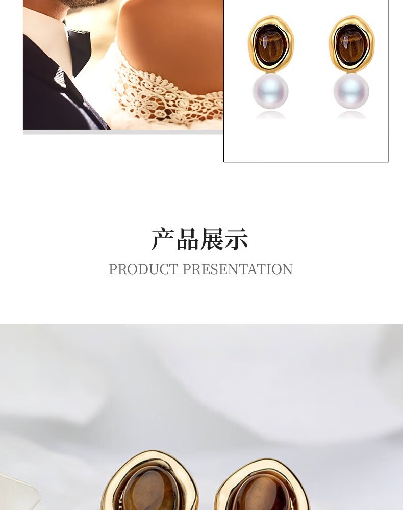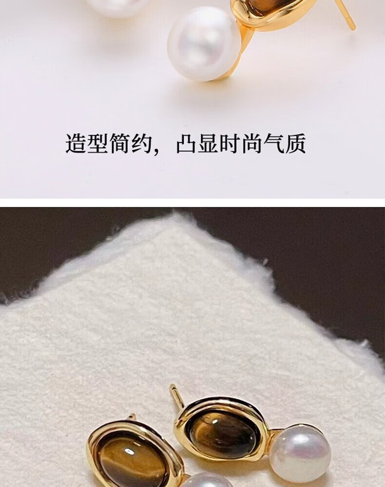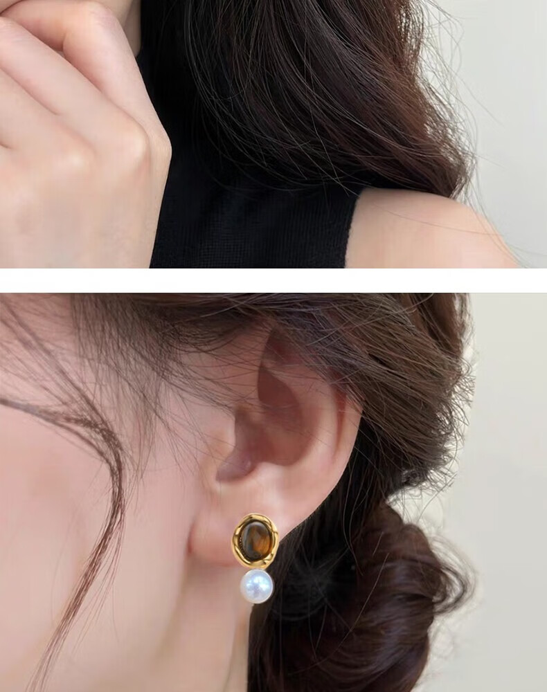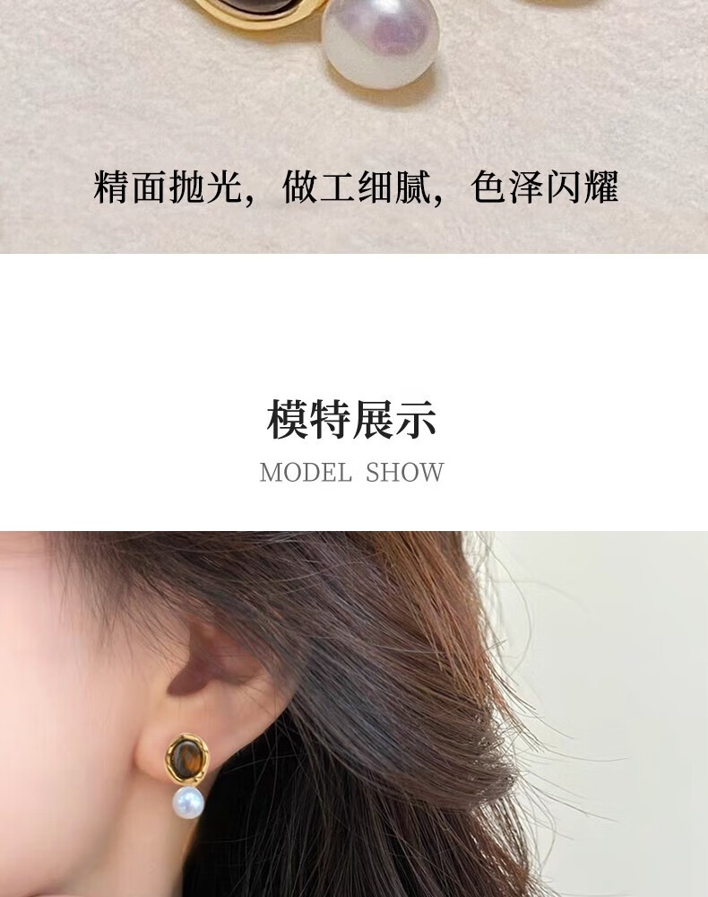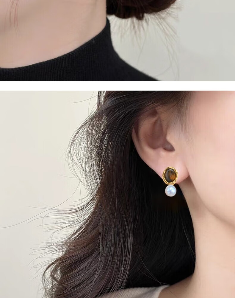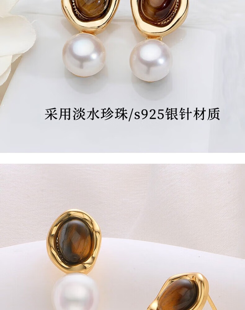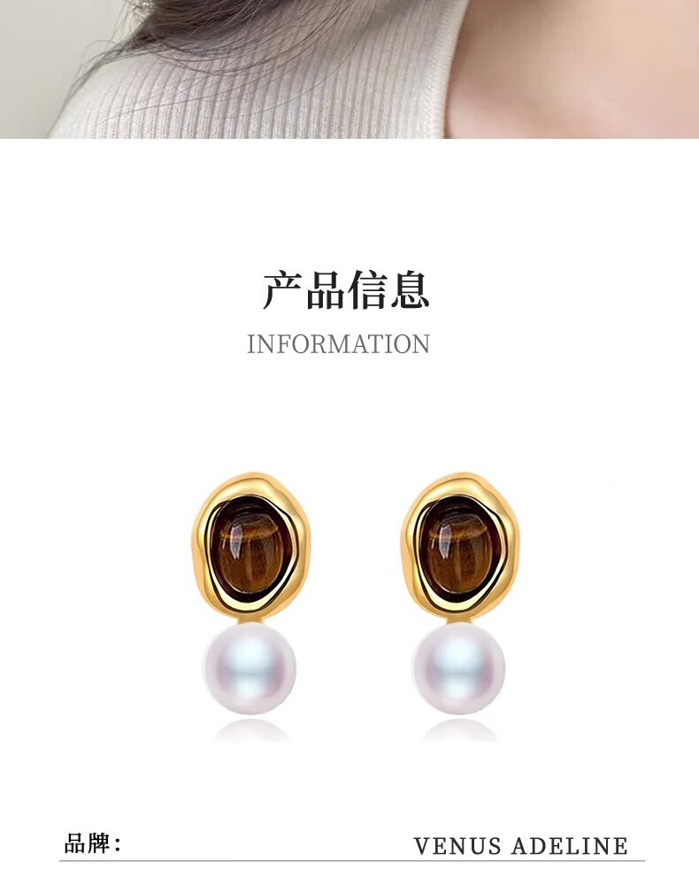 VENUS ADELINE淡水珍珠耳环女银针美拉德虎眼石耳钉复古耳饰轻奢高级感耳坠礼物 白色大颗粒珍珠送老婆生日礼物 银针首饰长辈实用浪漫纪念日礼盒