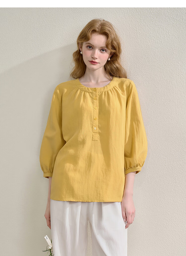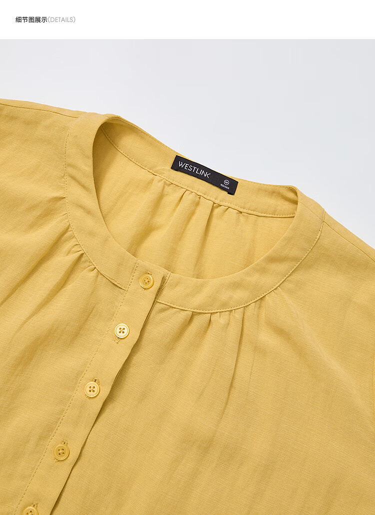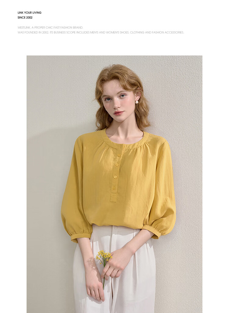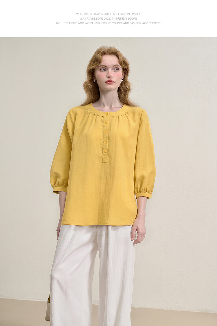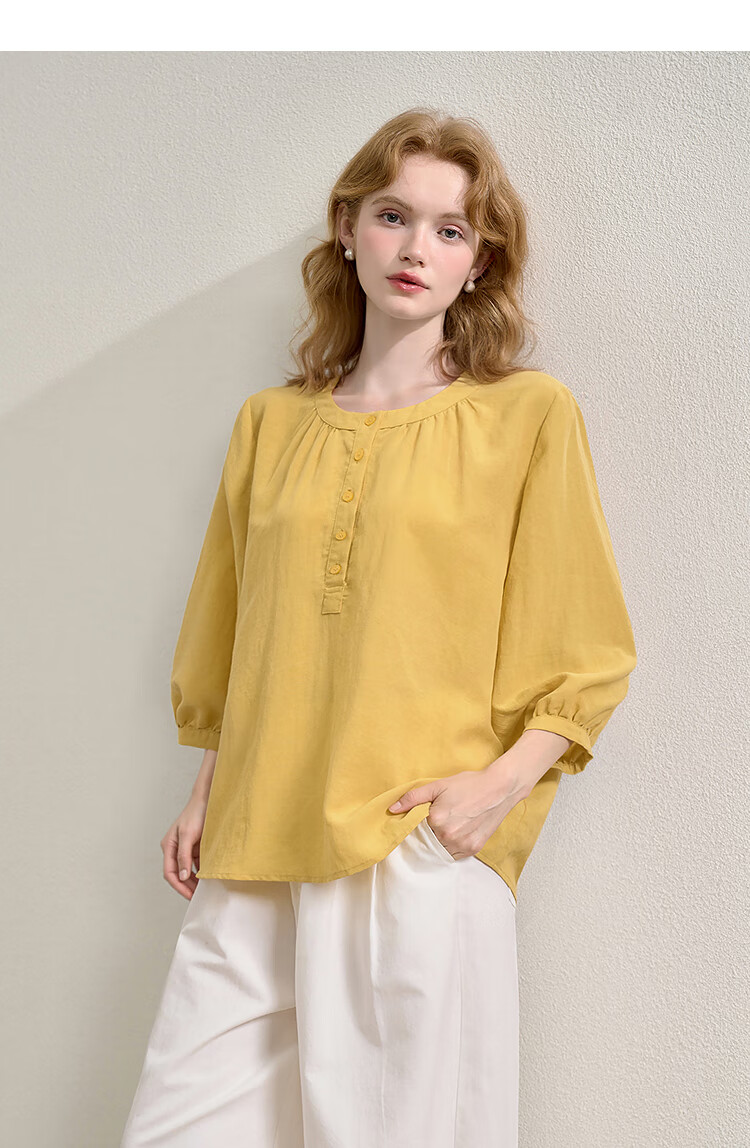 西遇通勤宽松圆领七分袖衬衫女2025夏季复古文艺百搭休闲衬衣 黄色 L (165)