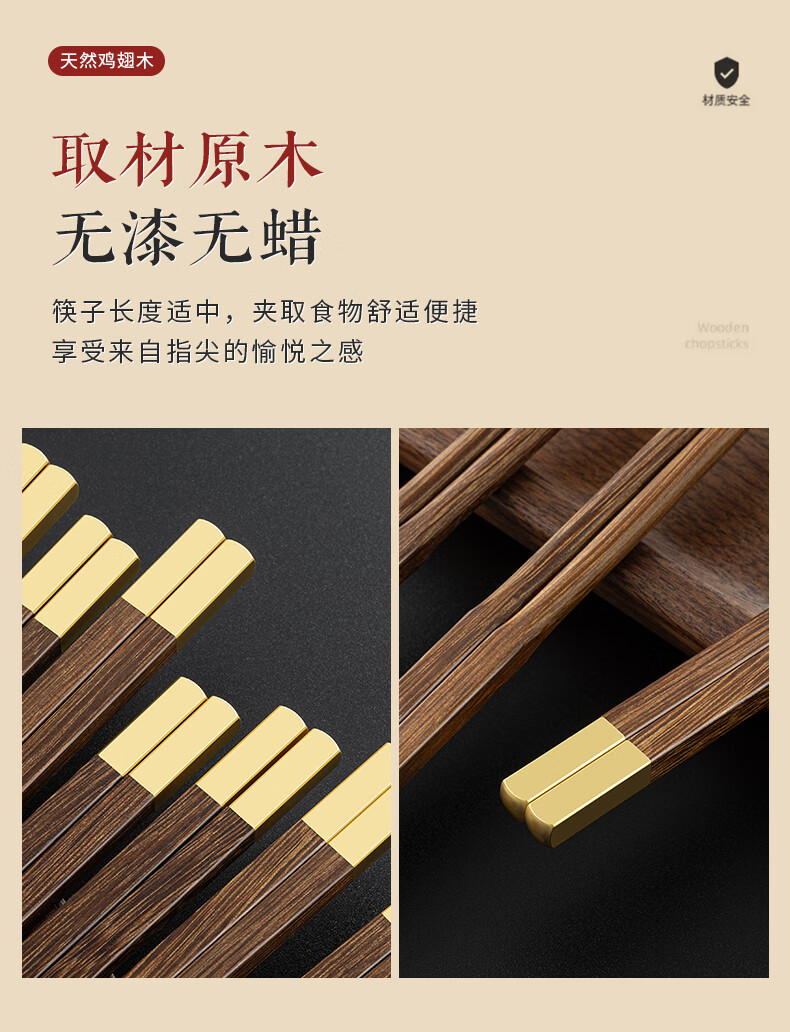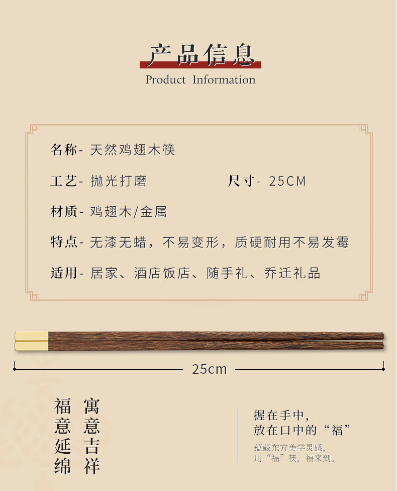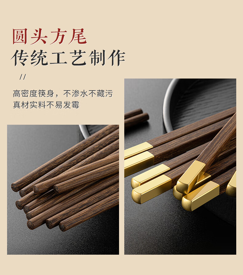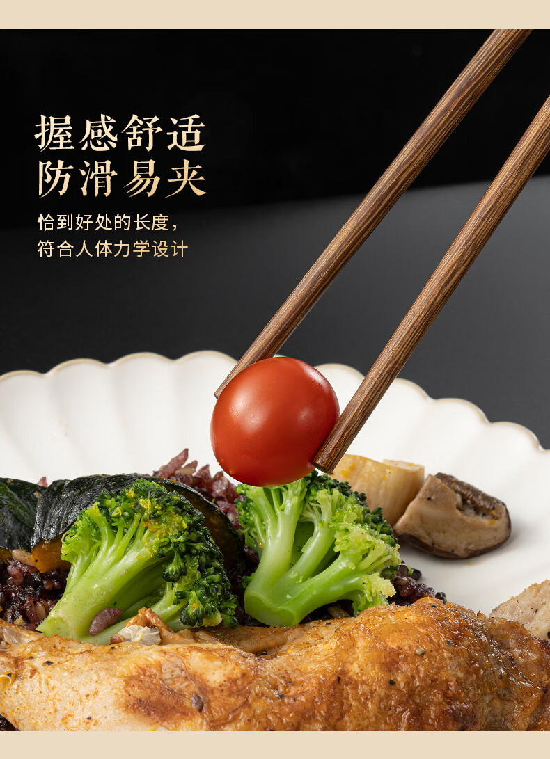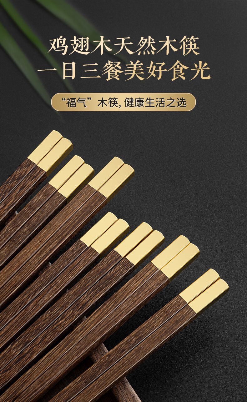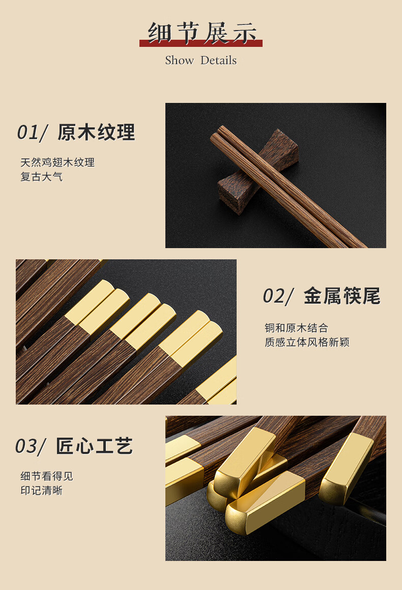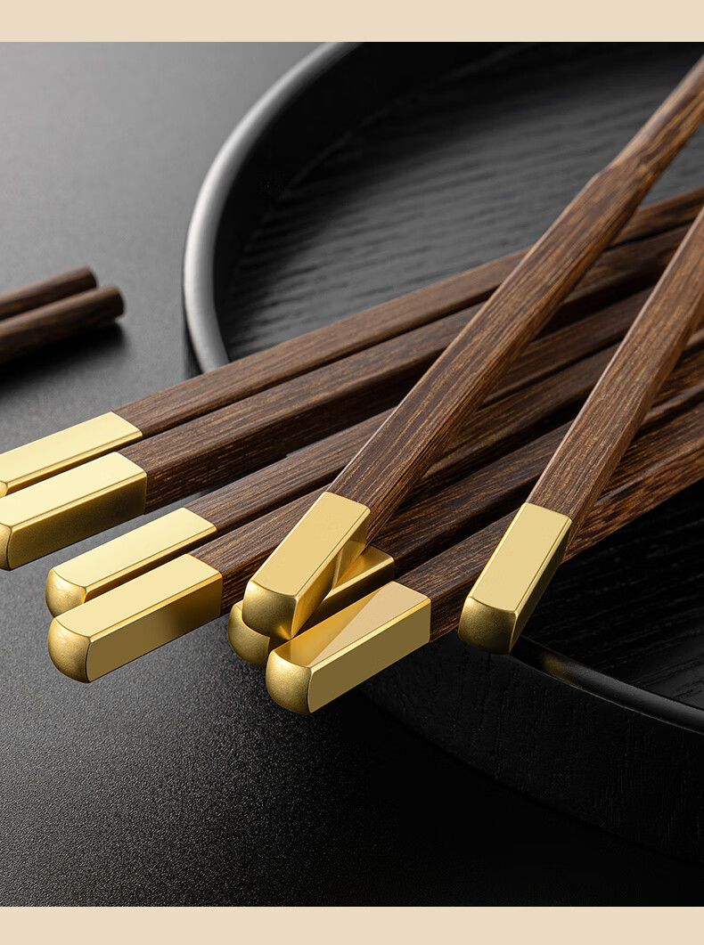 千年恋木高档铜头天然筷子家用中华筷实木防滑无漆无蜡抗菌防霉 25cm鸡翅木铜头【10双装】