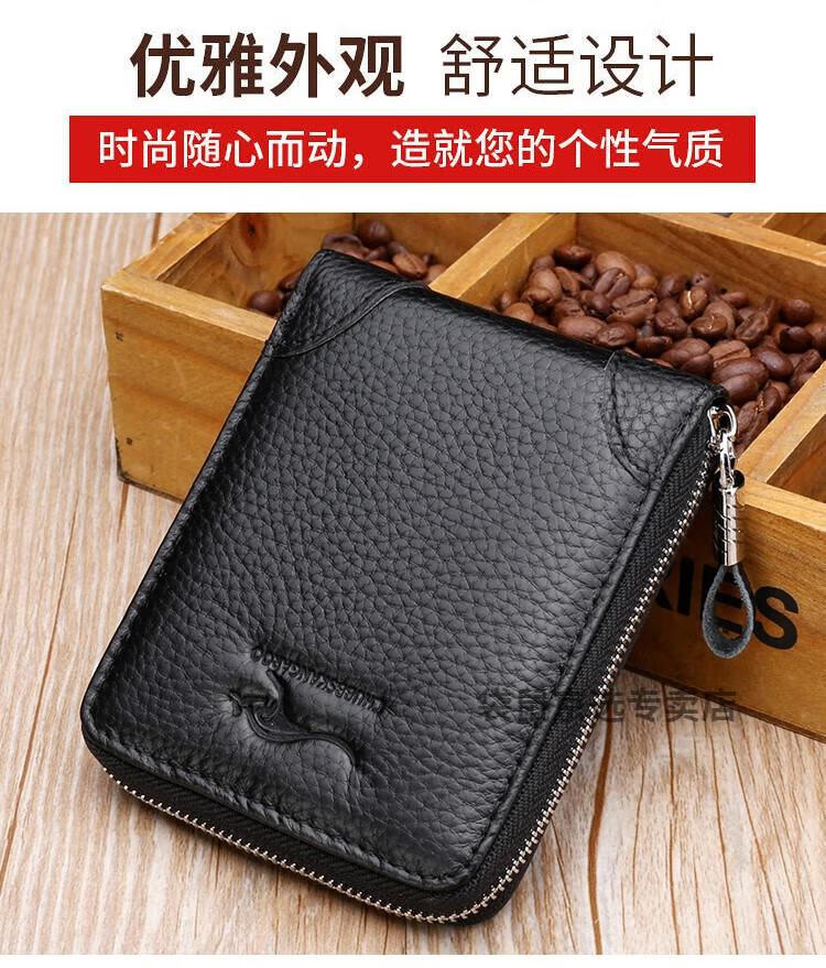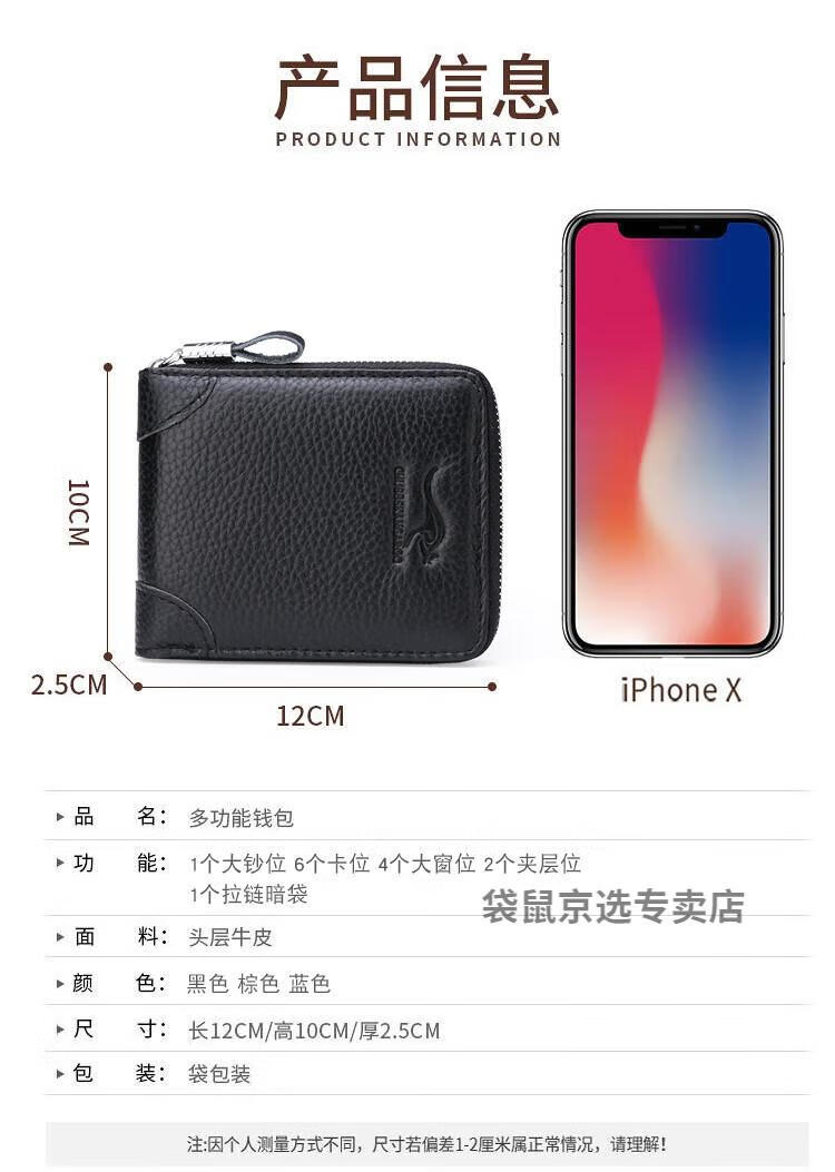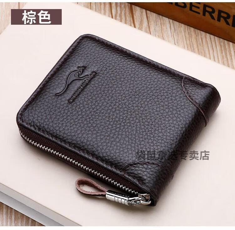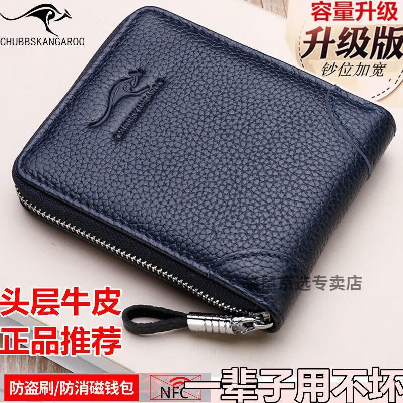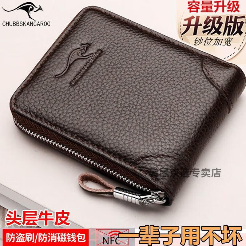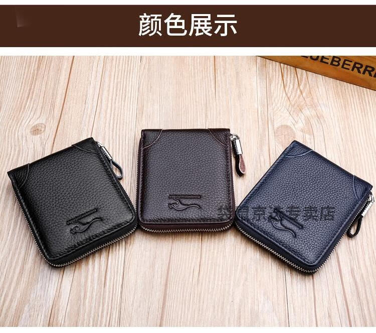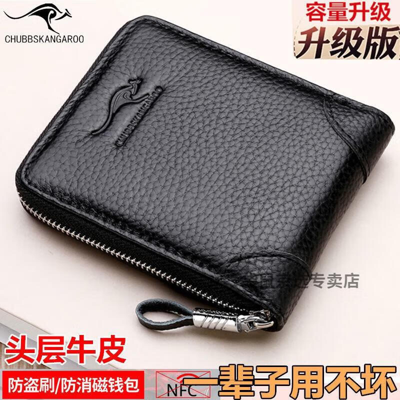 袋鼠轻奢品牌真牛皮钱包男士真皮防盗刷拉链卡包头层软牛皮男式短款钱 黑色