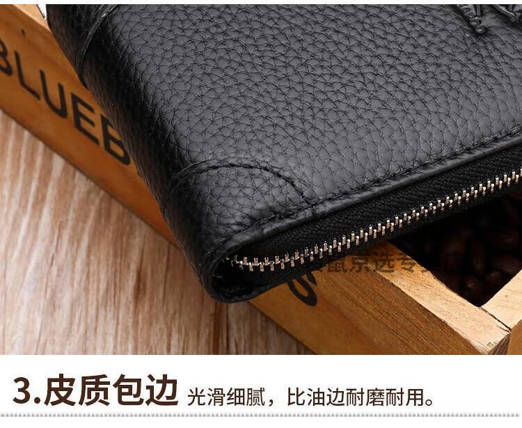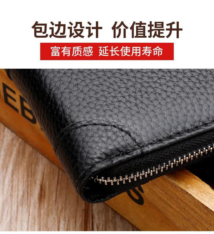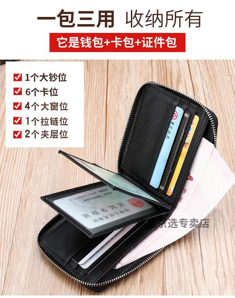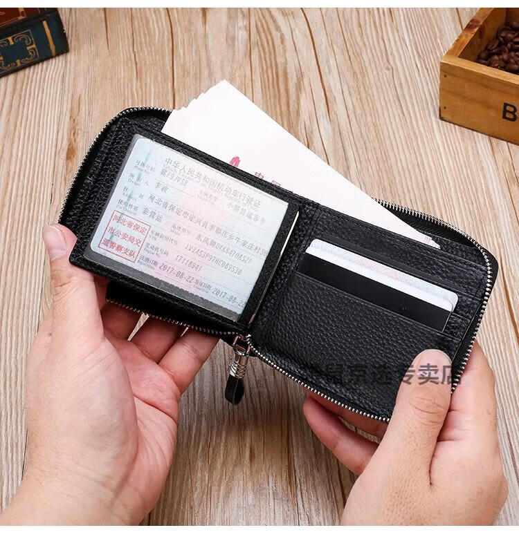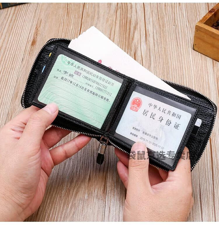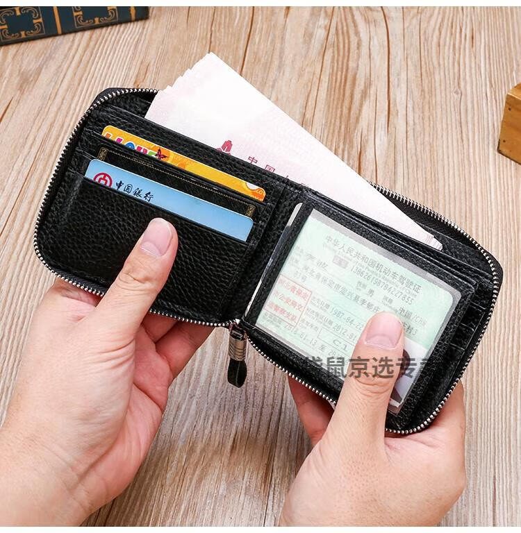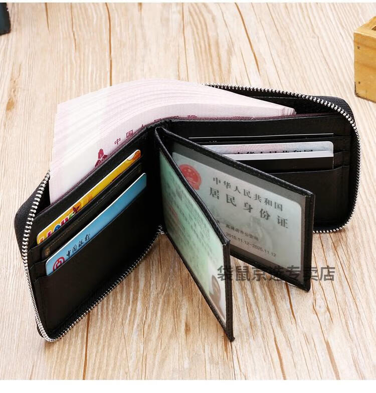 袋鼠轻奢品牌真牛皮钱包男士真皮防盗刷拉链卡包头层软牛皮男式短款钱 黑色