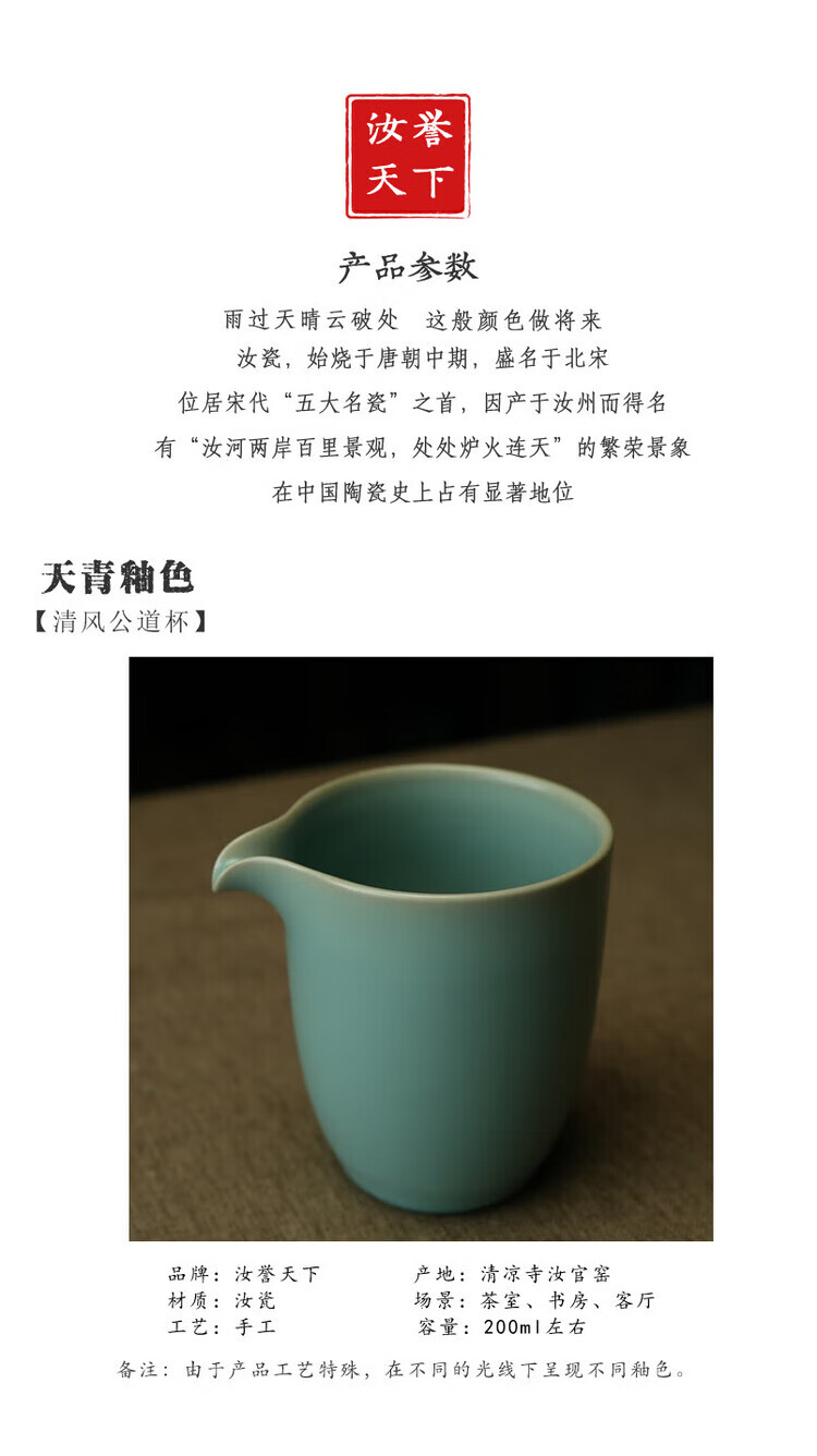 汝誉天下汝窑茶杯公道杯直口公杯清凉寺汝瓷汝州纯手工天青冰裂纹开片 清风公杯(清凉寺汝官窑)