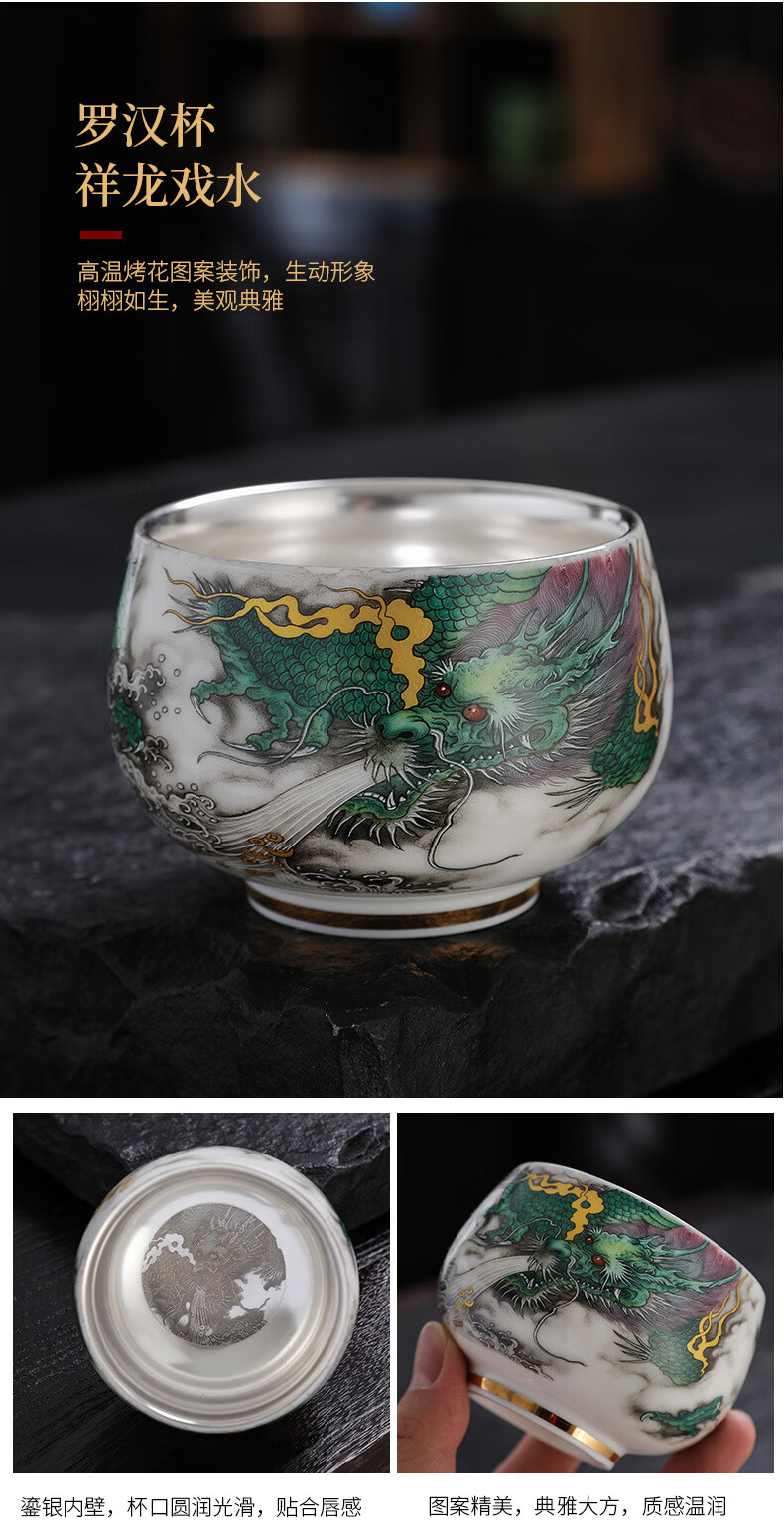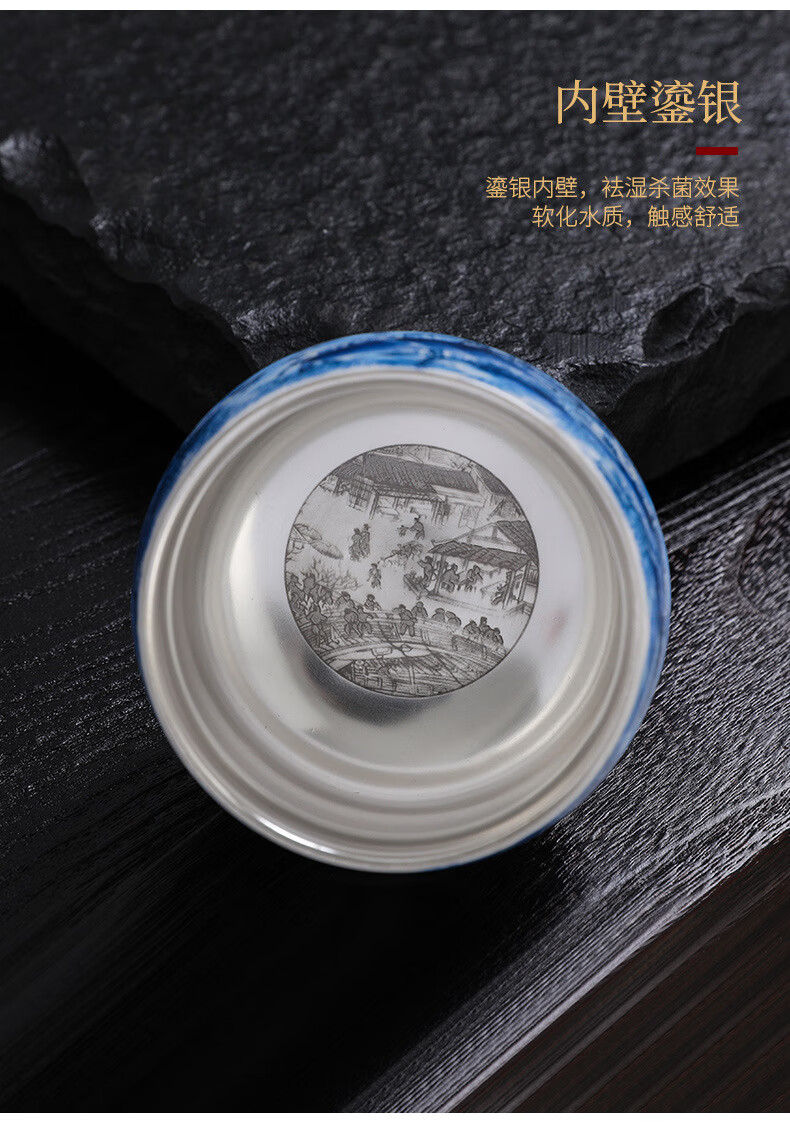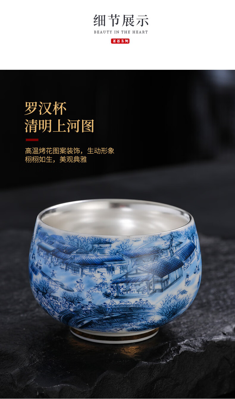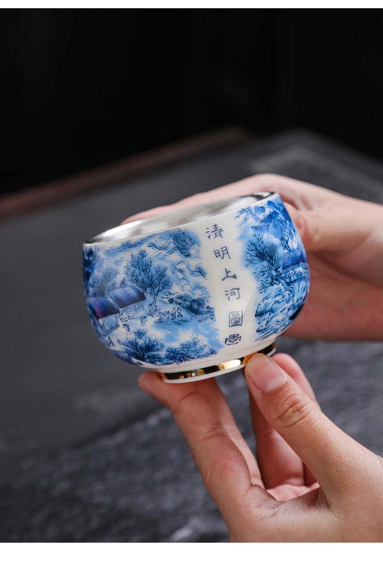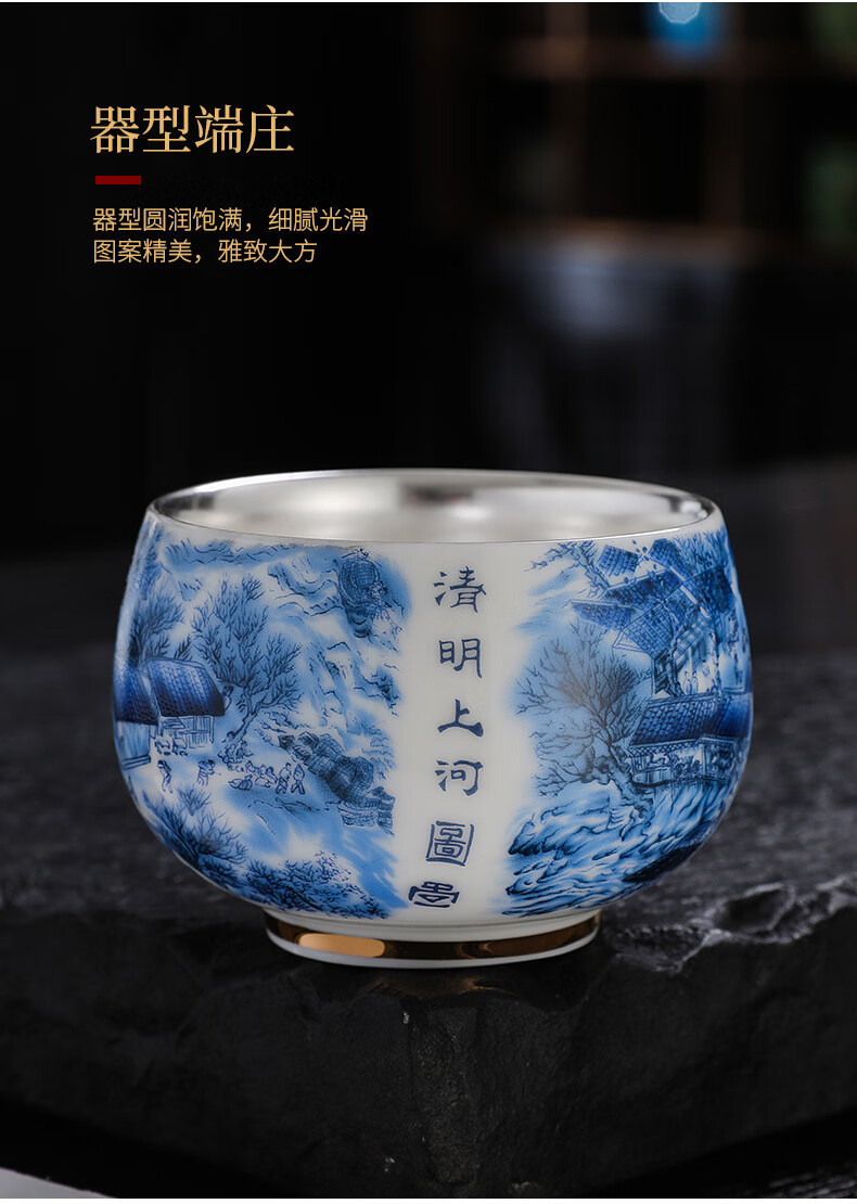 青天问月主人杯单杯鎏银杯999纯银包银陶瓷功夫茶具茶杯个人轻奢品茗礼盒 鎏银-白玉将军杯+礼盒 150ML