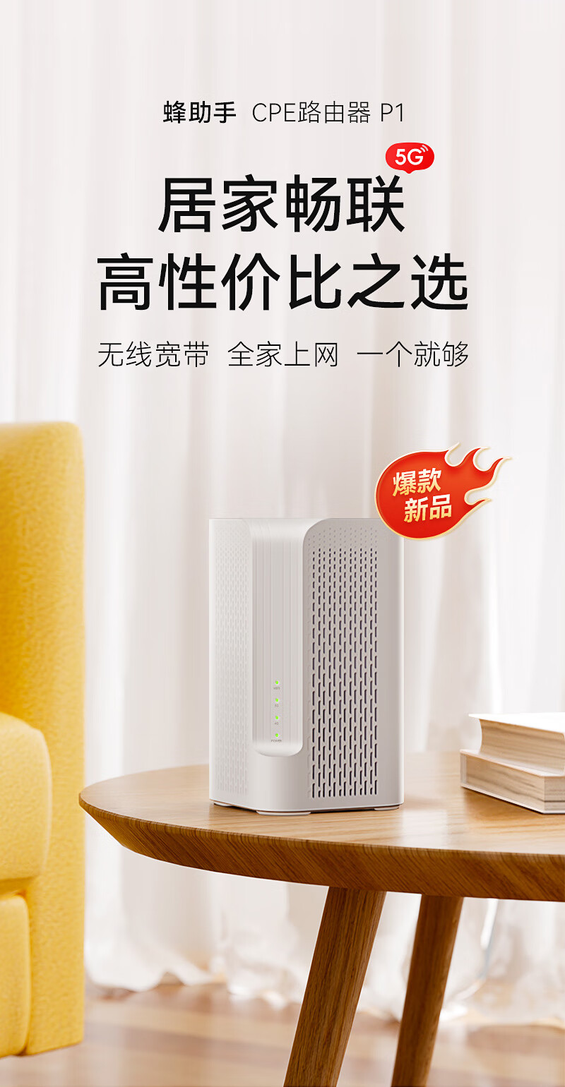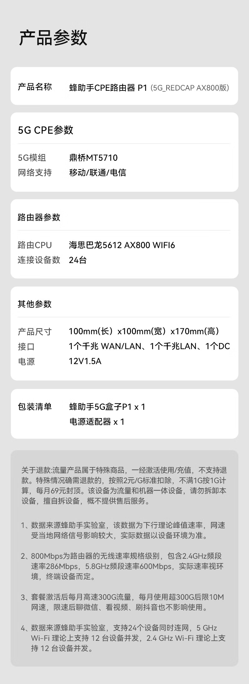 蜂助手5G RedCap CPE路由器P1【轻量级】 家用无线宽带+WiFi6(AX800) 移动随身wifi 无线网卡 P1【含12个月包月流量】