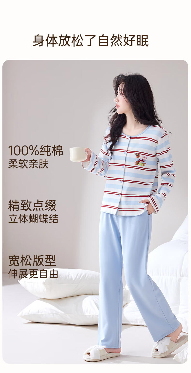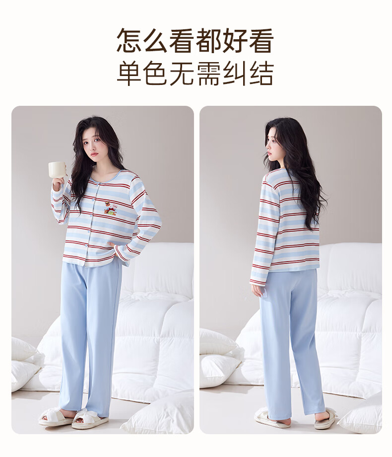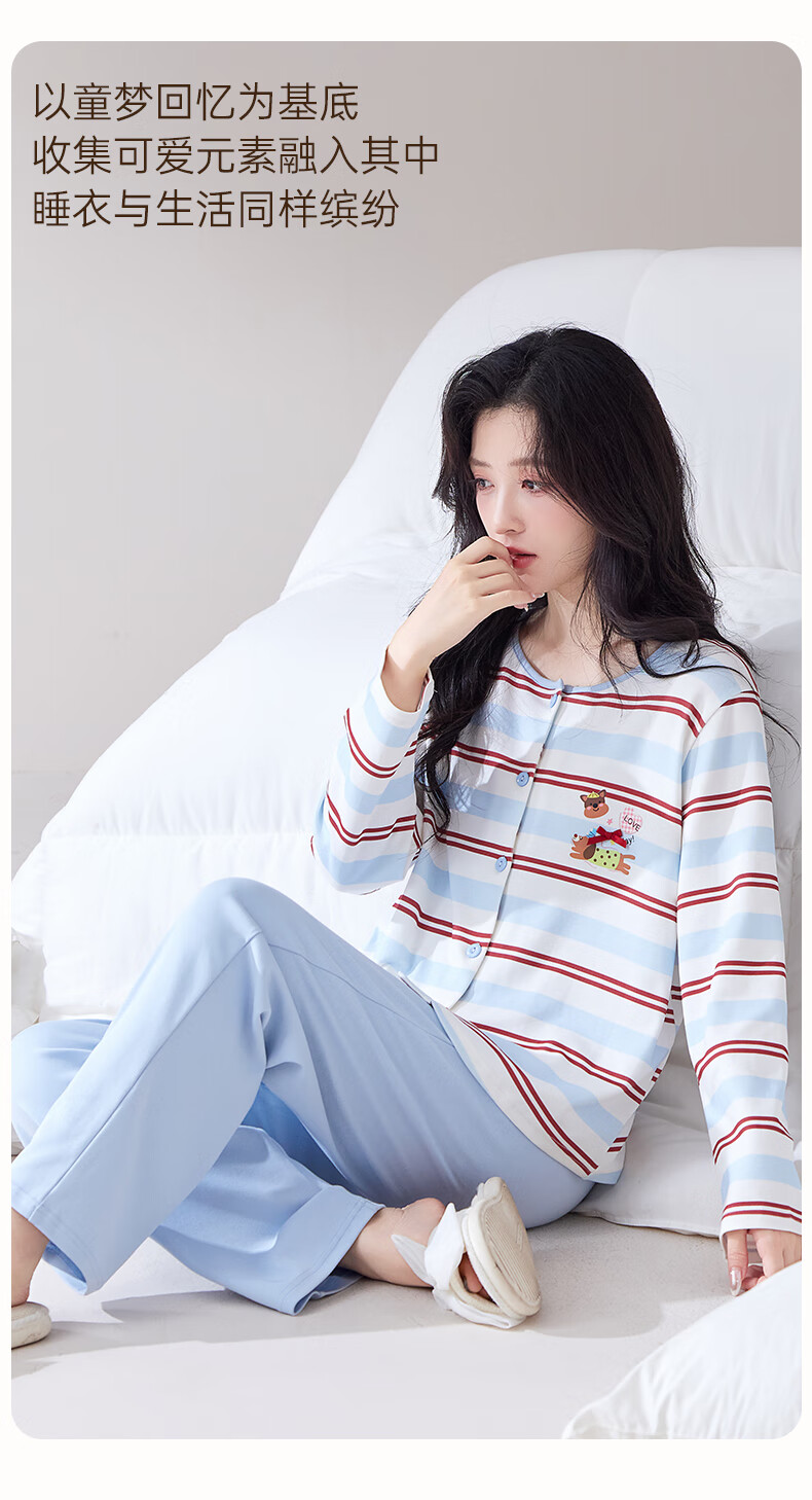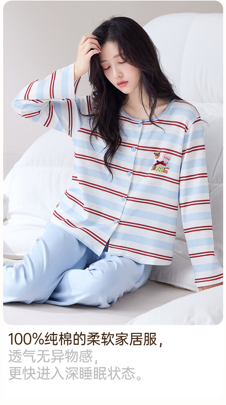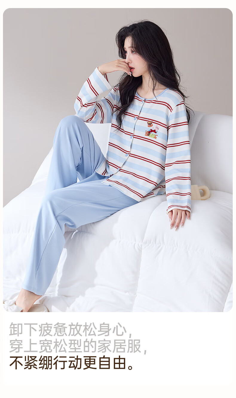 玛伦萨睡衣女纯棉长袖条纹卡通套头圆领可外穿家居服套装 水蓝 M