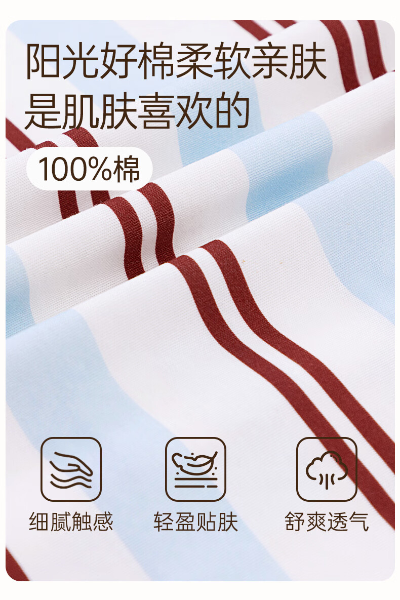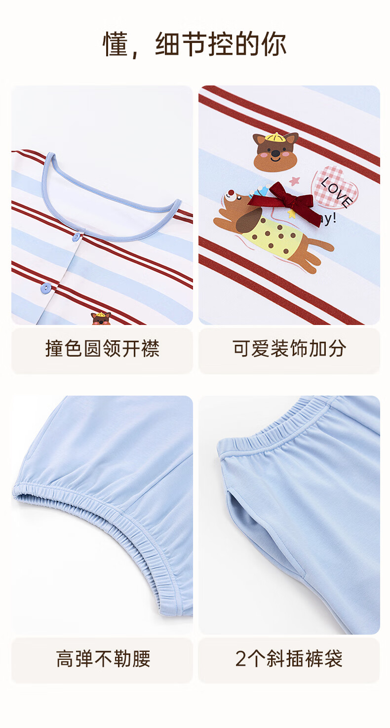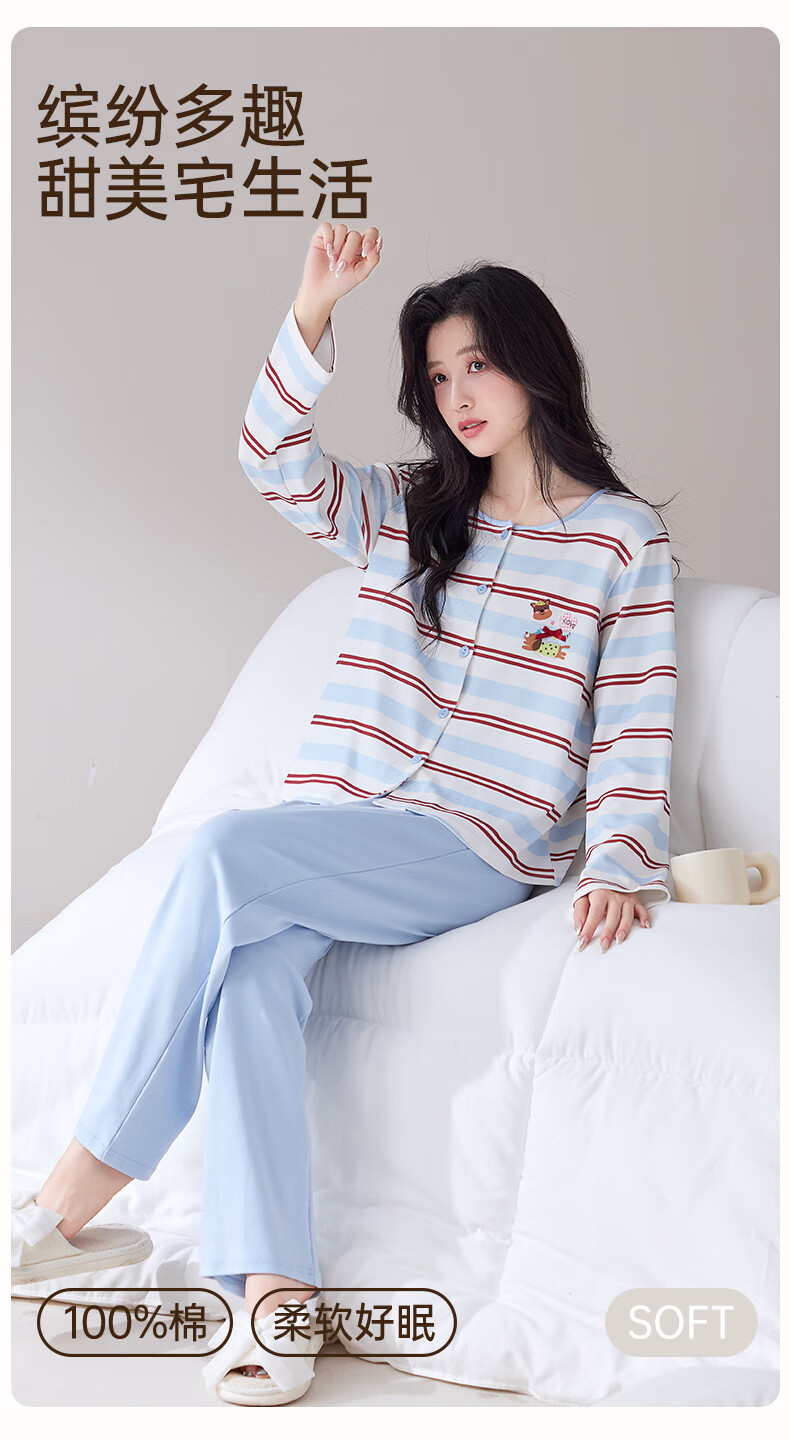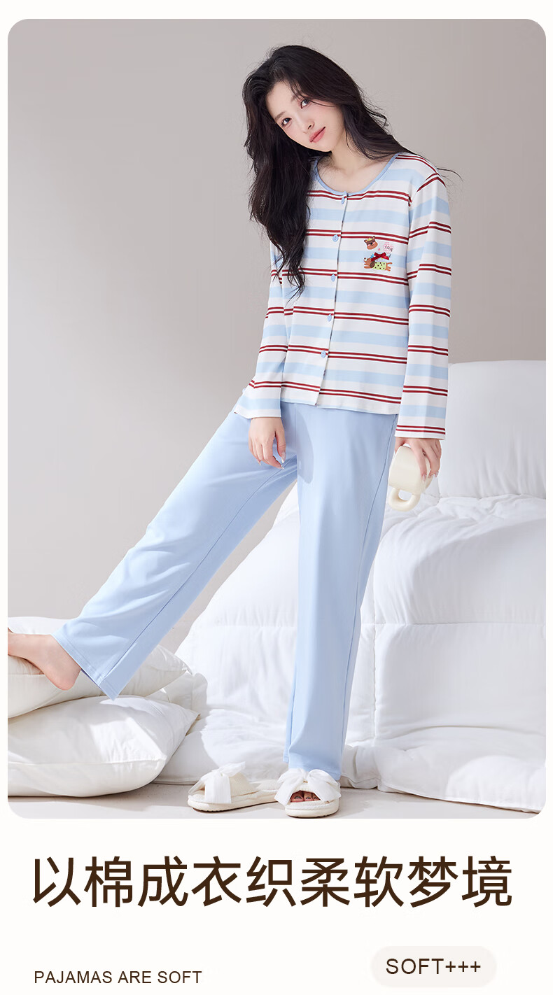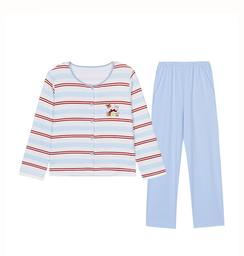 玛伦萨睡衣女纯棉长袖条纹卡通套头圆领可外穿家居服套装 水蓝 M
