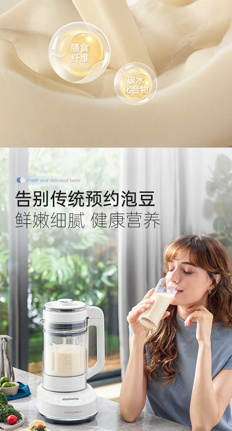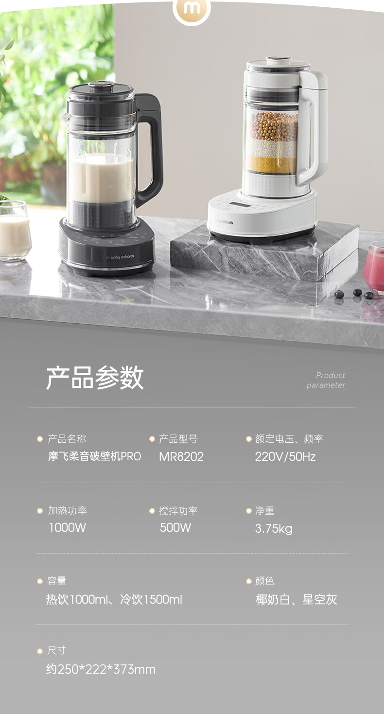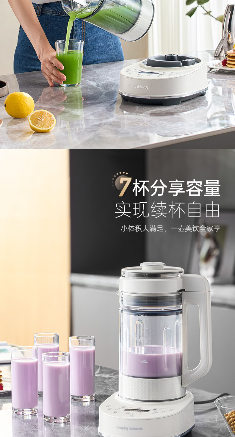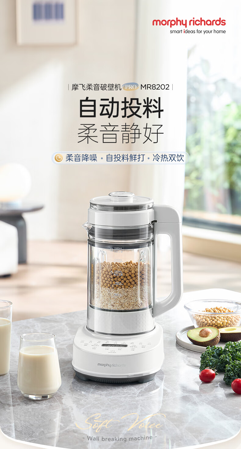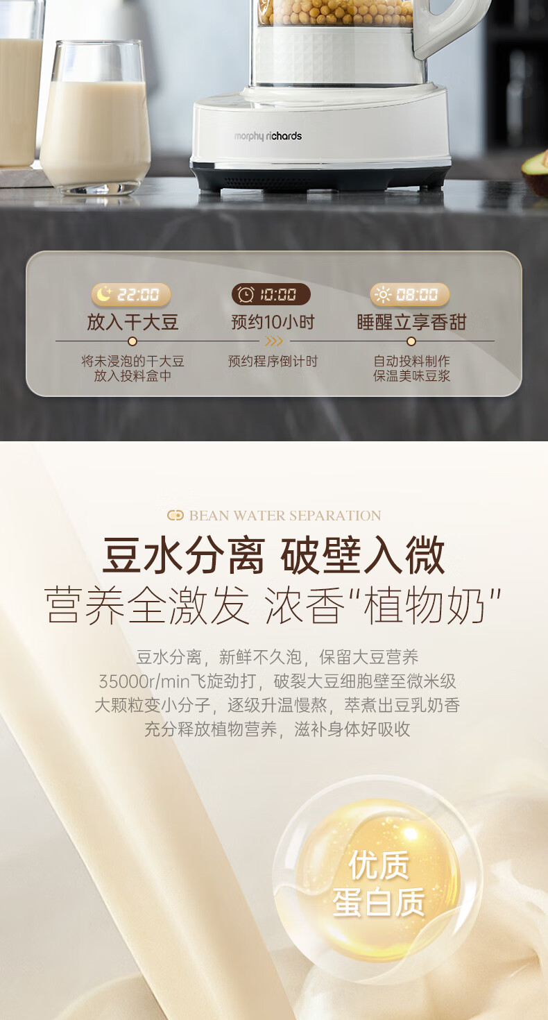 摩飞电器(Morphyrichards)低音破壁机家用全自动豆浆机水豆分离免煮免泡料理机变频降噪预约保温大容量榨汁机MR8202 MR8202A椰奶白【不锈钢内盖】