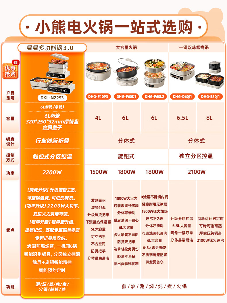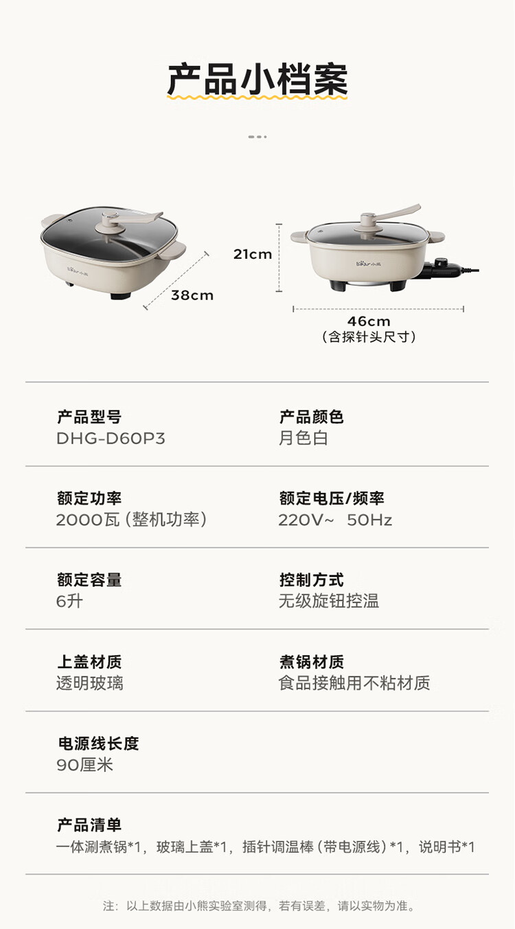 小熊(Bear)火锅专用锅 电火锅 电锅一体多功能锅家用电热锅料理涮煮肉锅具2000W猛火DHG-D60P3 6L